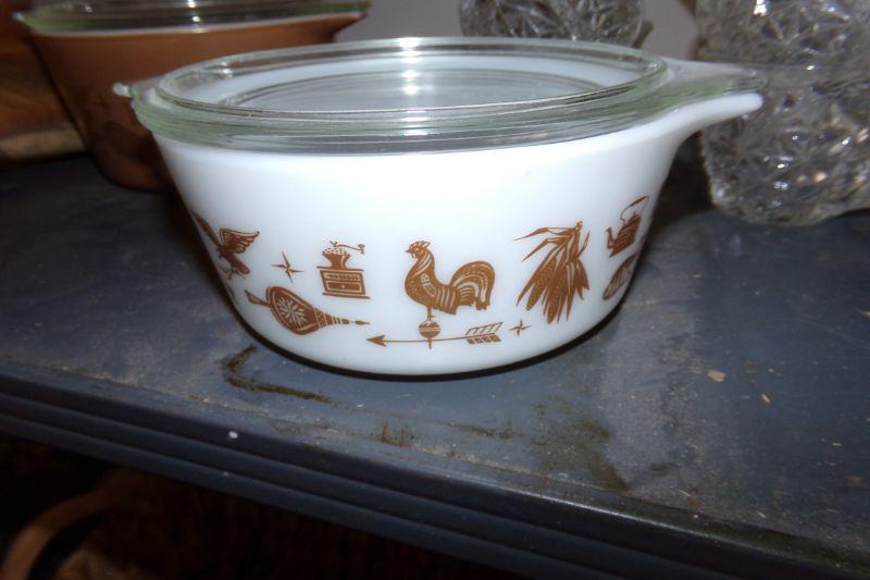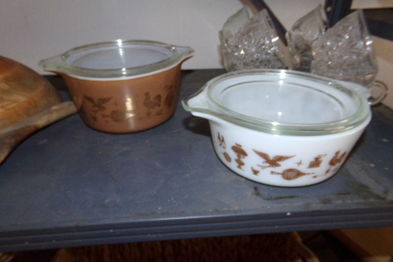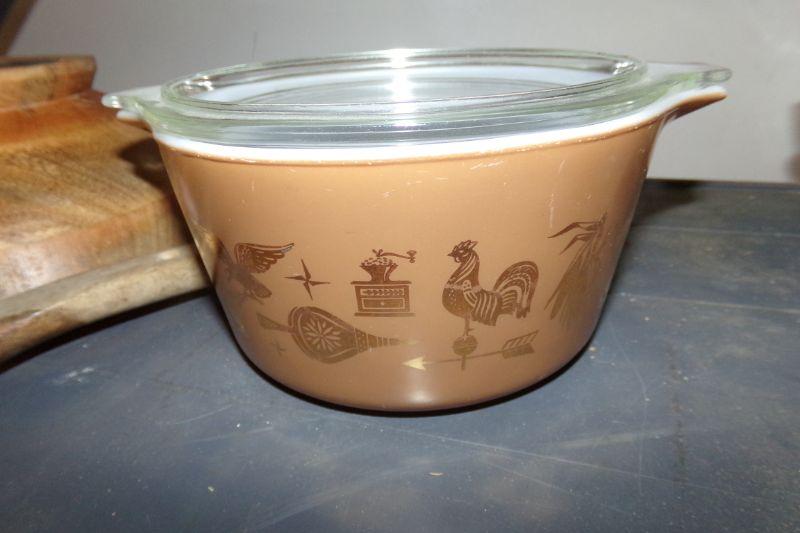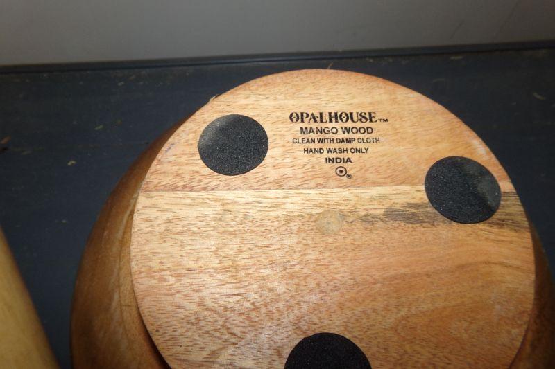 MANGO WOOD BOWL W/ENAMEL INSIDE, 2 CORNING WARE CASSEROLE DISHES, ROLLING PIN AND MORE