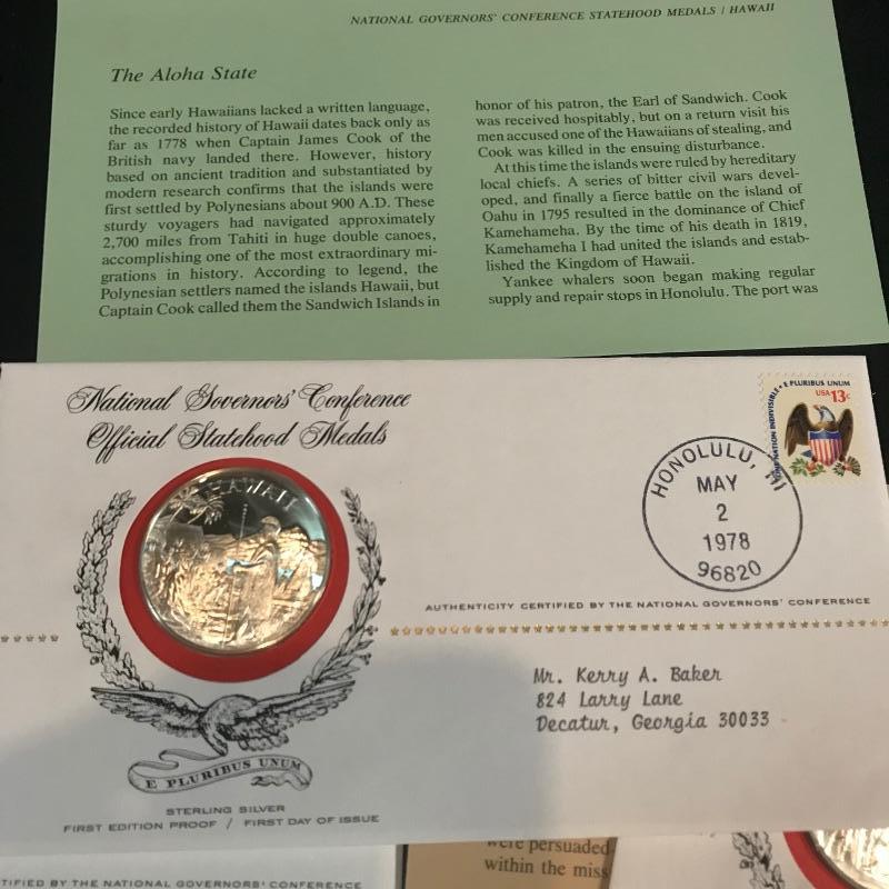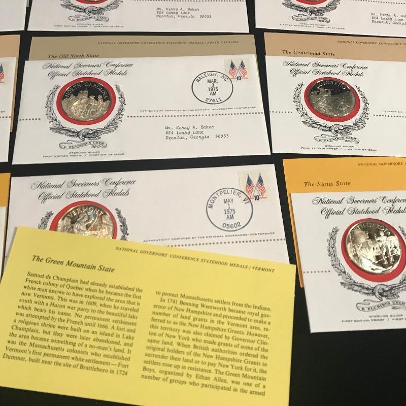 Fifty proof Sterling state medallions from the mid to late 1970s with cancelled first day issues envelopes. All come with backside COA and media regarding each state. See and zoom in on photos for state inventory. All contents appear to have been stored in envelopes shown in photos, some have original sleeves. Starting bid based on silver melt value.