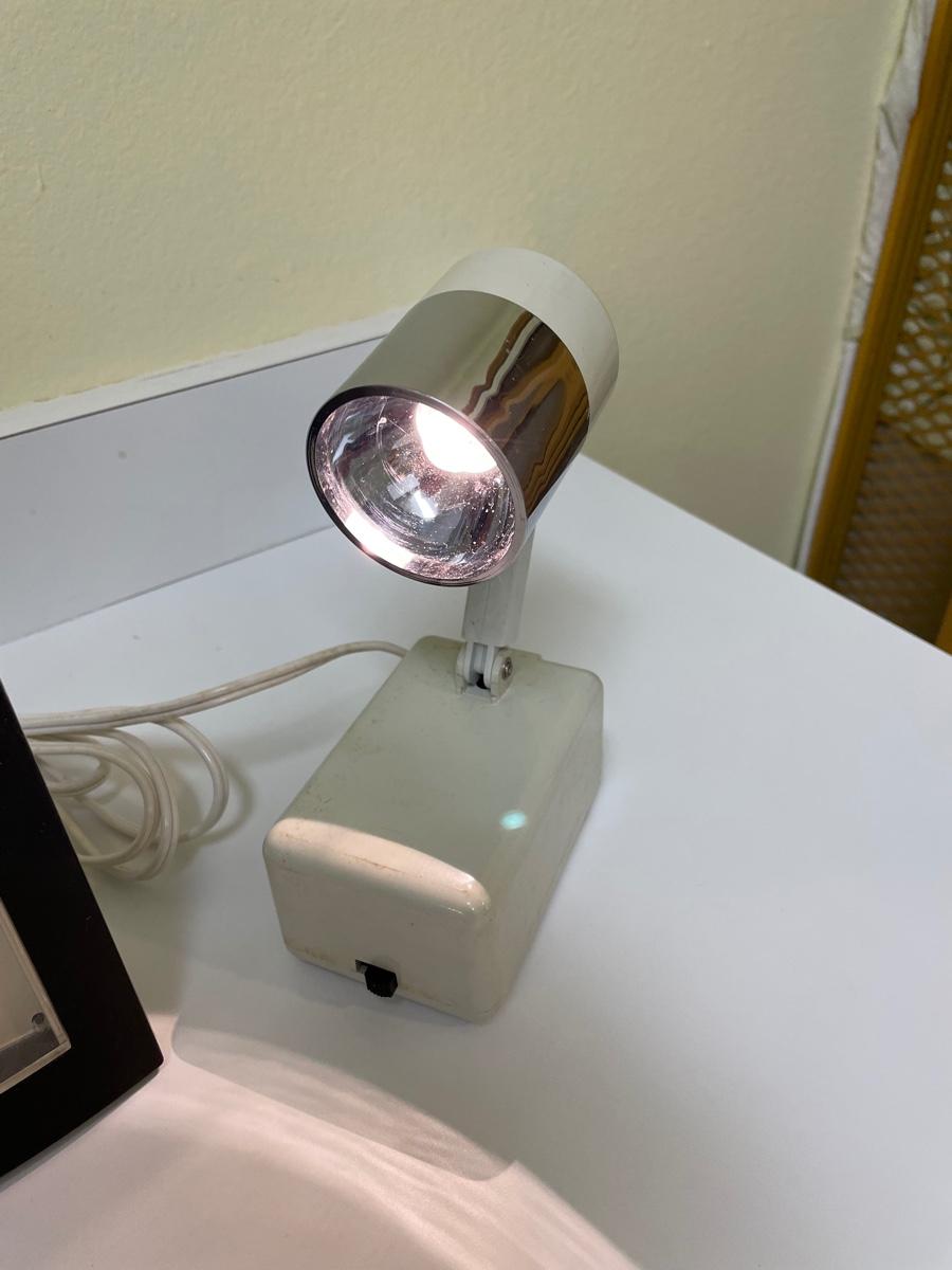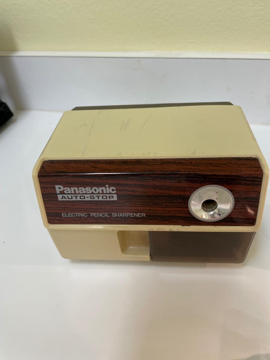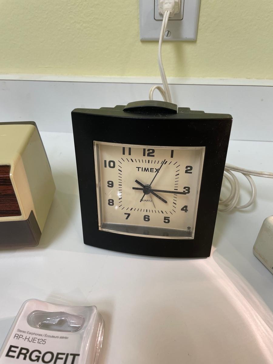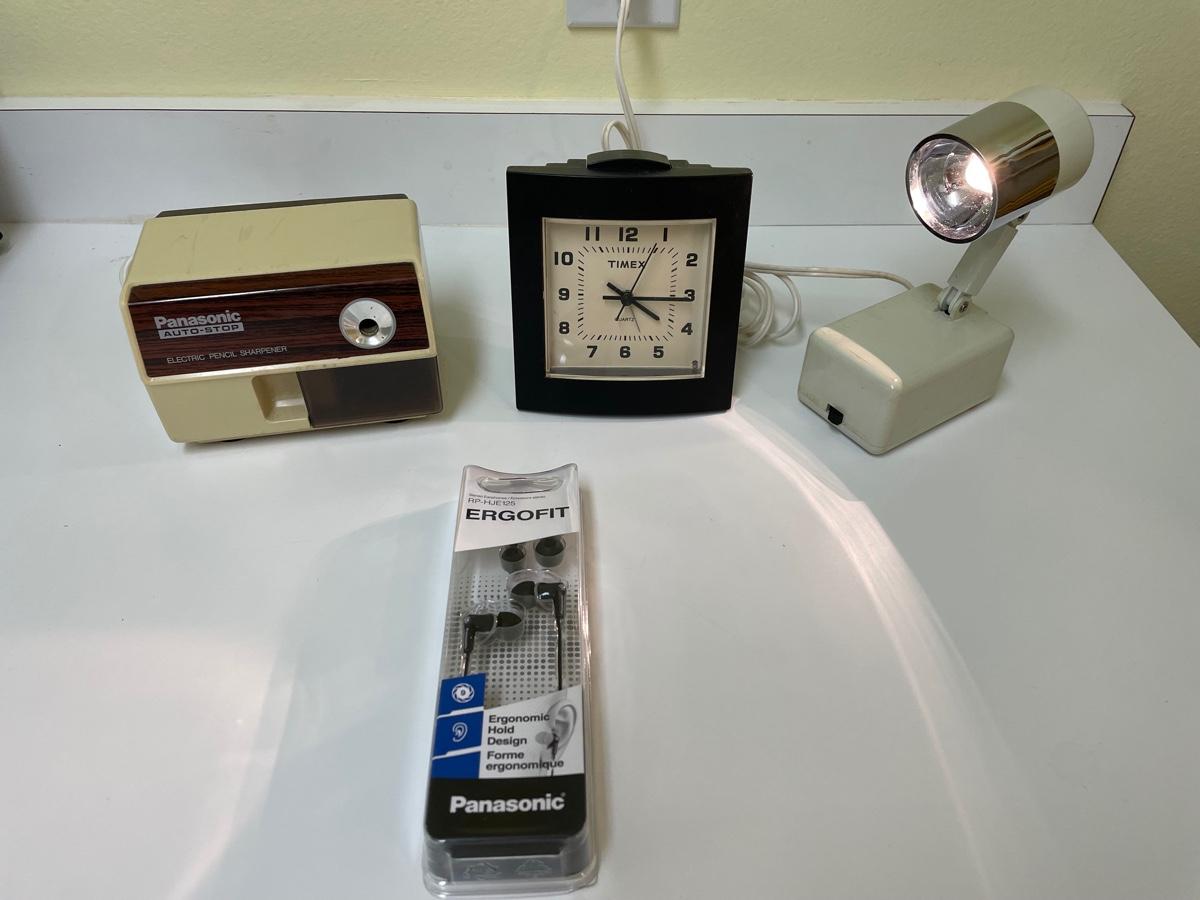 Electric pencil sharpener, analog clock, small task light and new ear buds