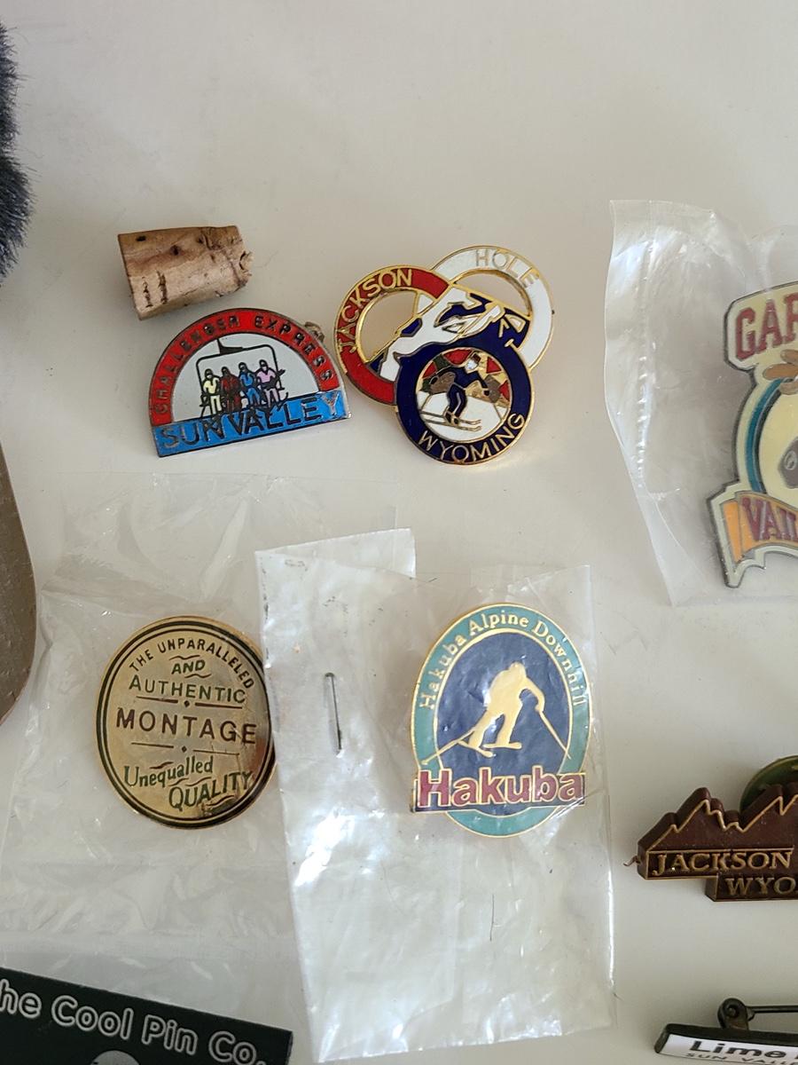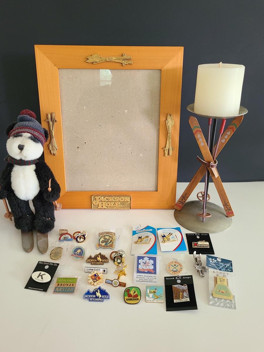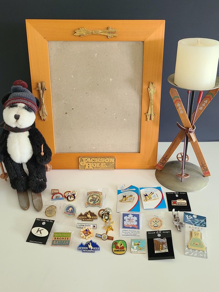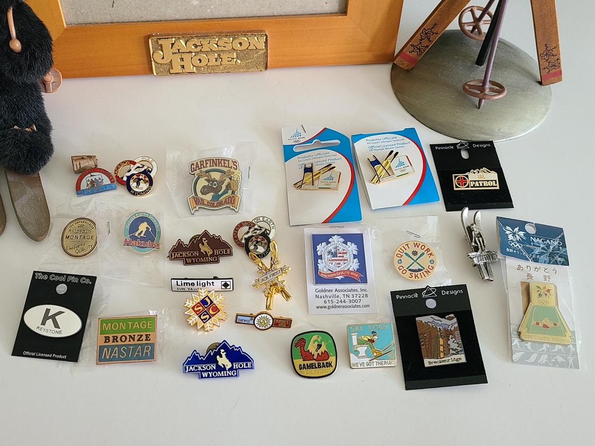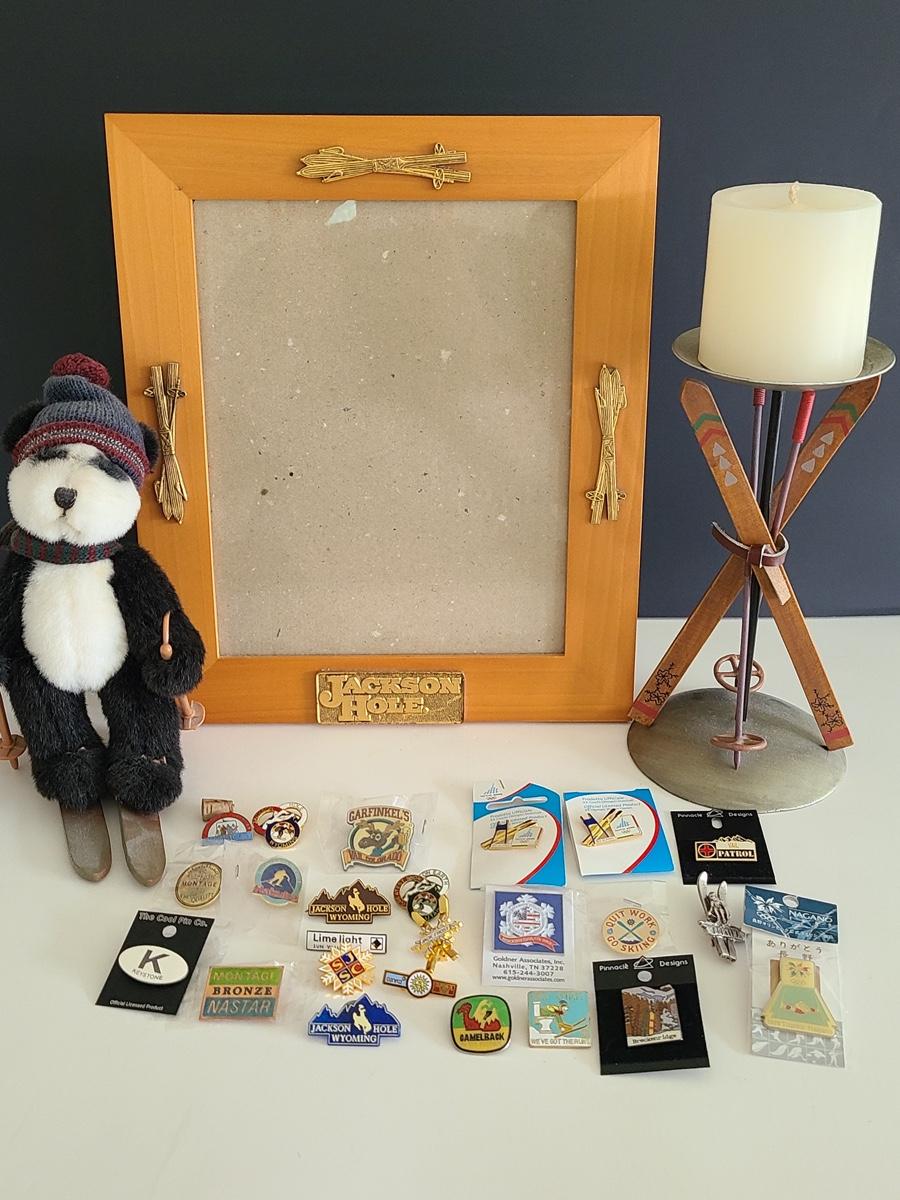 Lot 85: Vintage Collectible Ski Pins, Jackson Hole Ski Frame and More