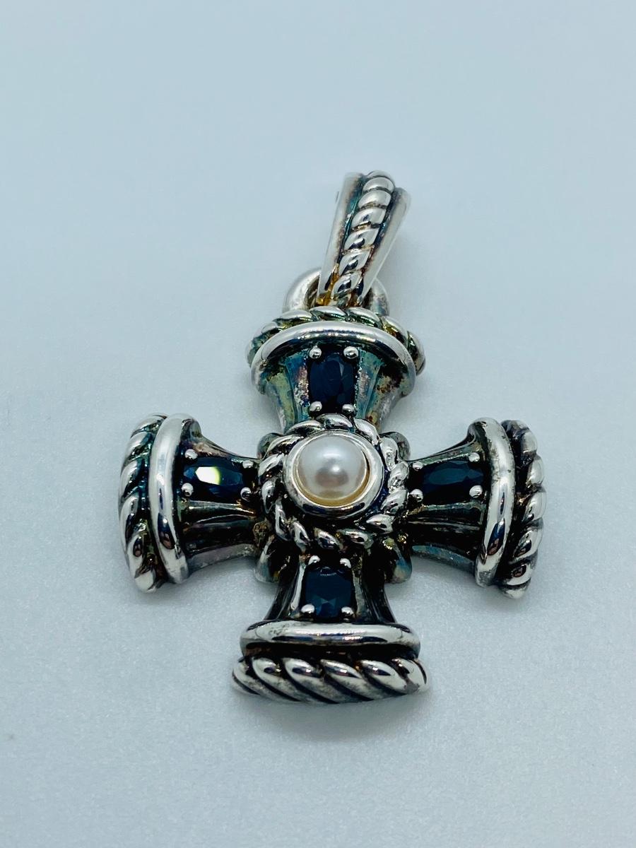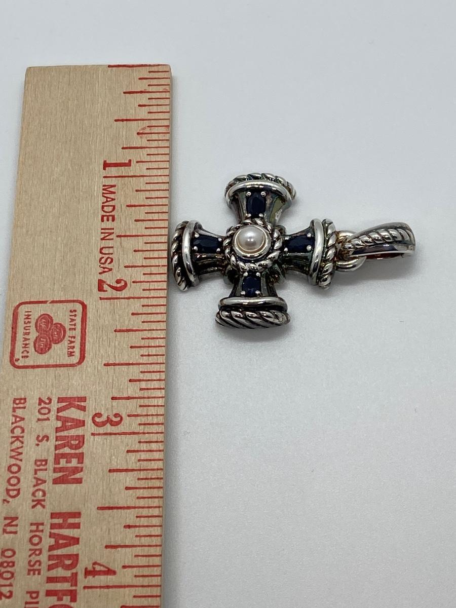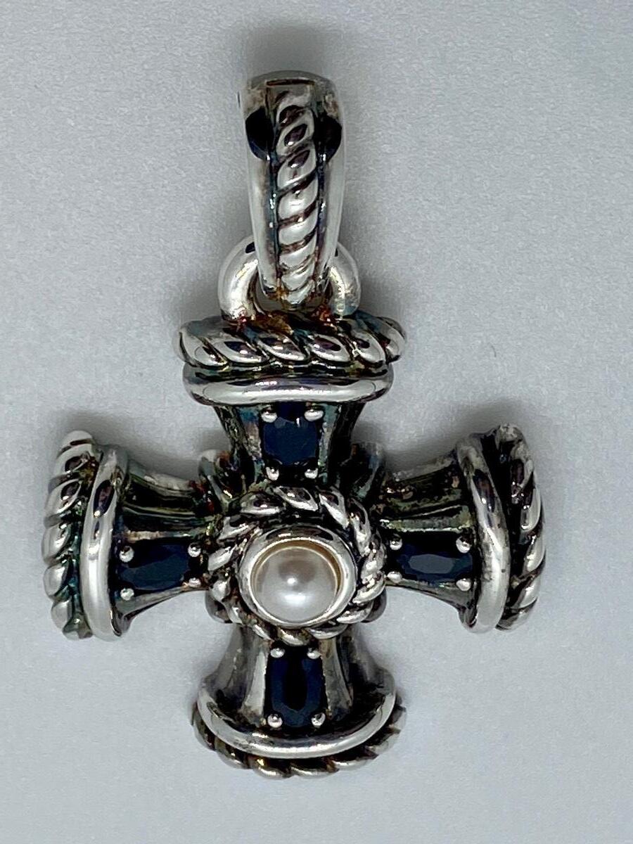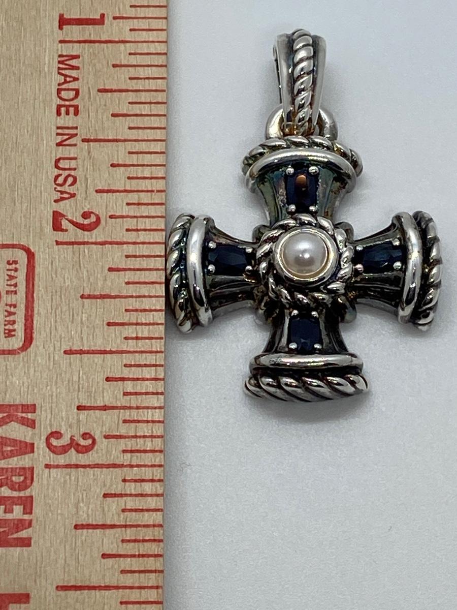 Lot 85: Judith Ripka 925 Blue Sapphire Maltese Cross Pendent /Enhancer w/ Pearl center