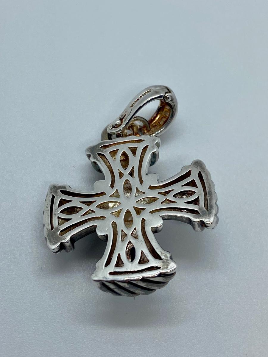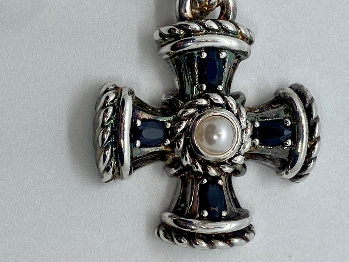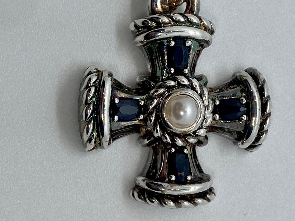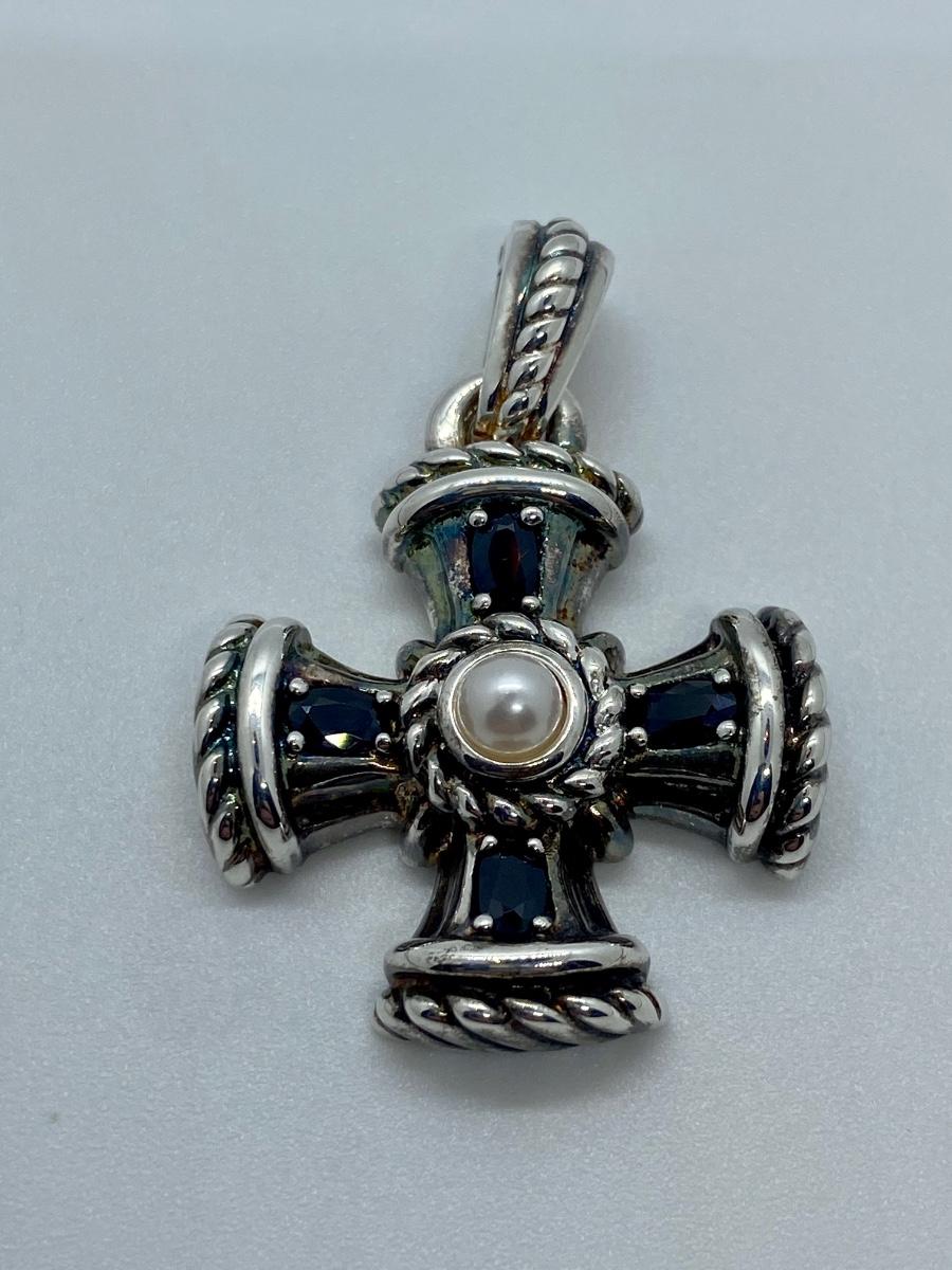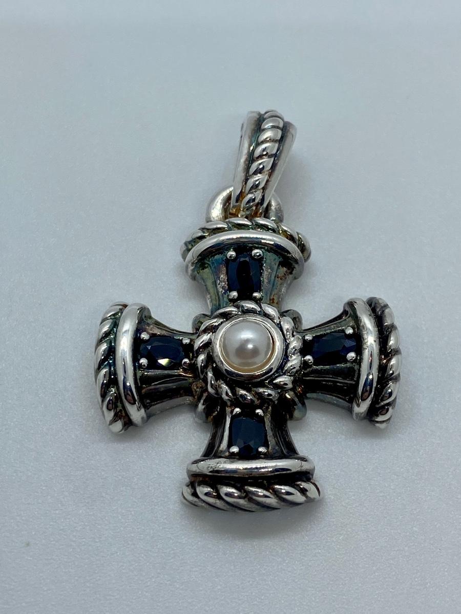 Lot 85: Judith Ripka 925 Blue Sapphire Maltese Cross Pendent /Enhancer w/ Pearl center