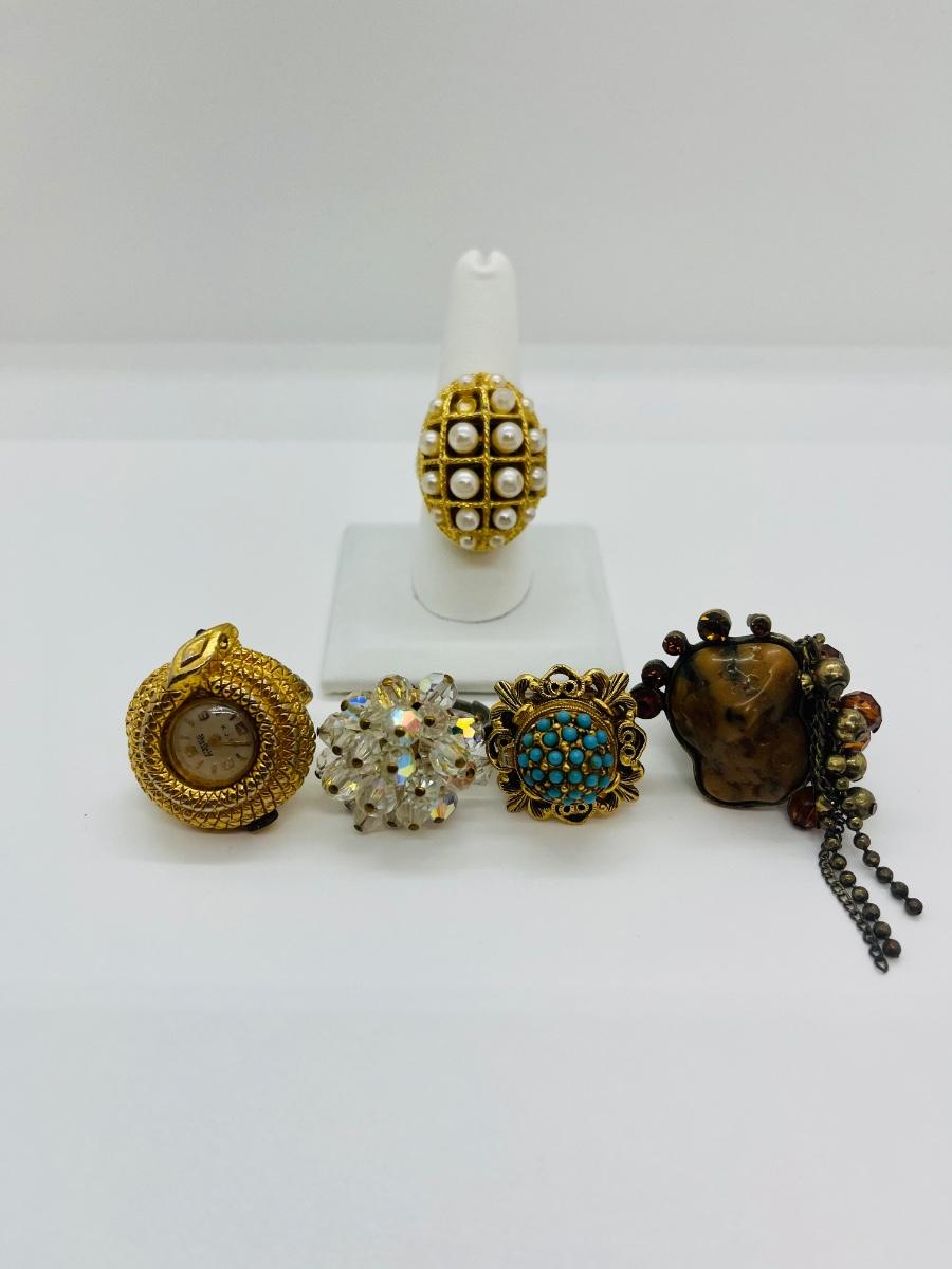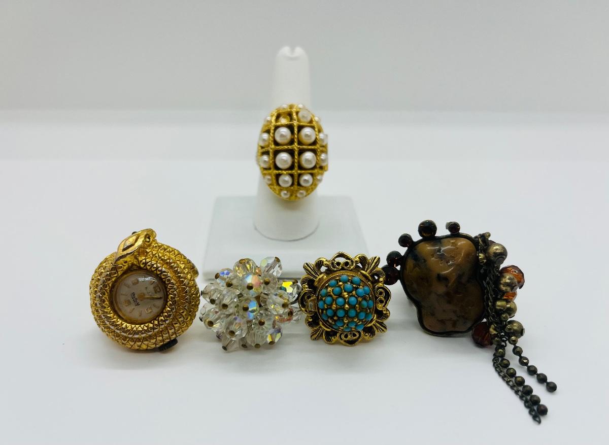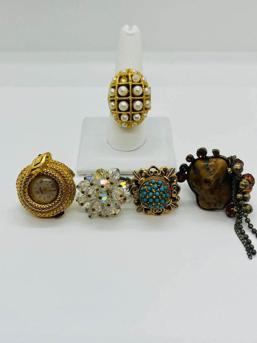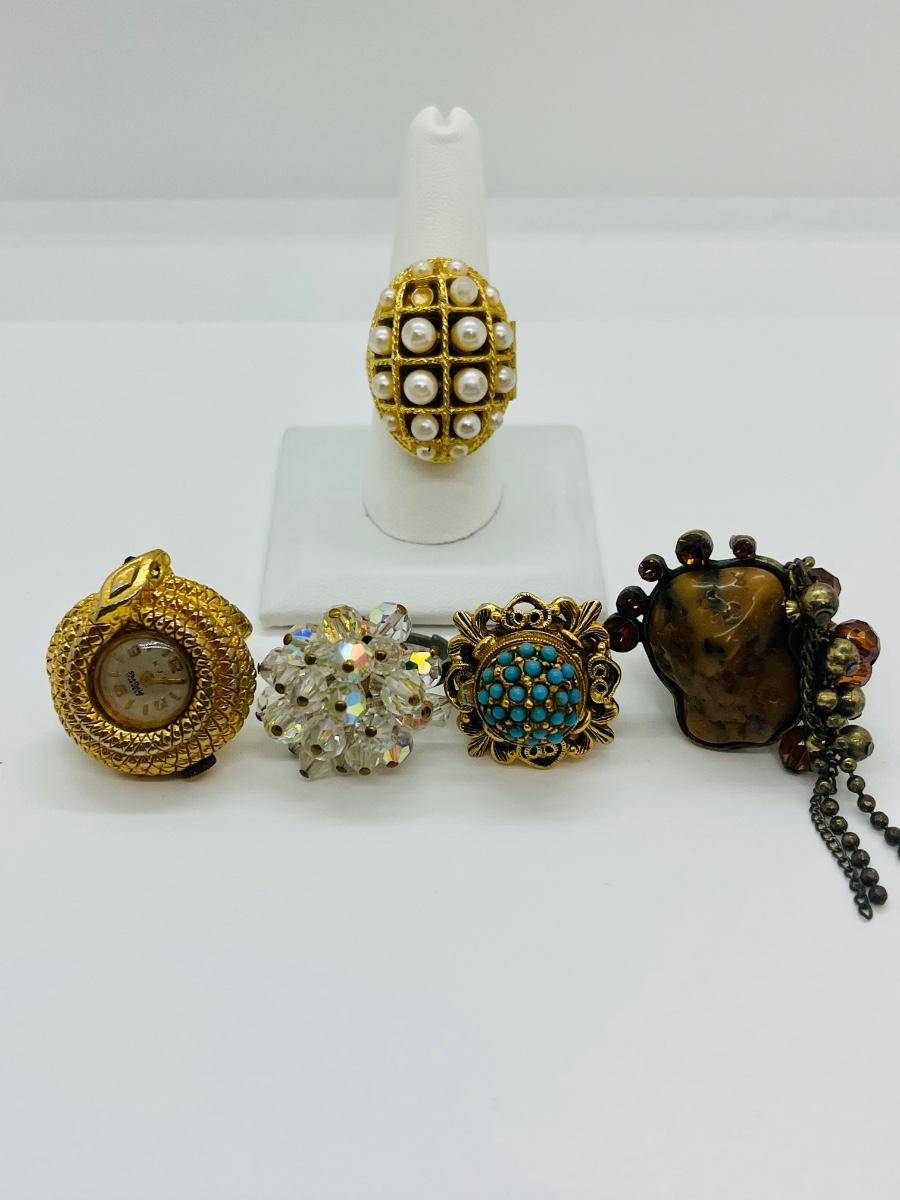 Two rings have hidden compartments, one is missing a pearl, one is Aurora Borealis crystal and the stretch Ring has an embellished natural stone. The pictures show condition, measurements if taken, and what is included in the lot. Due to the large amount that we photograph and the time frame, we are not always able to take measurements. All items unless noted, are pre-owned and have been used, and are untested. Thank you