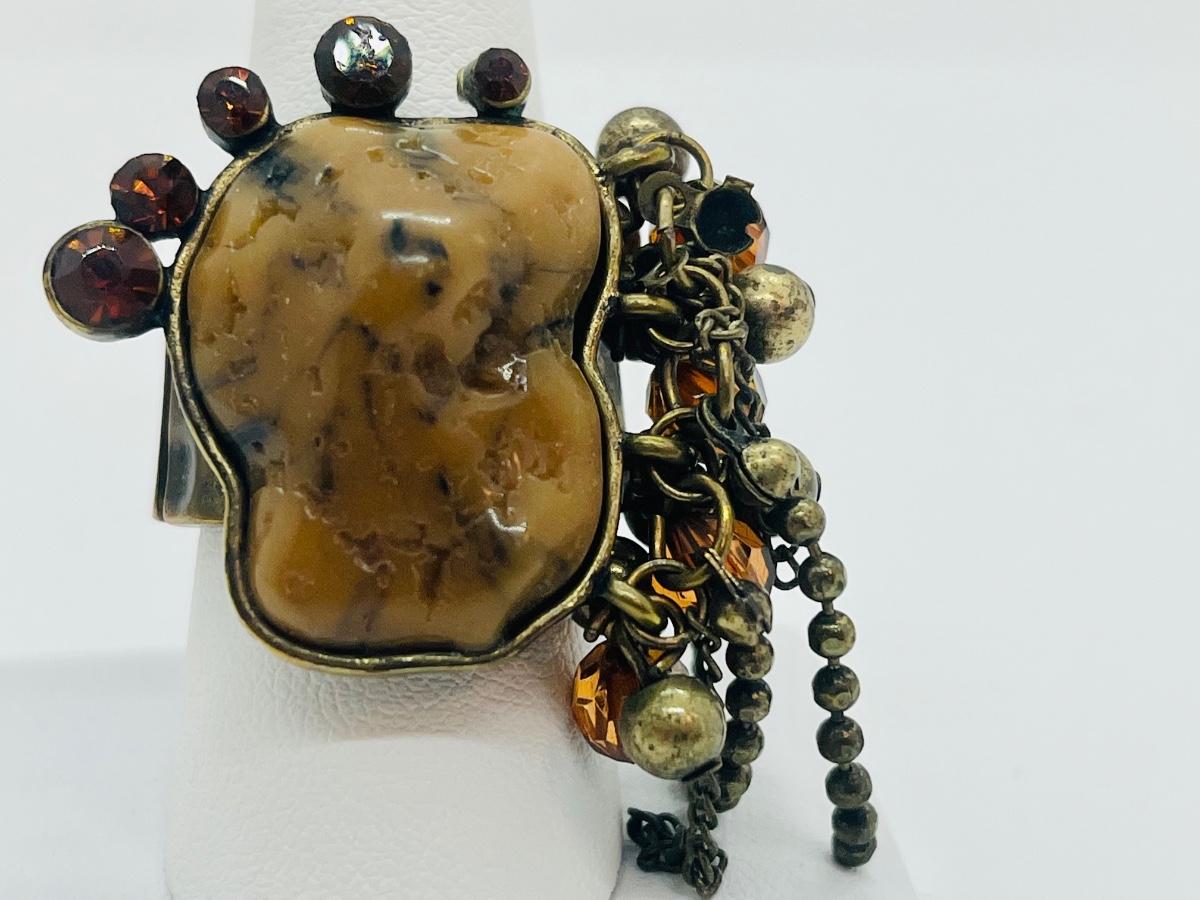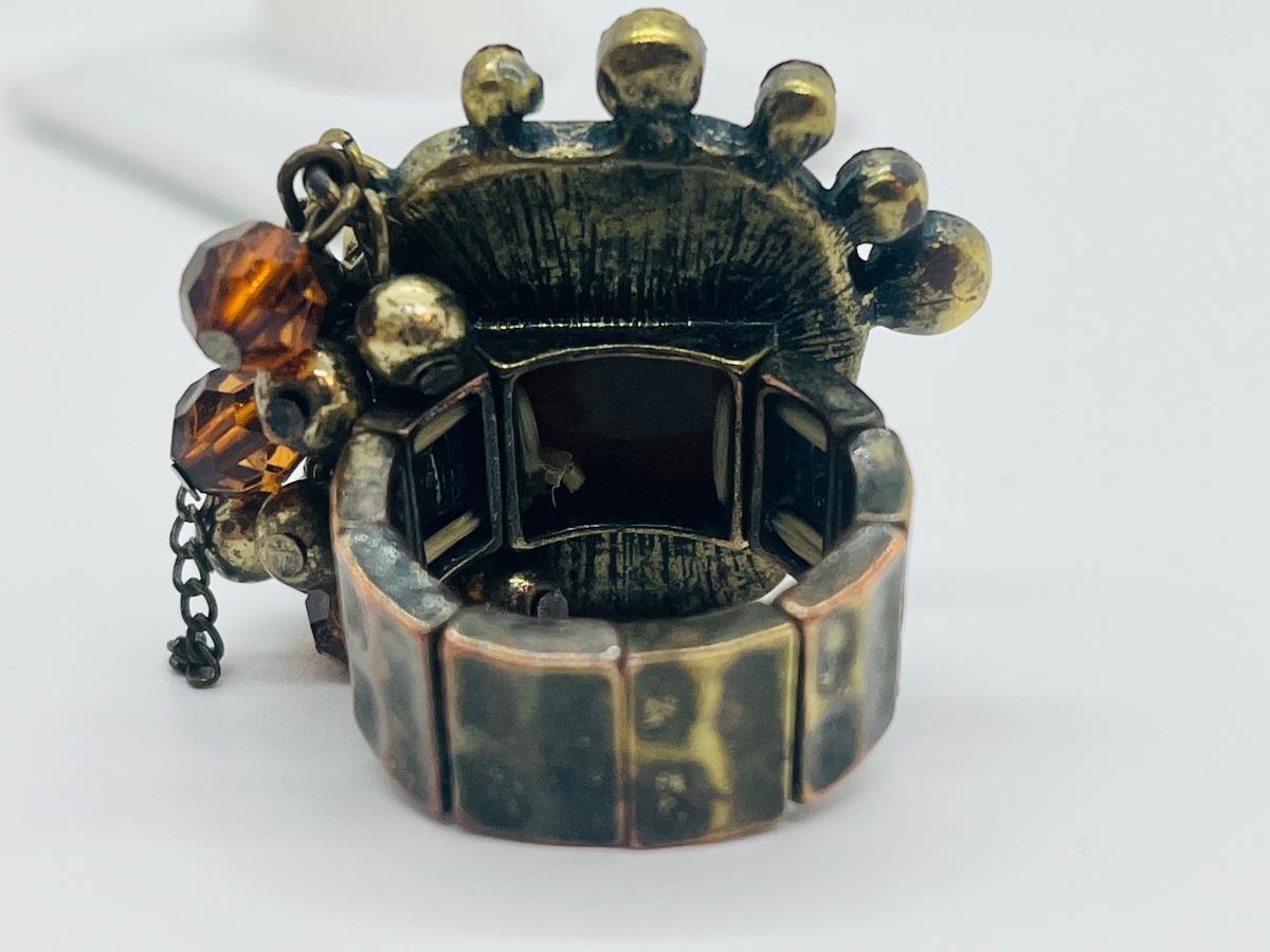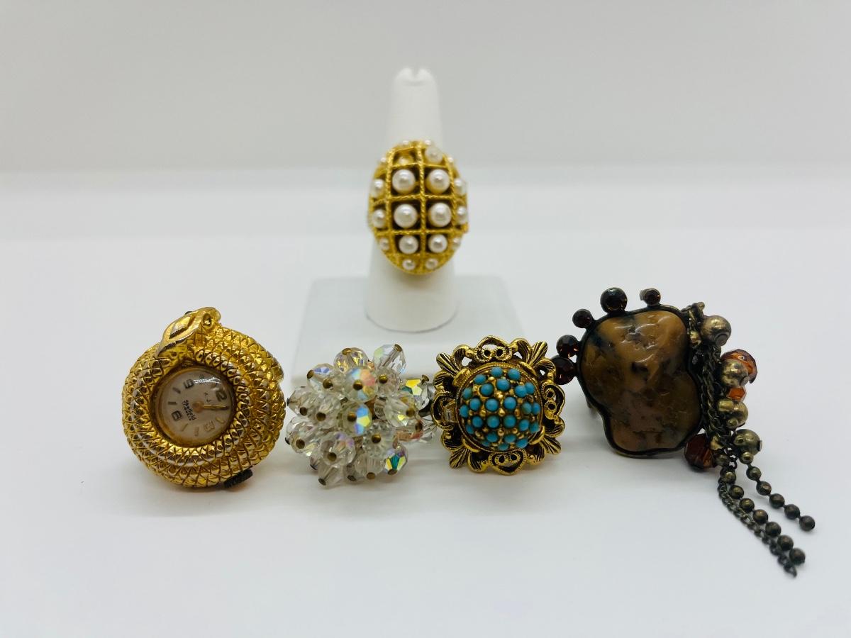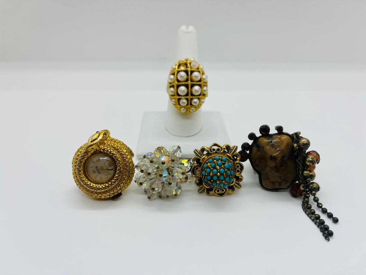 Two rings have hidden compartments, one is missing a pearl, one is Aurora Borealis crystal and the stretch Ring has an embellished natural stone. The pictures show condition, measurements if taken, and what is included in the lot. Due to the large amount that we photograph and the time frame, we are not always able to take measurements. All items unless noted, are pre-owned and have been used, and are untested. Thank you