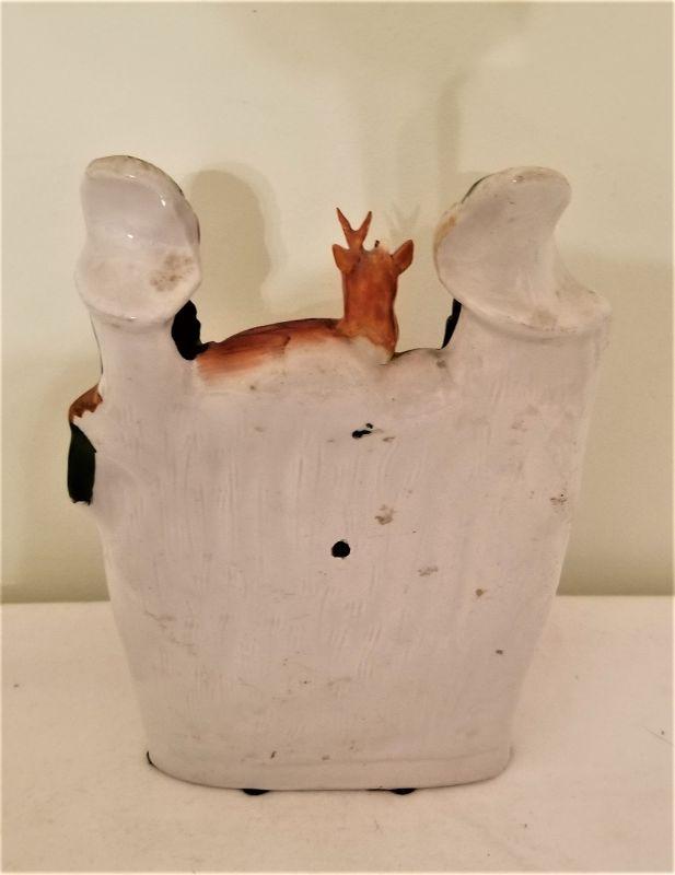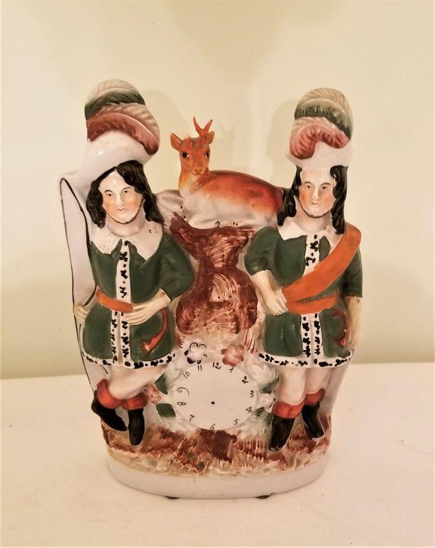 19th Century Staffordshire grouping - two men with clock - note: deer has one broken horn. 9" tall.