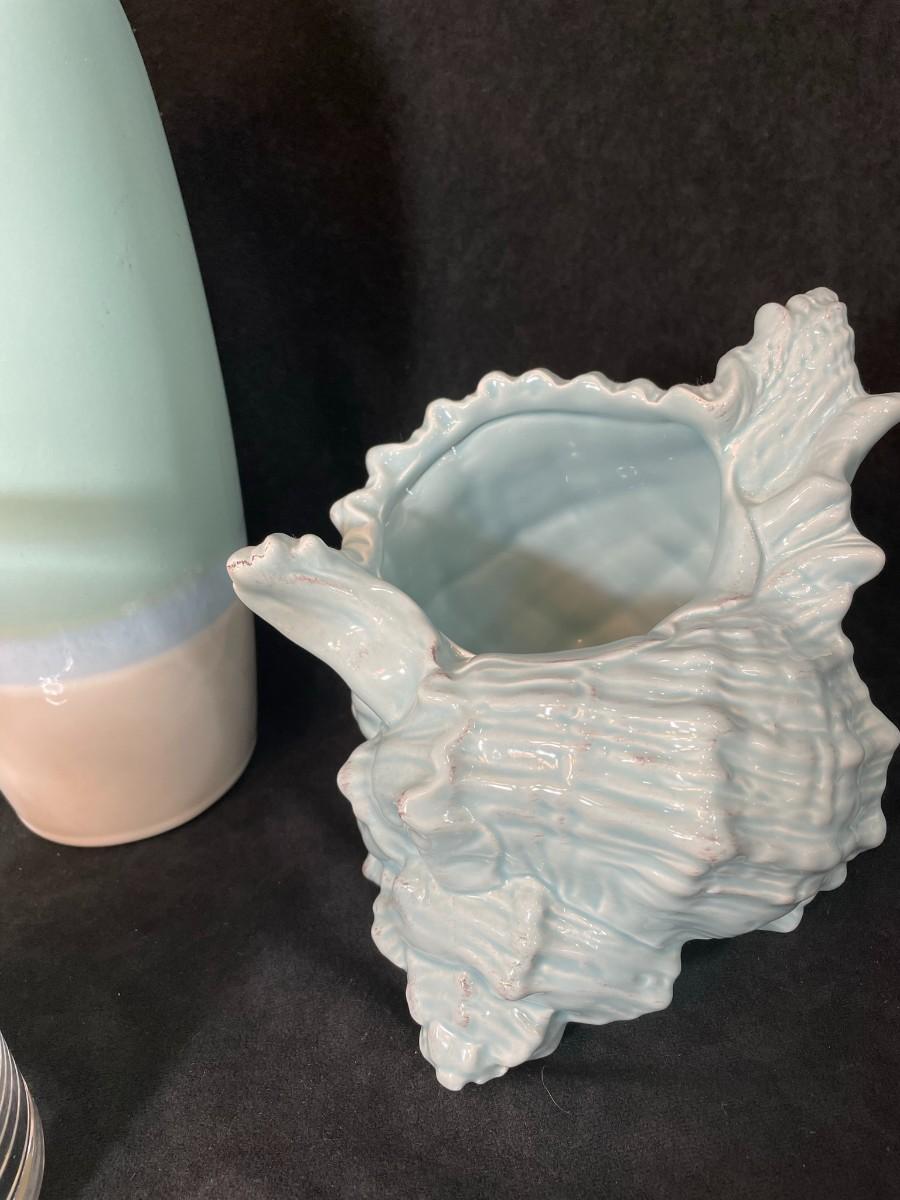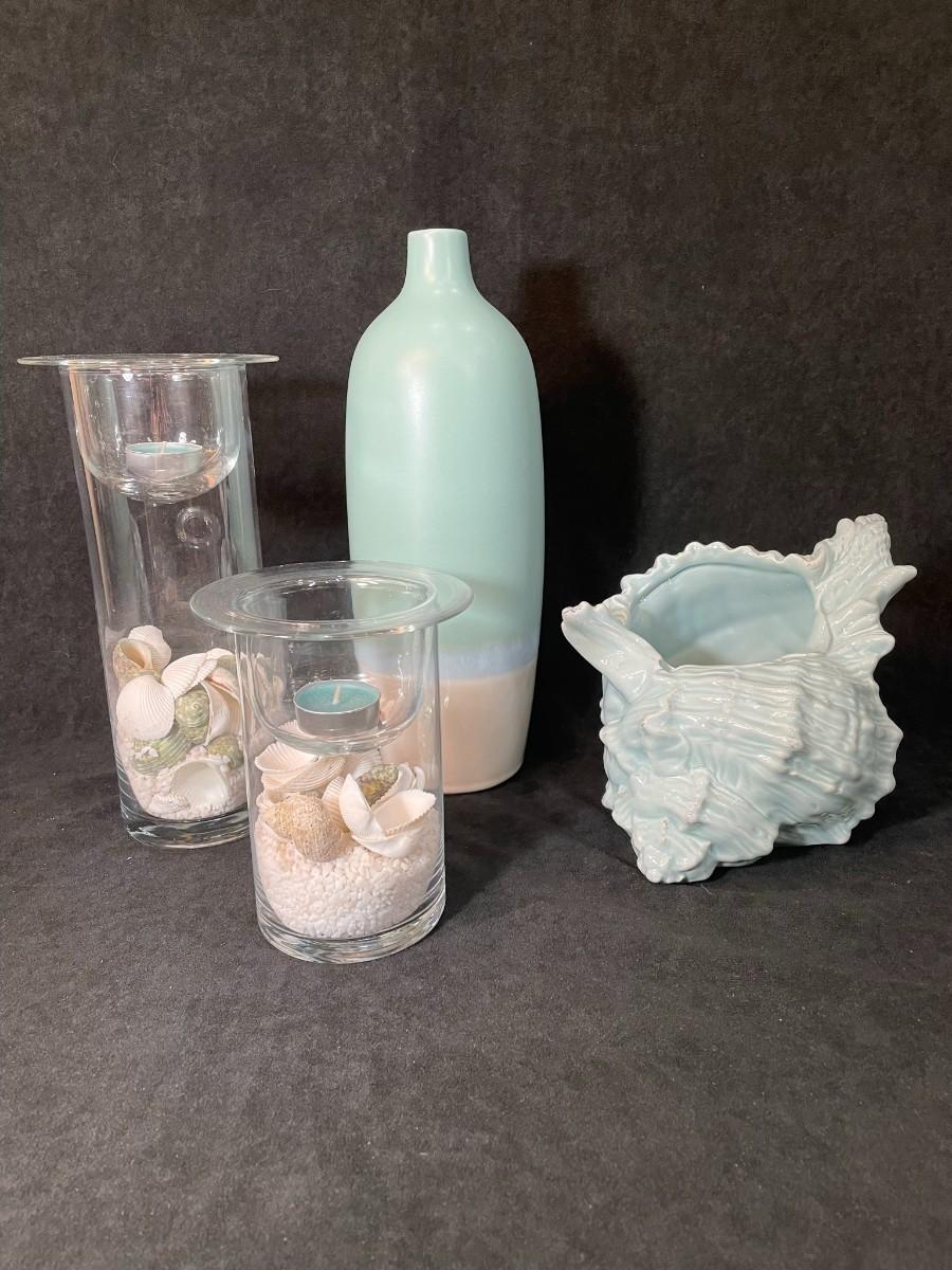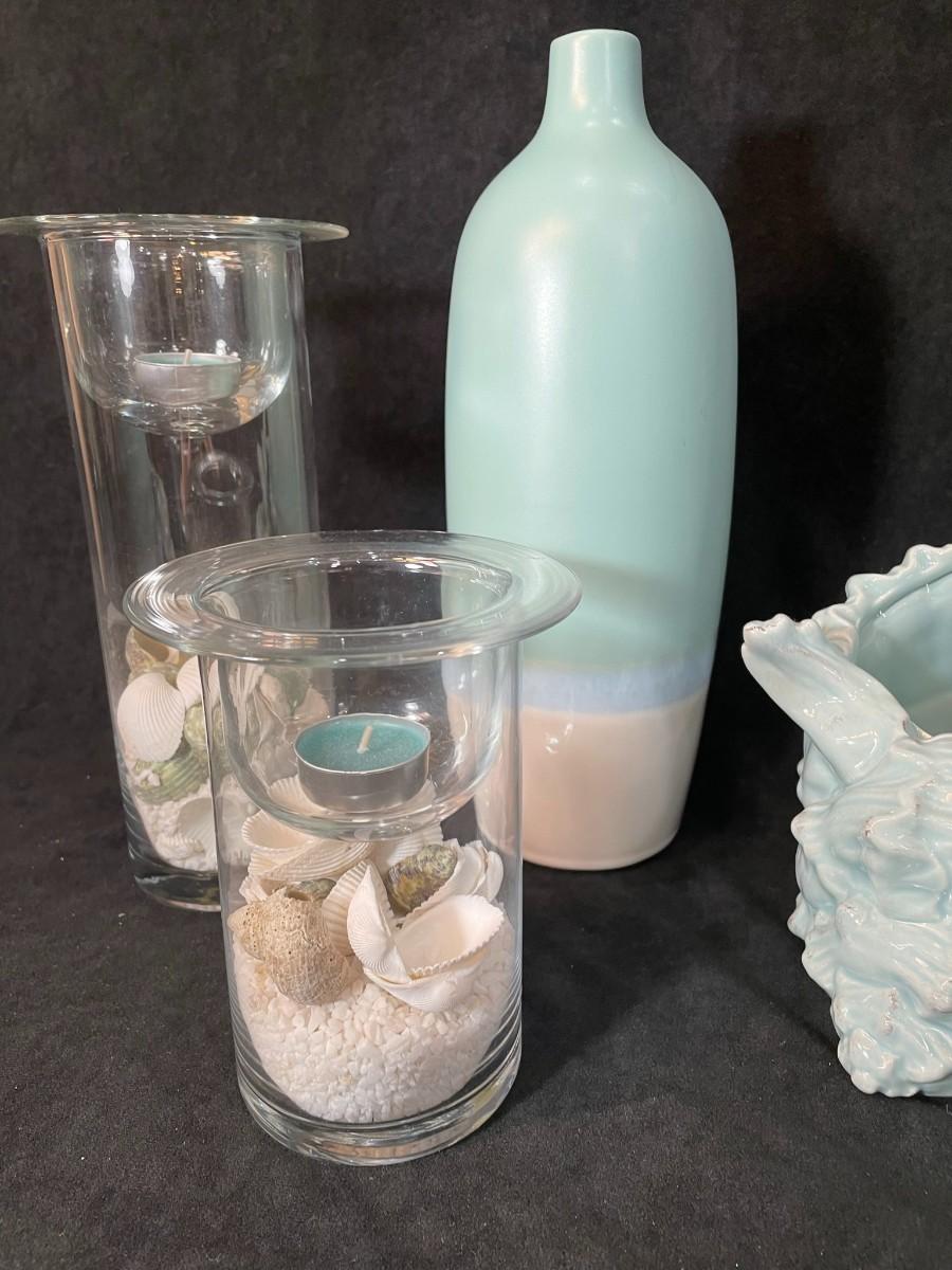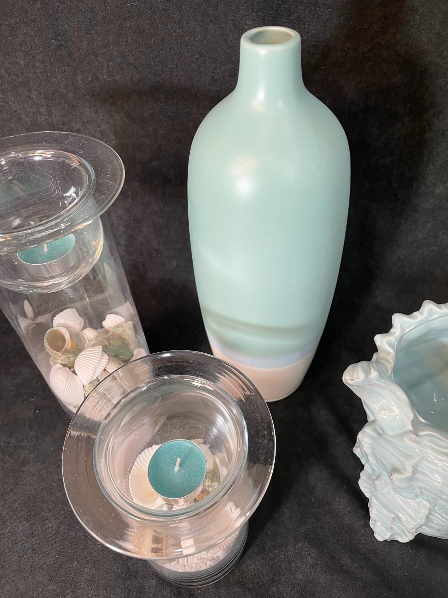 Two glass candle holders with sands & shells, glass conch shell, and aqua/sand colored vase. Lovely set.