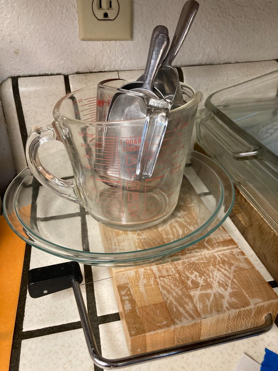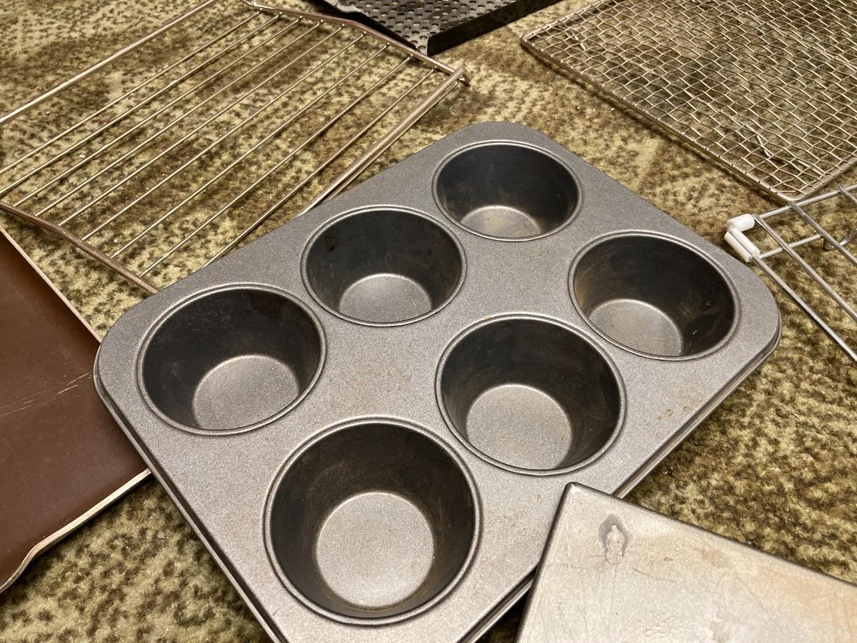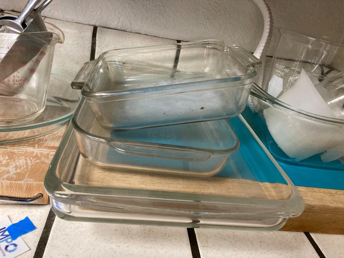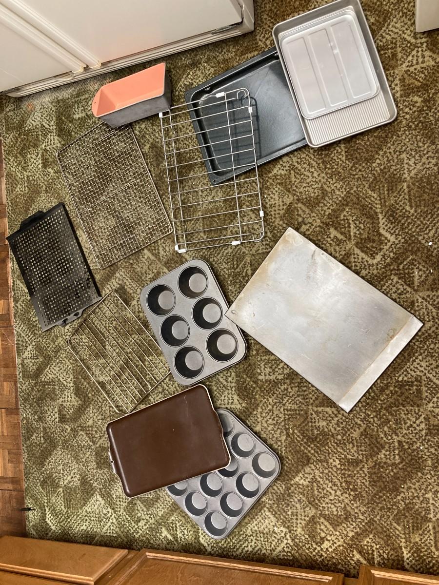 Baking racks, cookie trays, bread pan and muffin pans. Pyrex measuring cups and bake pans, pie pan. Includes set of metal scoops, cheese cutting board. Glass beaker-style measurers.