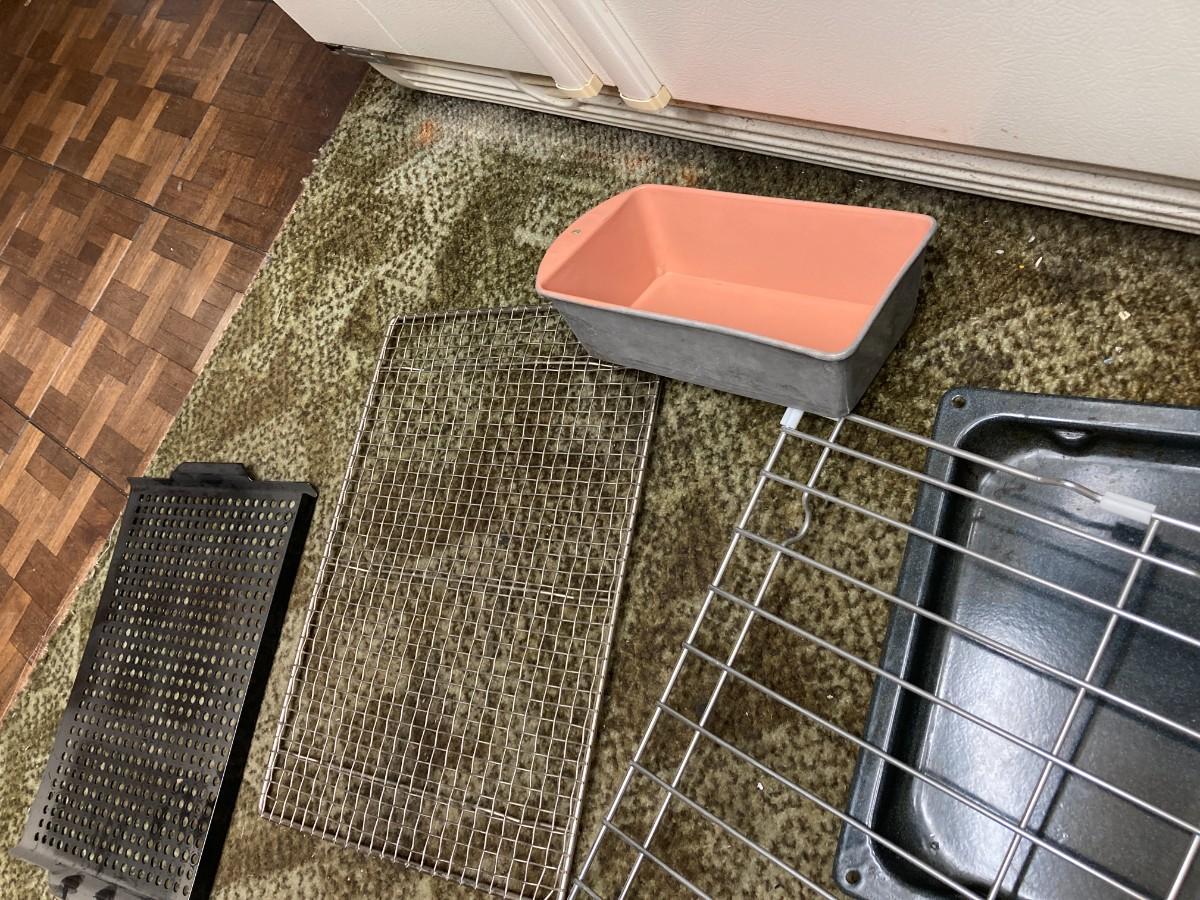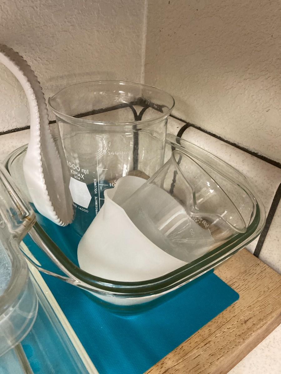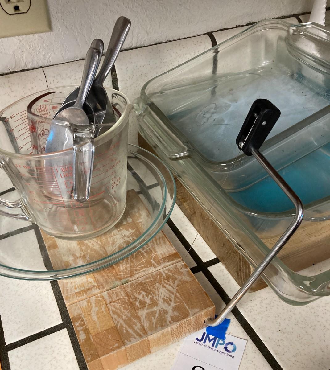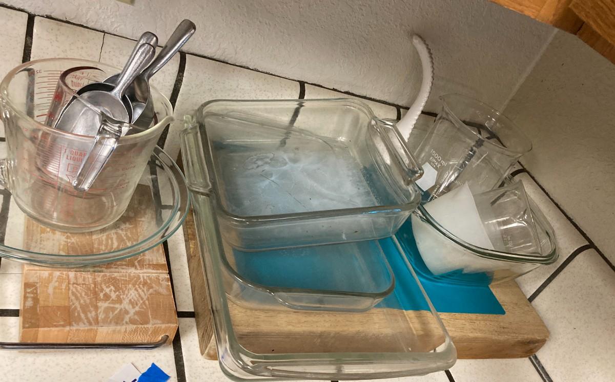 Baking racks, cookie trays, bread pan and muffin pans. Pyrex measuring cups and bake pans, pie pan. Includes set of metal scoops, cheese cutting board. Glass beaker-style measurers.