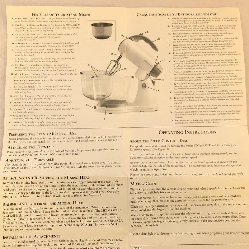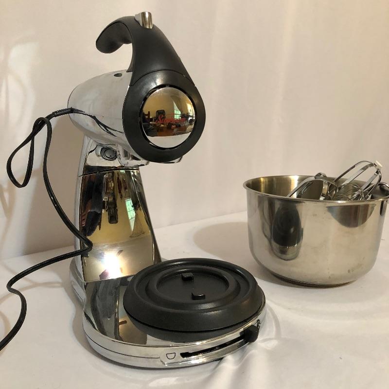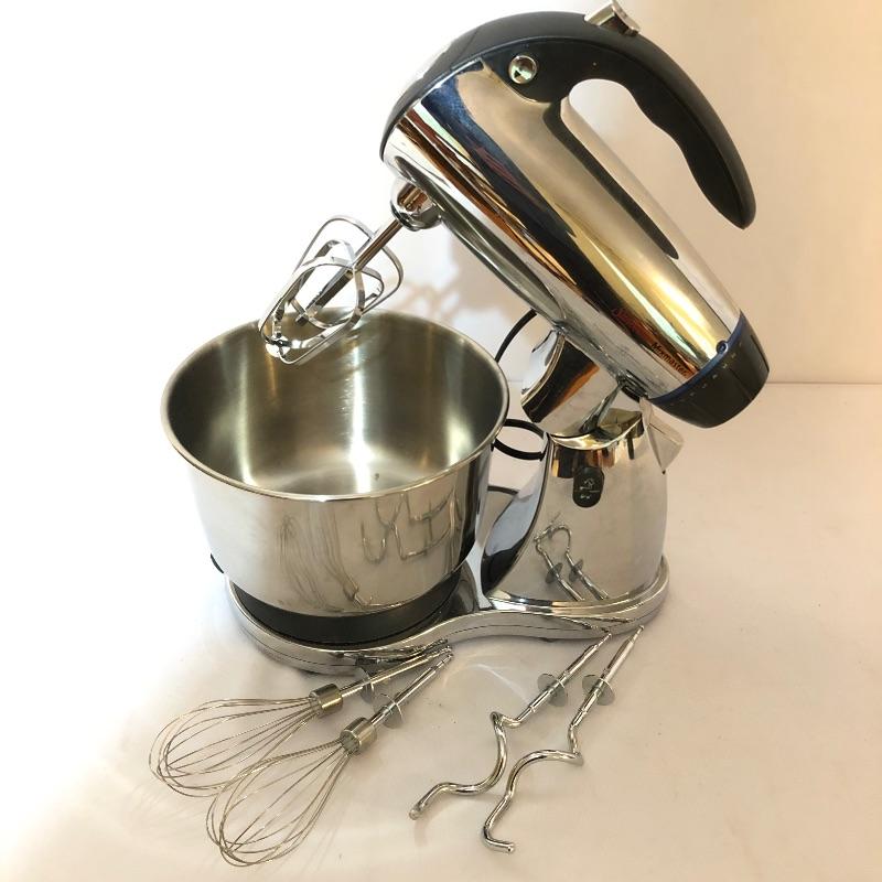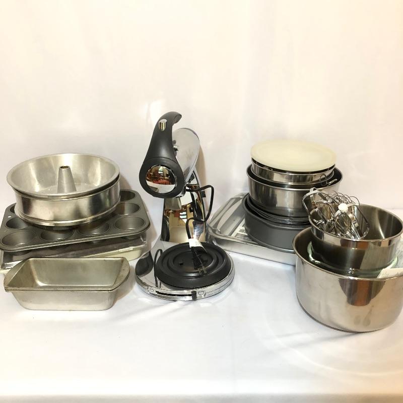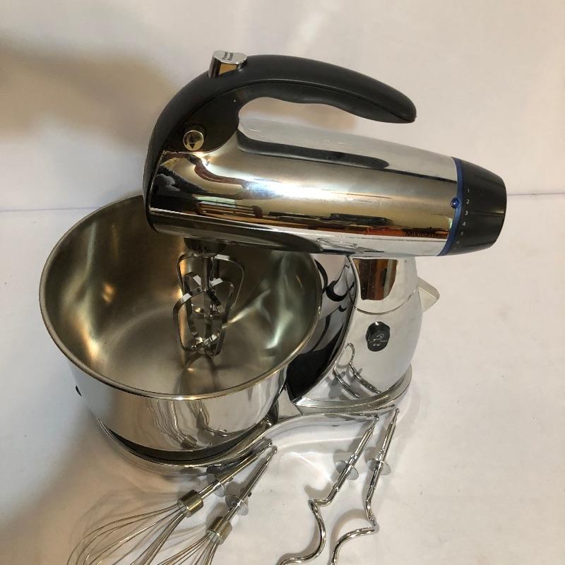 Need to fold, knead, stir, blend, whip and more, then treat yourself to some help with this Sunbeam Mixmaster. Model number is shown in the last image. This mixer is compact and lightweight, comes complete with three choices of beaters, manual and bowls. After your mixer has whipped up something wonderful, choose from a great assortment of baking pans to bake your goods. See images for all that is included.