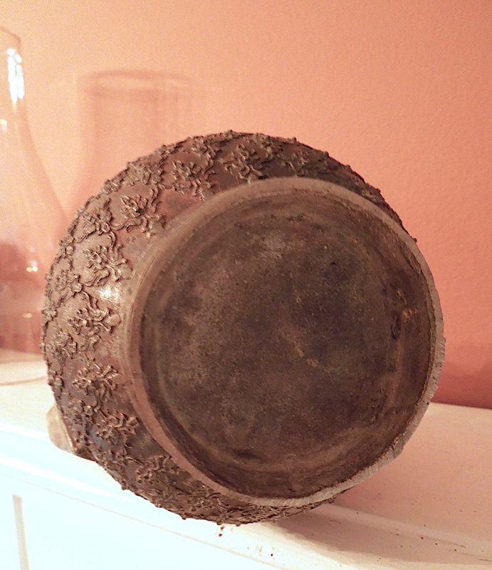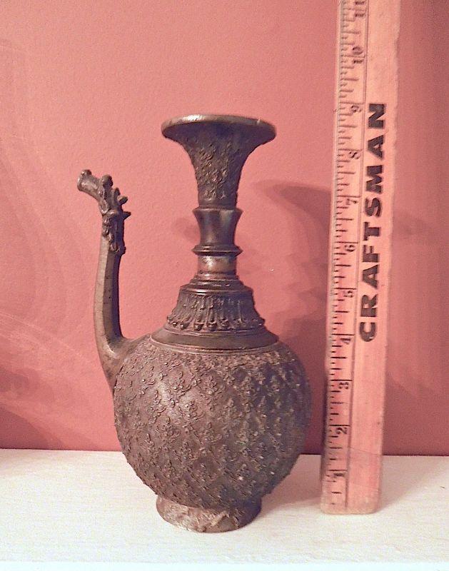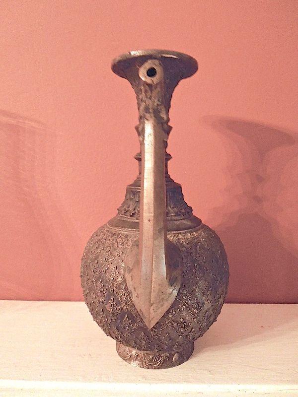 Inticate detail Islamic bronze decanter, perhaps for oil. Ovoid fluted top Lenox vase and a handpainted ceramic base glass globe oil lamp. No cracks or chips.