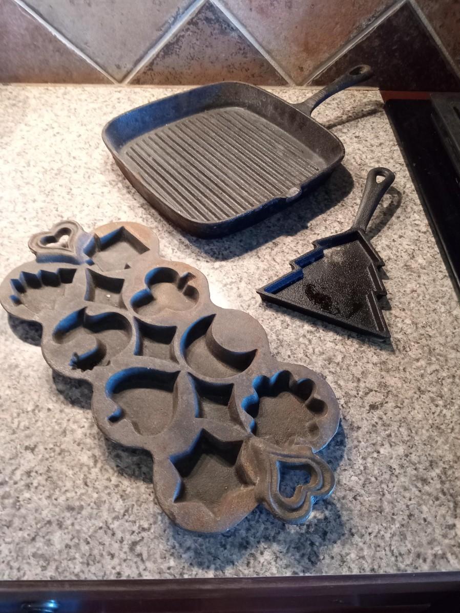 LOT 85  CAST IRON SKILLET, TREE PAN AND BAKING MOLDS (HU)