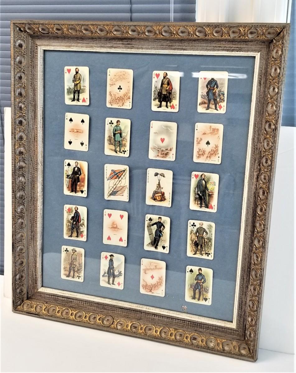 20 cards in all - they commemorate the War Between the States, probably from the 1960's. Some of the subjects include: Jefferson Davis, Lincoln, General Sheridan, General Grant, General Robert E. Lee, General Stuart, General Jackson, more. Blue Felt background, vintage frame. Frame measures 24" across and 28.5" tall. A handsome set.
