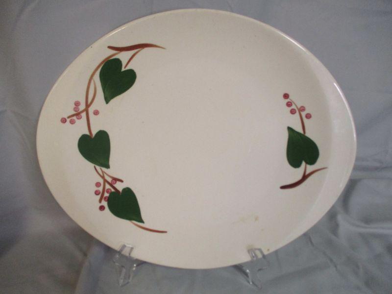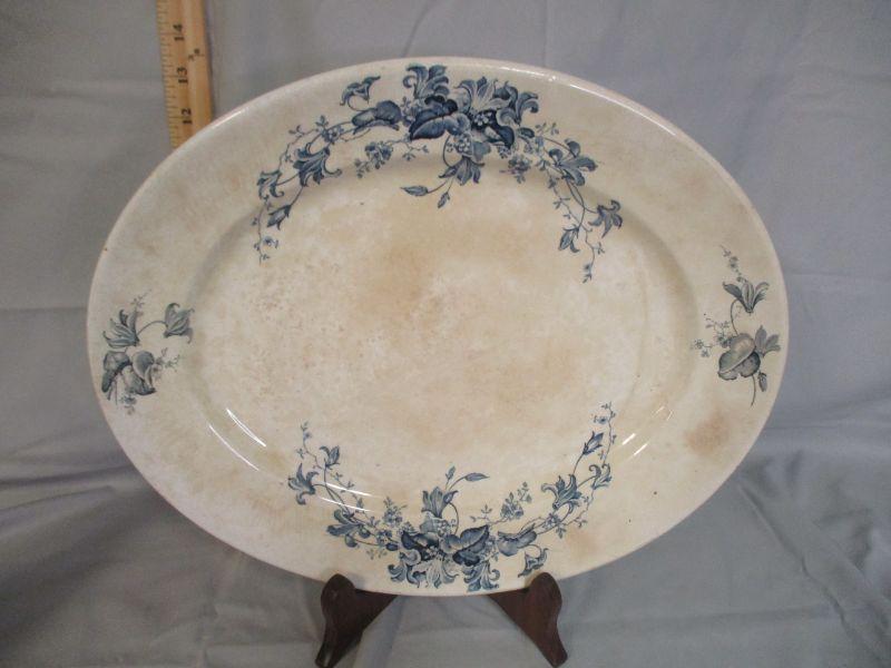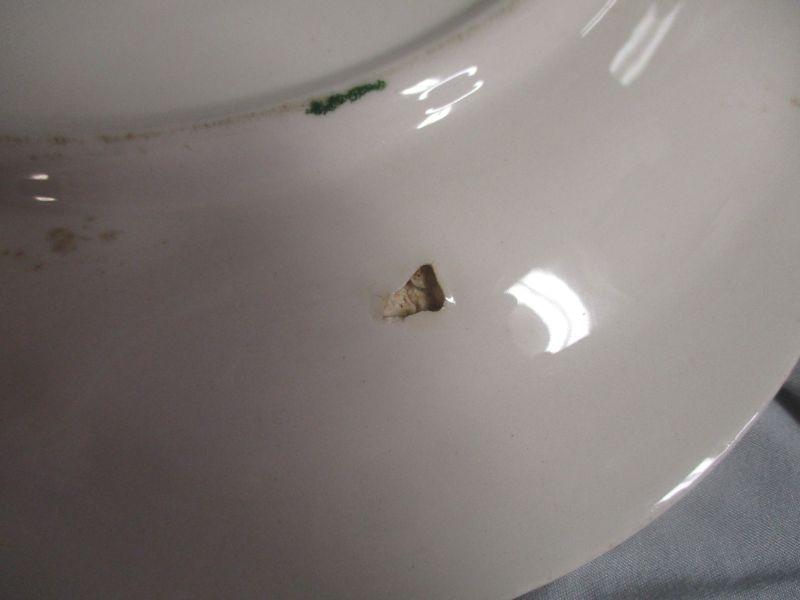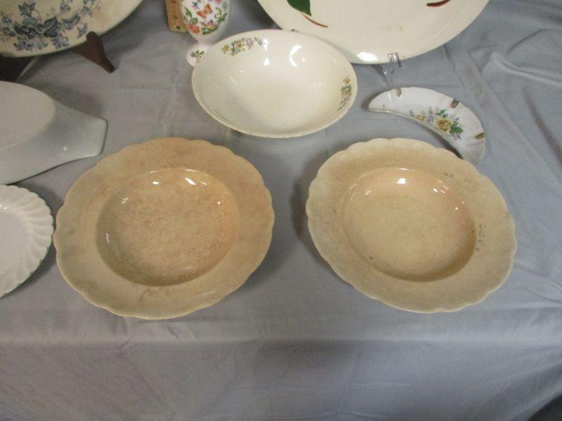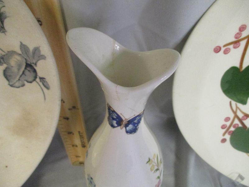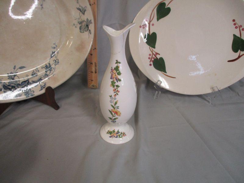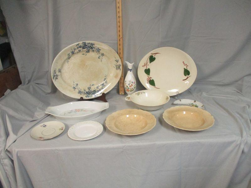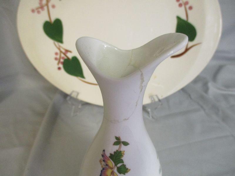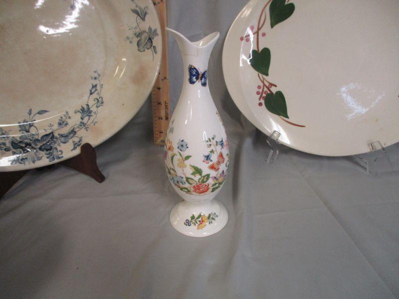 The large platter is unmarked, has significant browning, overall good shape with no chips or cracks, and is 15.75" long. The Blue Ridge Pottery platter is in good condition, but there is what looks like a "popped" air bubble on the backside, and 13.5" long. The two matching bowls are very brown from age and appear to be Homer Laughlin. The Aynsley vase has a repaired neck. Normally, I wouldn't include this vase because of that, but it is still a very pretty vase and can still be used.