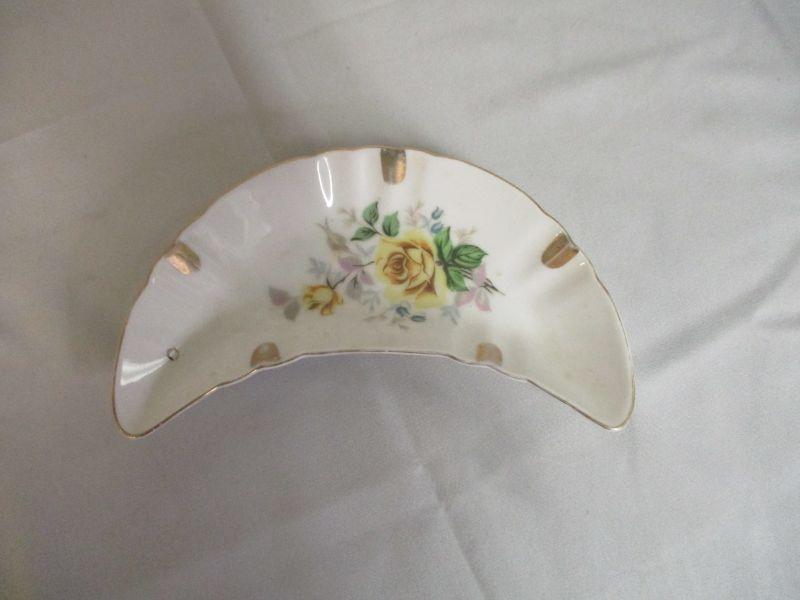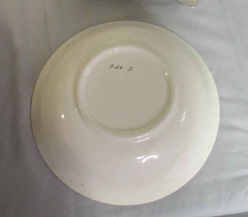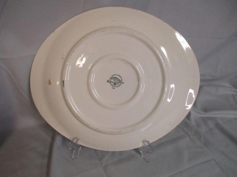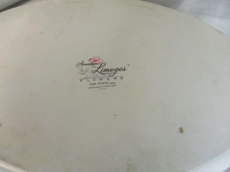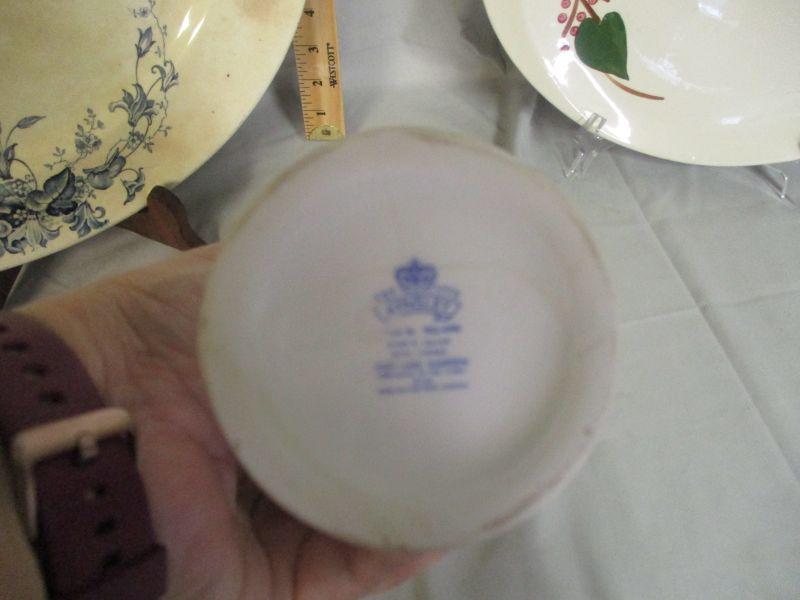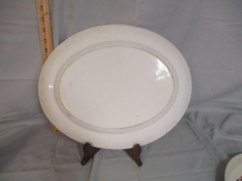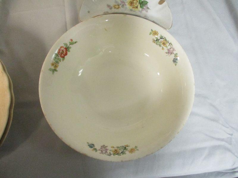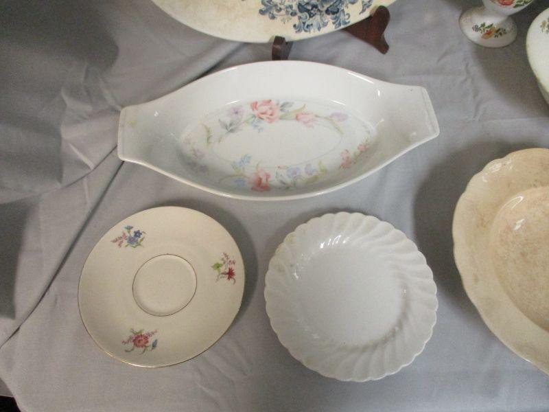 The large platter is unmarked, has significant browning, overall good shape with no chips or cracks, and is 15.75" long. The Blue Ridge Pottery platter is in good condition, but there is what looks like a "popped" air bubble on the backside, and 13.5" long. The two matching bowls are very brown from age and appear to be Homer Laughlin. The Aynsley vase has a repaired neck. Normally, I wouldn't include this vase because of that, but it is still a very pretty vase and can still be used.