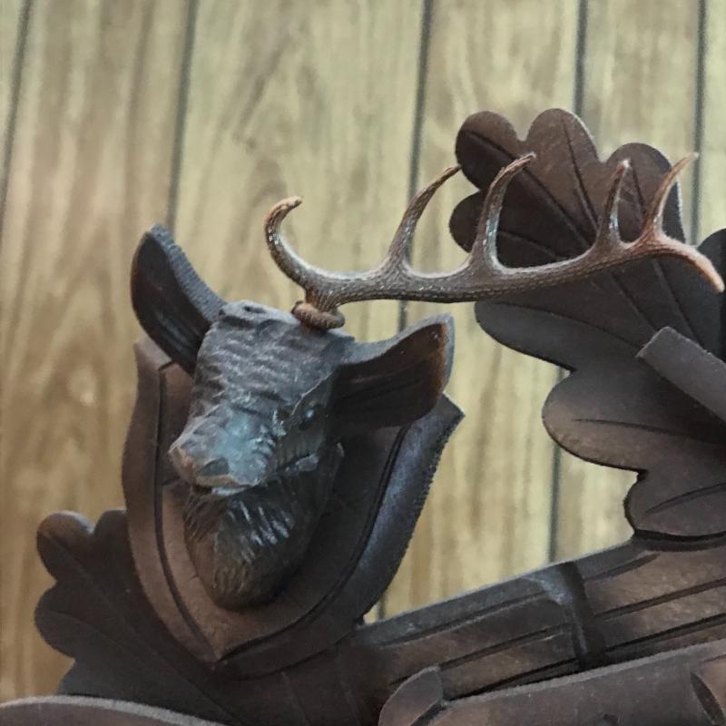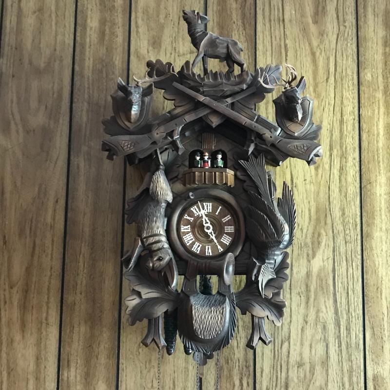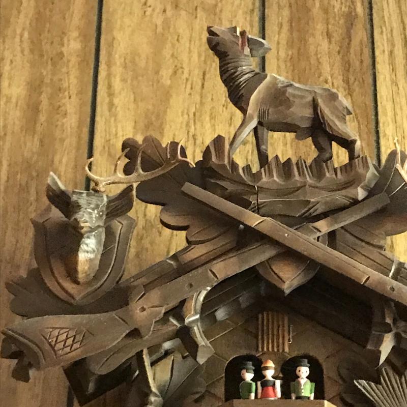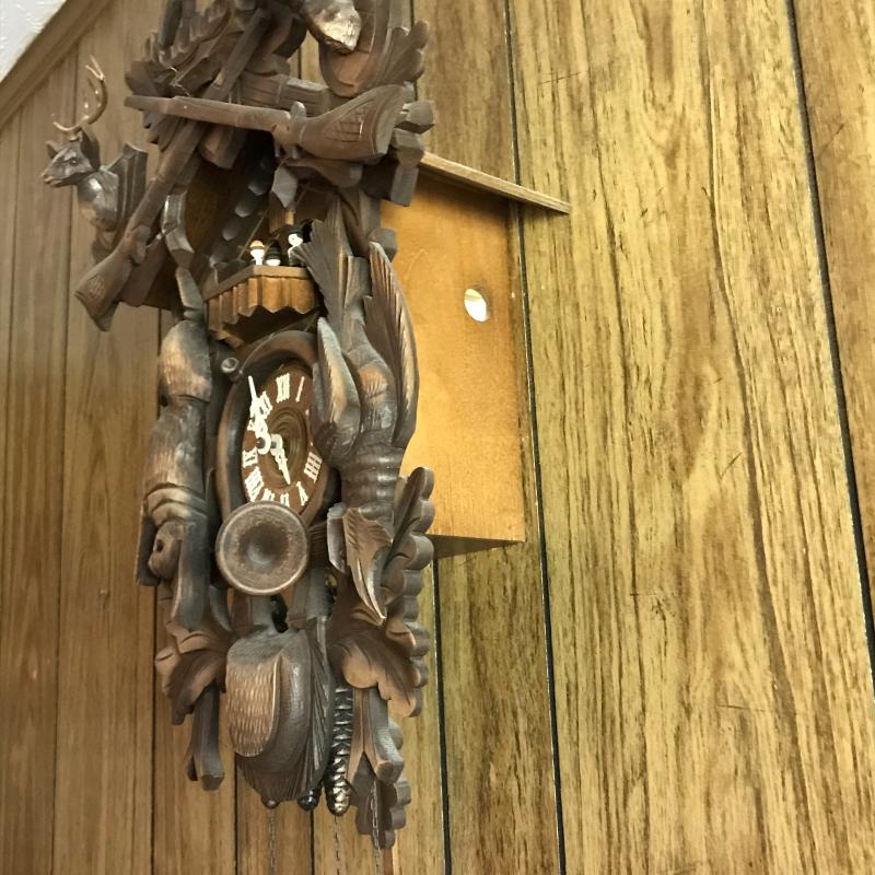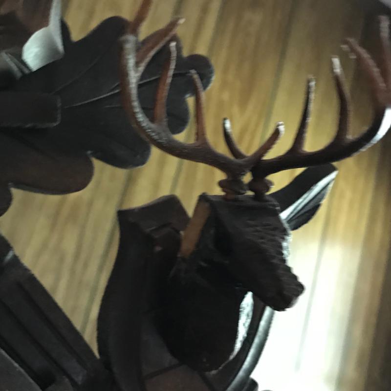 This beautiful hand carved wooden cuckoo clock is perfect for your den, cabin or hunting lodge. Cannot verify functionality. Top piece is chipped and one antler is missing. No shipping available. Local pickup only in Hendersonville, NC.