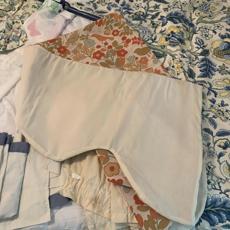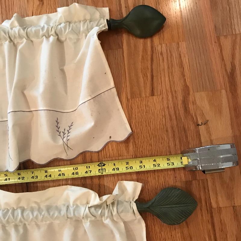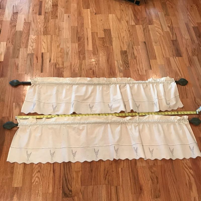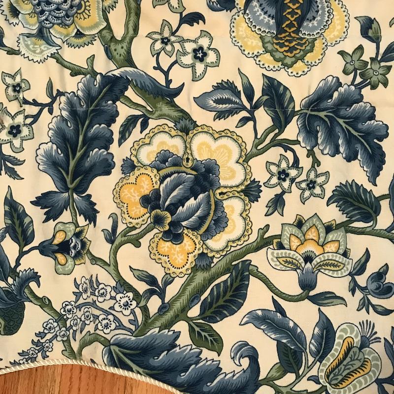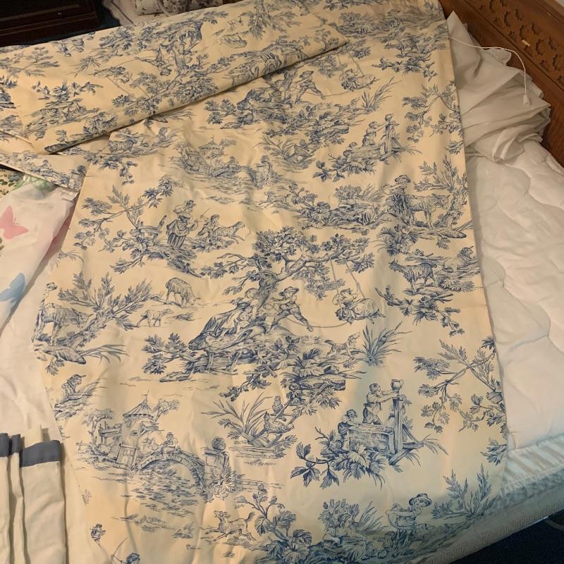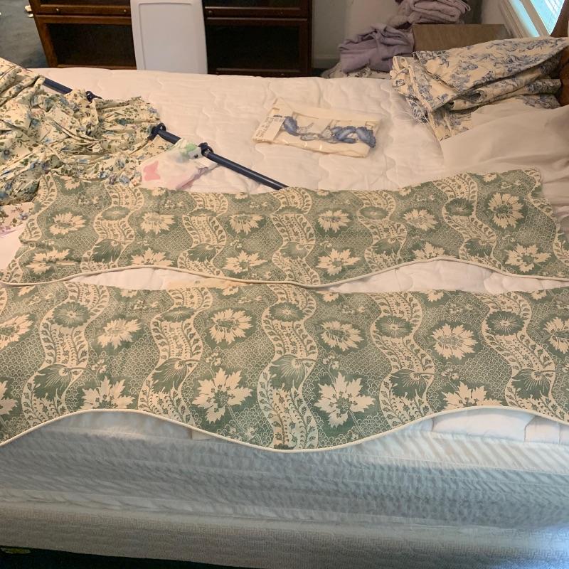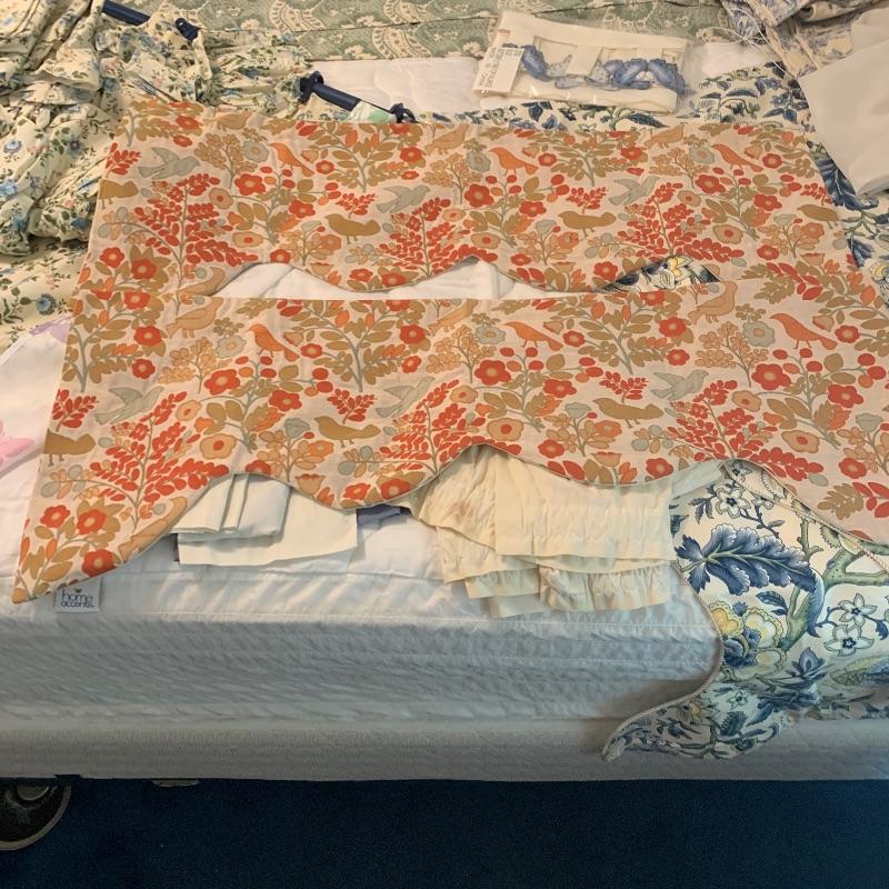 This lot has custom made curtains in pretty floral colors. Essentially there are seven different patterns and styles going on here. The blue floral that is hanging has an additional two panels that may have gone on a larger window. The peach color is just two panels like the green ones. Both could likely swap out for two blue hanging ones which measure aprox. 43” across. The toile design has four valances and two pull gather shades. These are a bit dingy and would need a good cleaning. The image with the bed (not included) shows several valances. The blue patterned valence shown on the hardwood floor has hardware currently attached to the wall, buyer may choose to take or leave hardware. See images for a couple sizes. A shower curtain and bed skirt for a queen bed. Local pick up only.