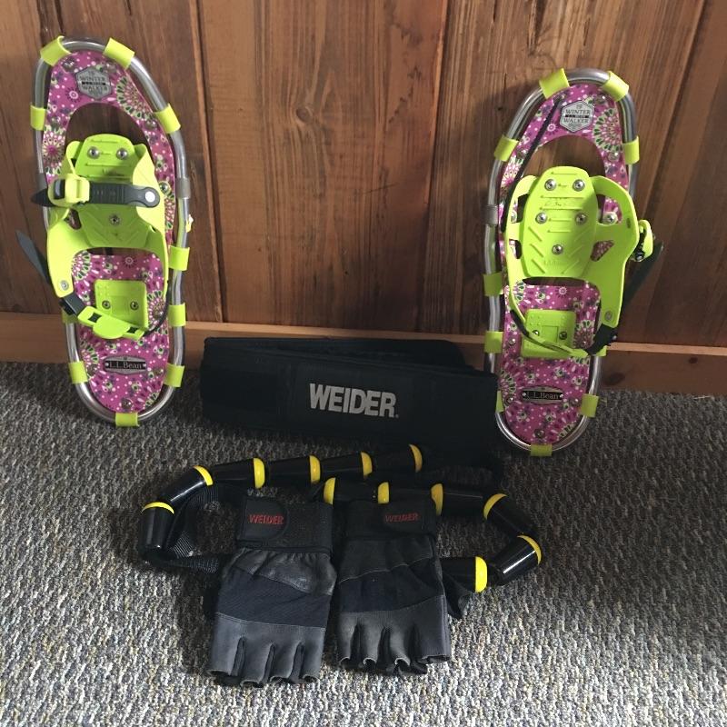 Get a workout for your arm and your leg with this DO Airgometer. Also includes adult L.L. Bean Winter Walker snow shoes, Weider belt and gloves, Stretchrite and Tiger Grip fingerless gloves. Snow shoes fit adult shoe size 9.5 dor illustration purposes. Bike measures 25” x 50” x 51”.