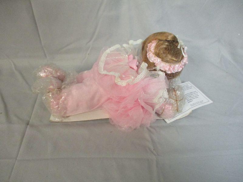 This doll is still in it's original wrapping so I feel safe in saying that she's in excellent condition. She has a porcelain head, hands, and feet.