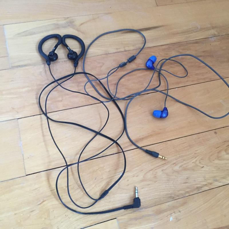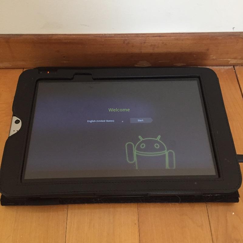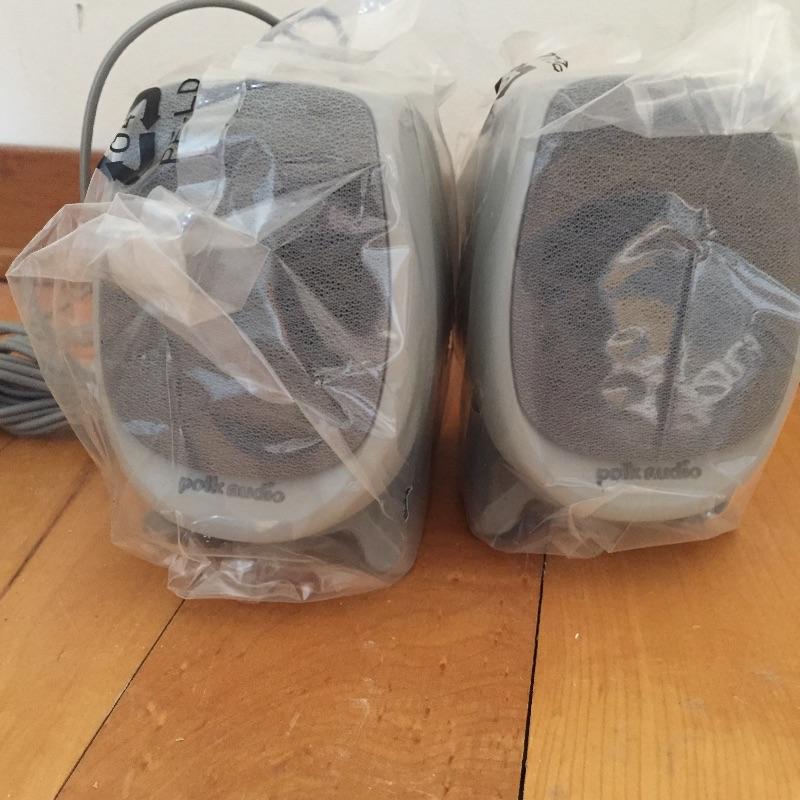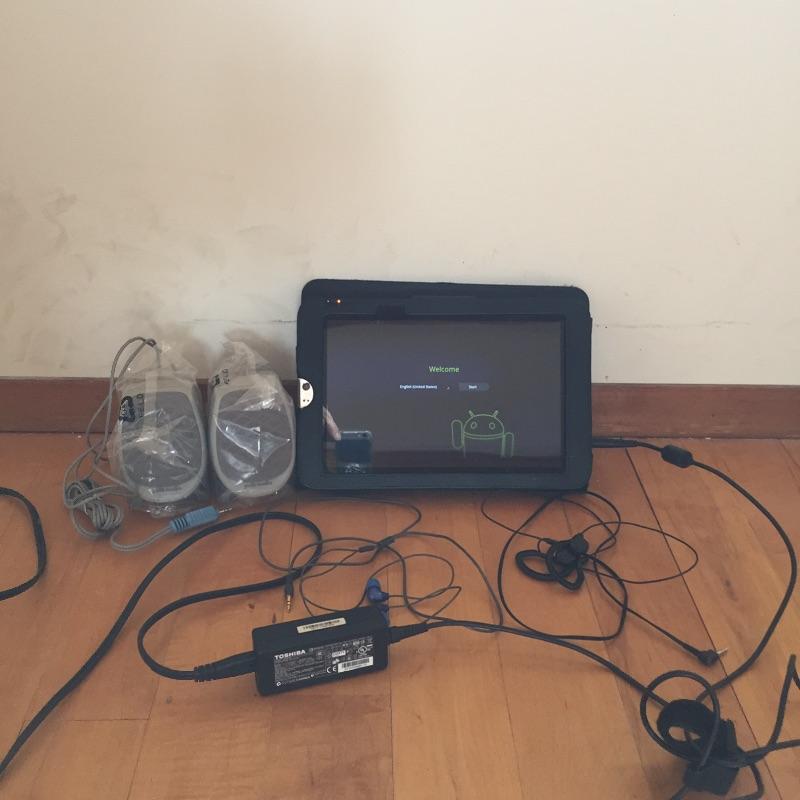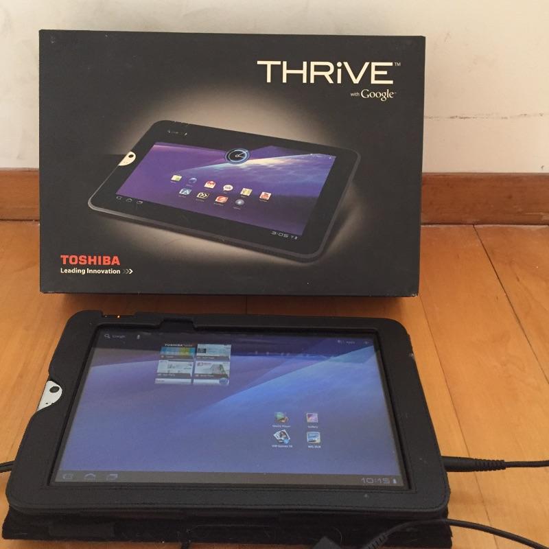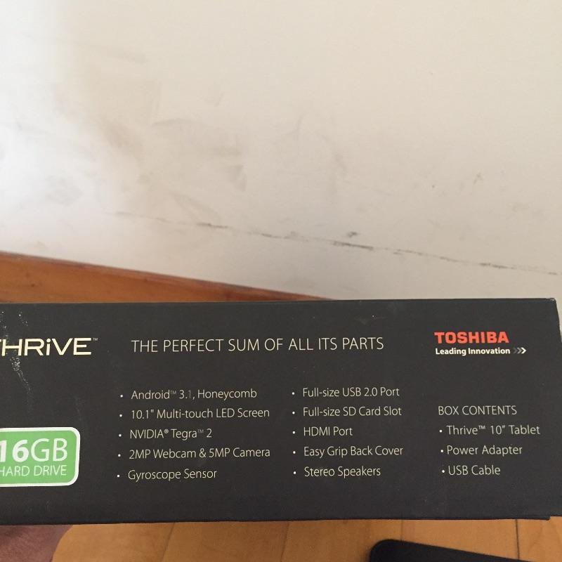 16 GB Thrive 10.1” Google tablet by Toshiba in box and Polk Audio Speakers and two pairs of headphones. Tablet turns on when plugged in.