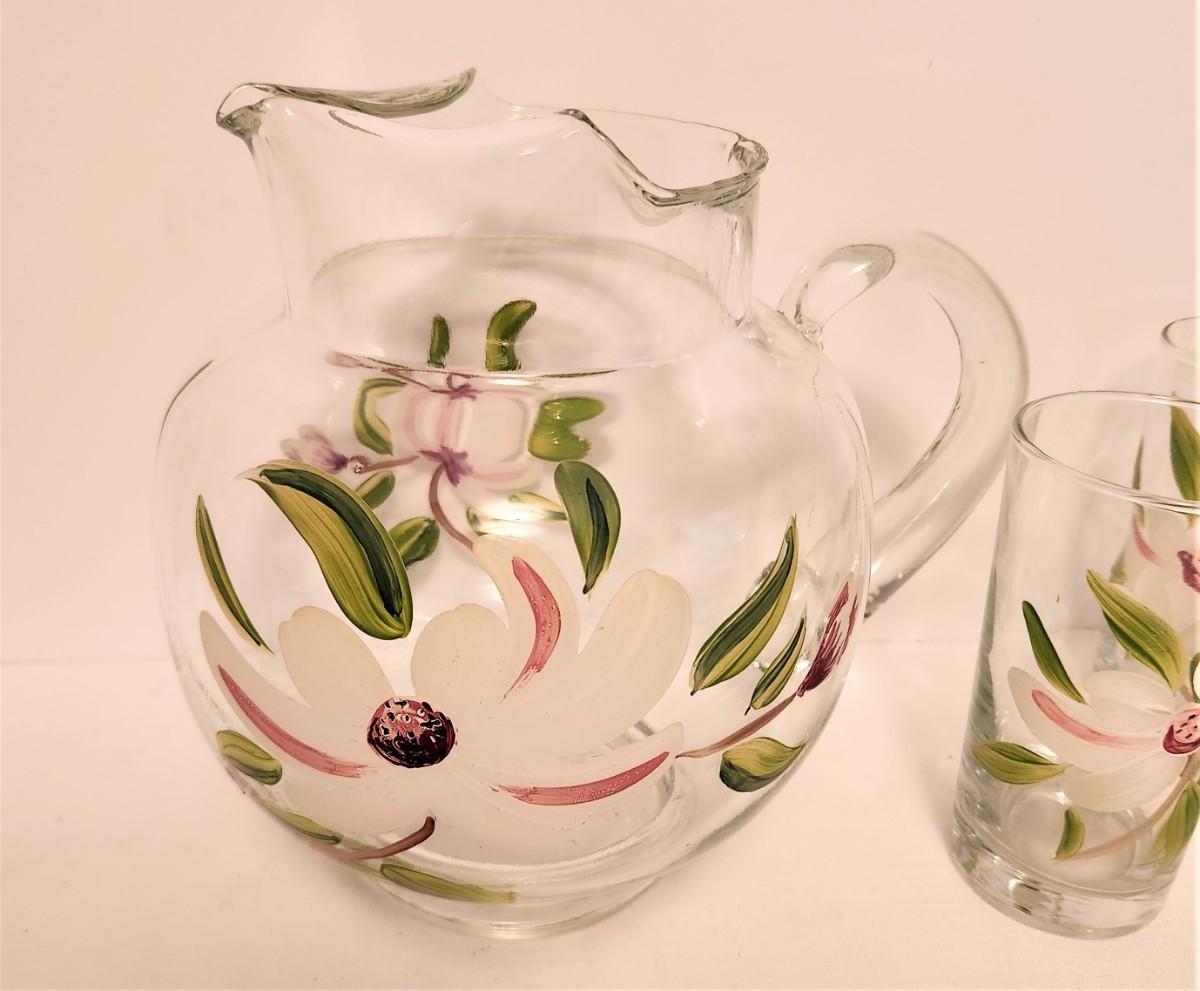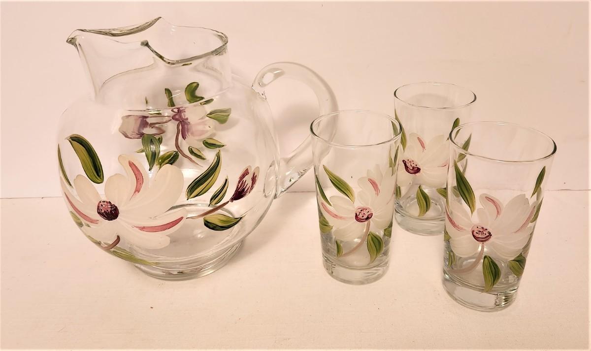 Lot #85  Hand Painted Pitcher with 3 glasses - Magnolia Motif