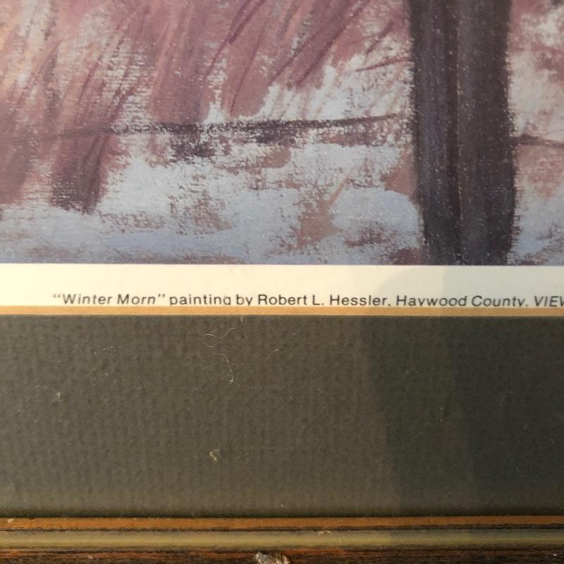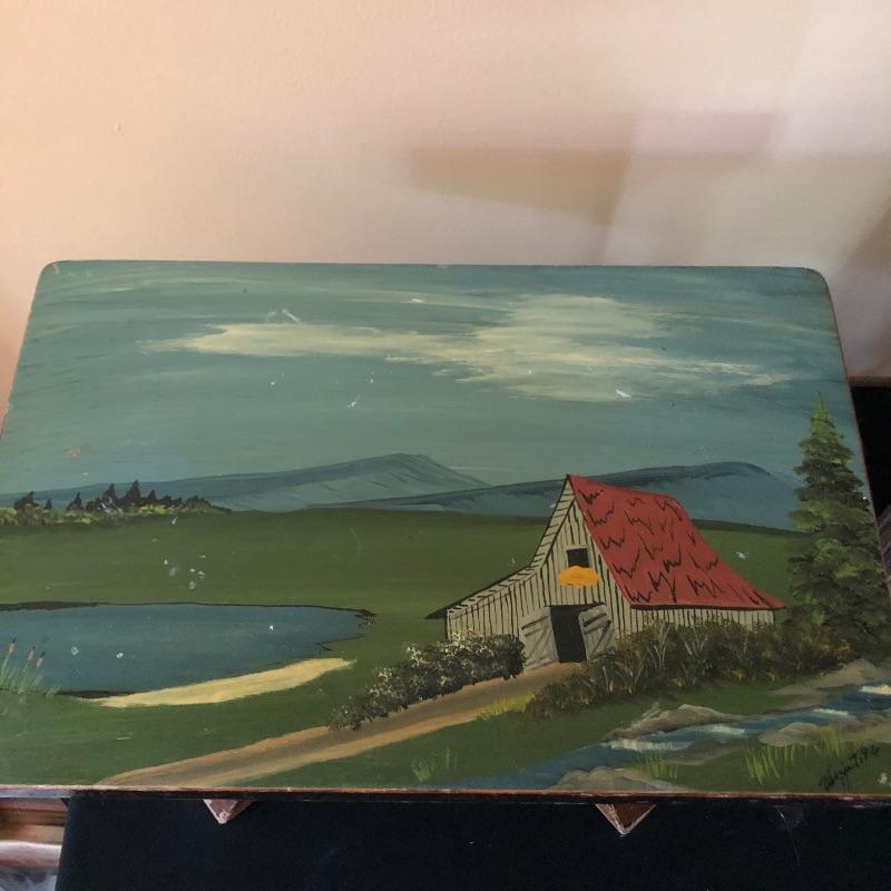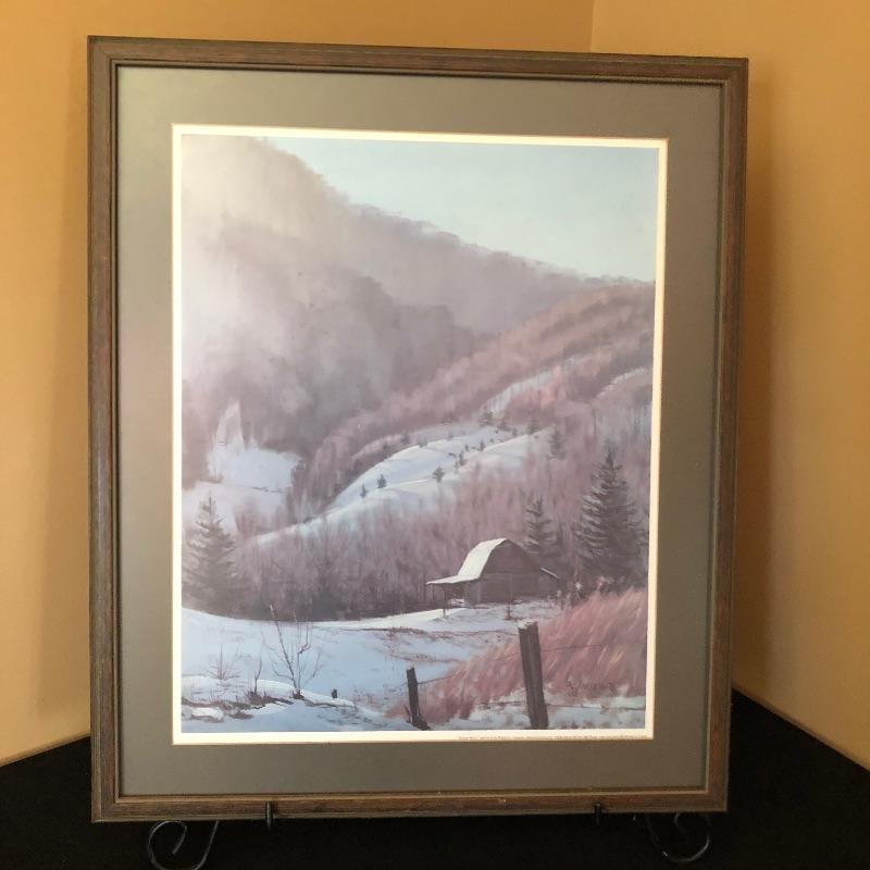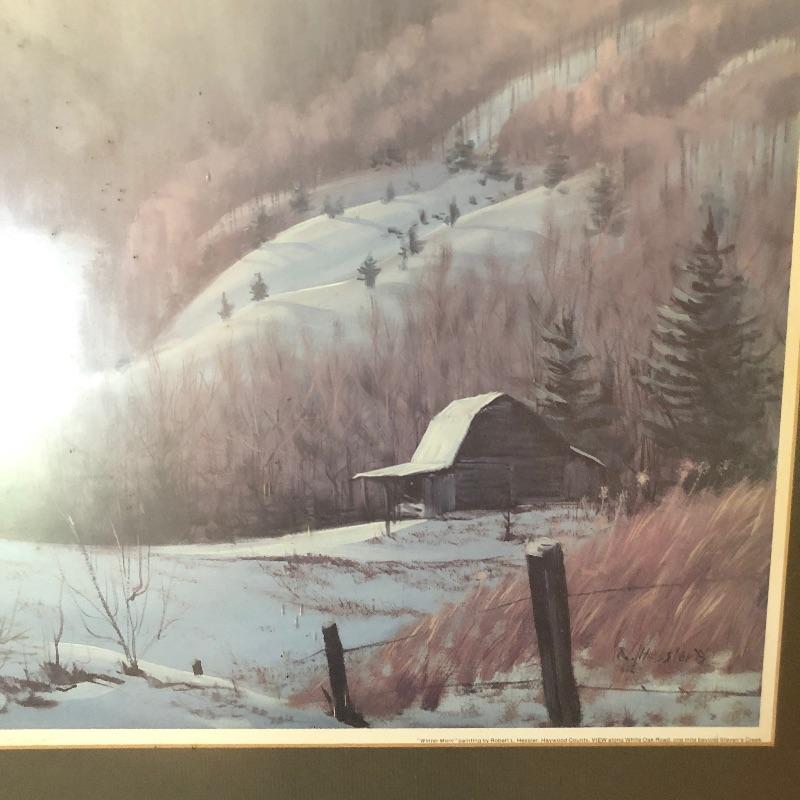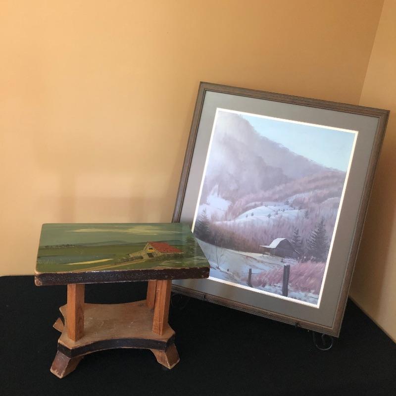 This gorgeous small stool has been hand-painted with a scene of an old barn down by a pond in the countryside. The stool is made of solid wood and the painting appears to have a clear varnish coating. We have paired this with another old barn scene set in a snowy mountainside. Titled Winter Morn, this piece is signed - R. Hessler and the art is matted and mounted in a mid toned wood frame. It measures 22” x 26”.
