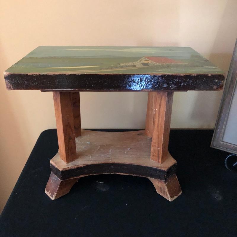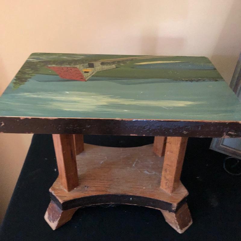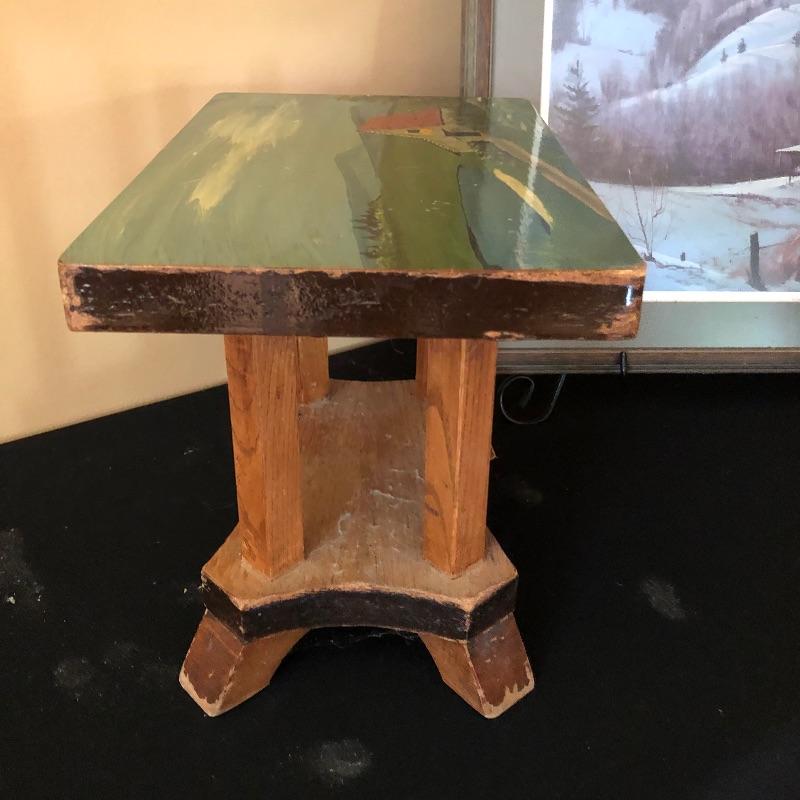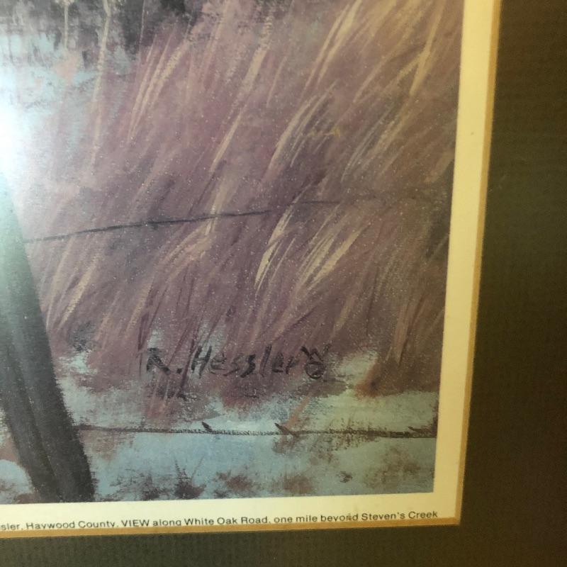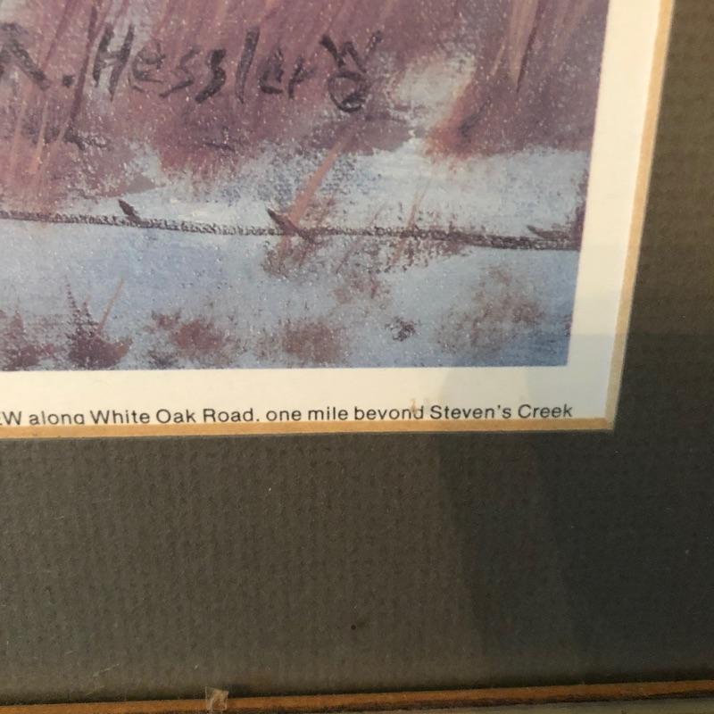 This gorgeous small stool has been hand-painted with a scene of an old barn down by a pond in the countryside. The stool is made of solid wood and the painting appears to have a clear varnish coating. We have paired this with another old barn scene set in a snowy mountainside. Titled Winter Morn, this piece is signed - R. Hessler and the art is matted and mounted in a mid toned wood frame. It measures 22” x 26”.