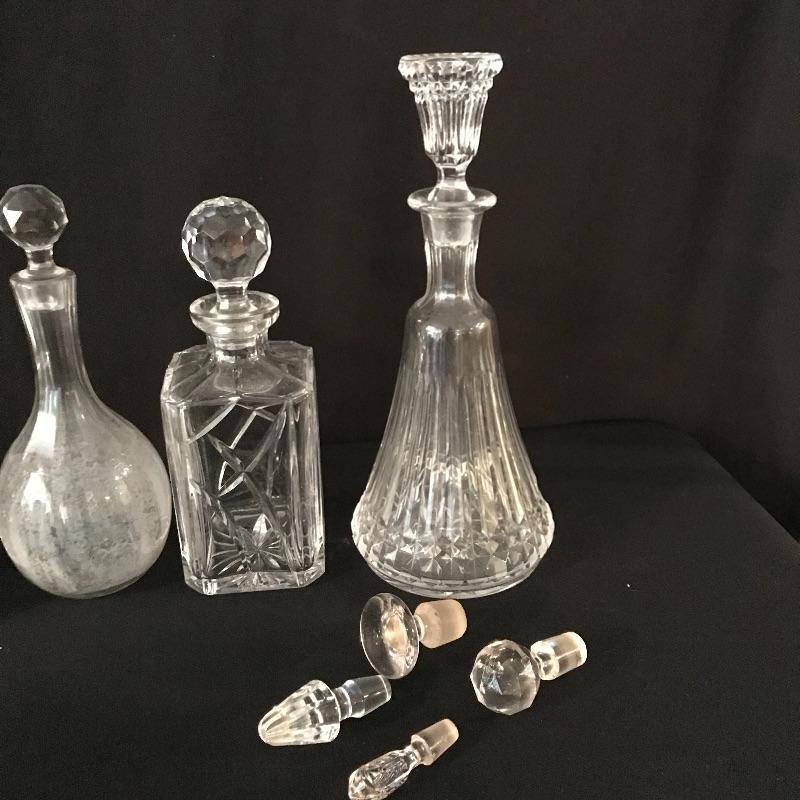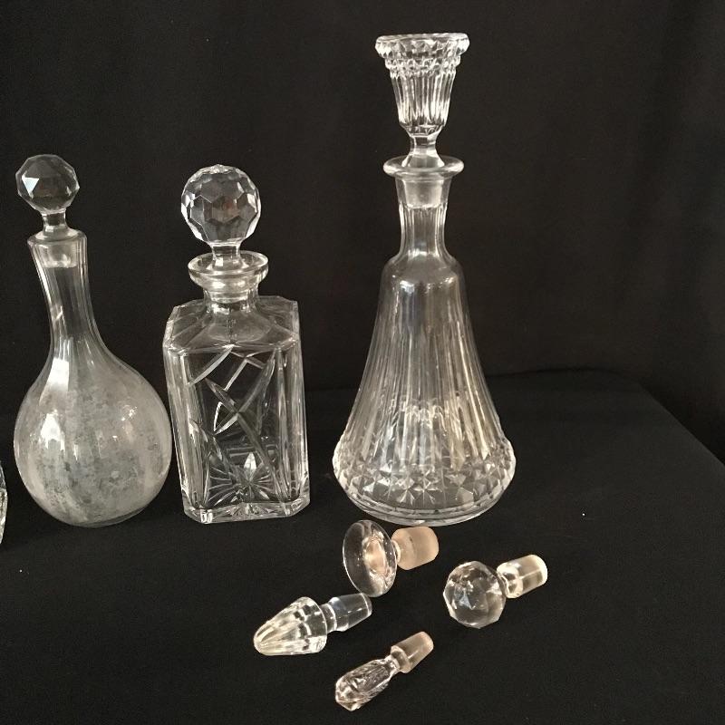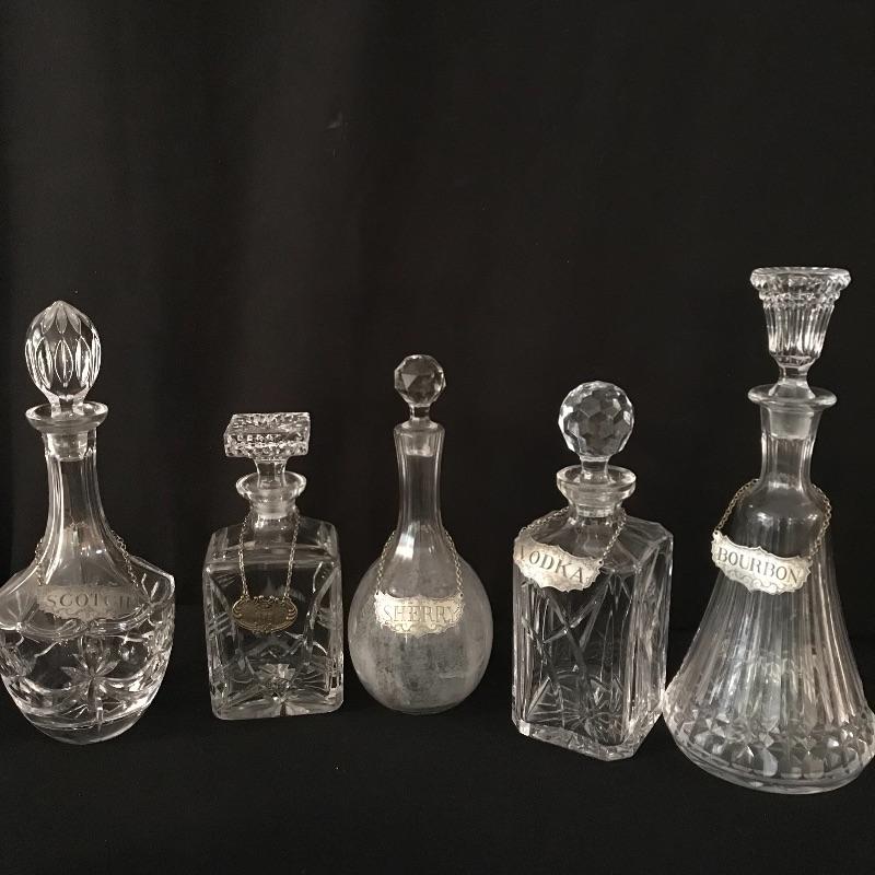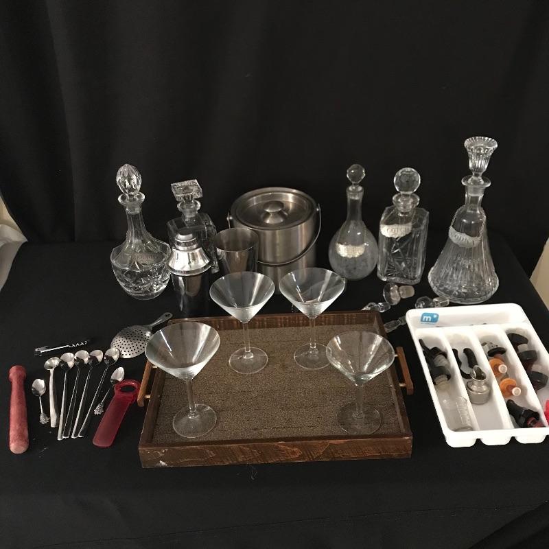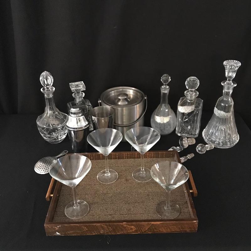 Add some class and finesse to your home bar with these five glass decanters with four extra stoppers and handsome metal labels for bourbon, sherry, vodka, scotch and rye. The decanter labeled sherry is cloudy and needs to be washed. Collection includes ice bucket, utensils, shakers and even a cork/wooden tray for your entertainment needs. Also included are four martini glasses, one of which is slightly smaller than the rest. Shipping available.