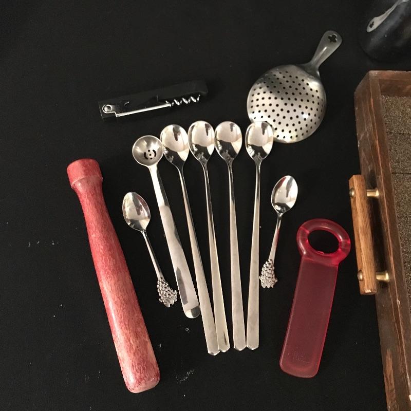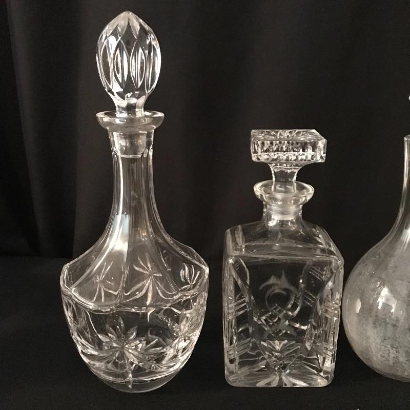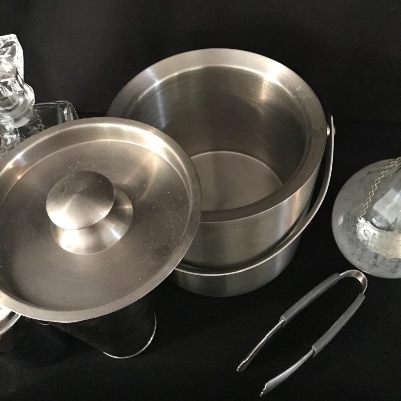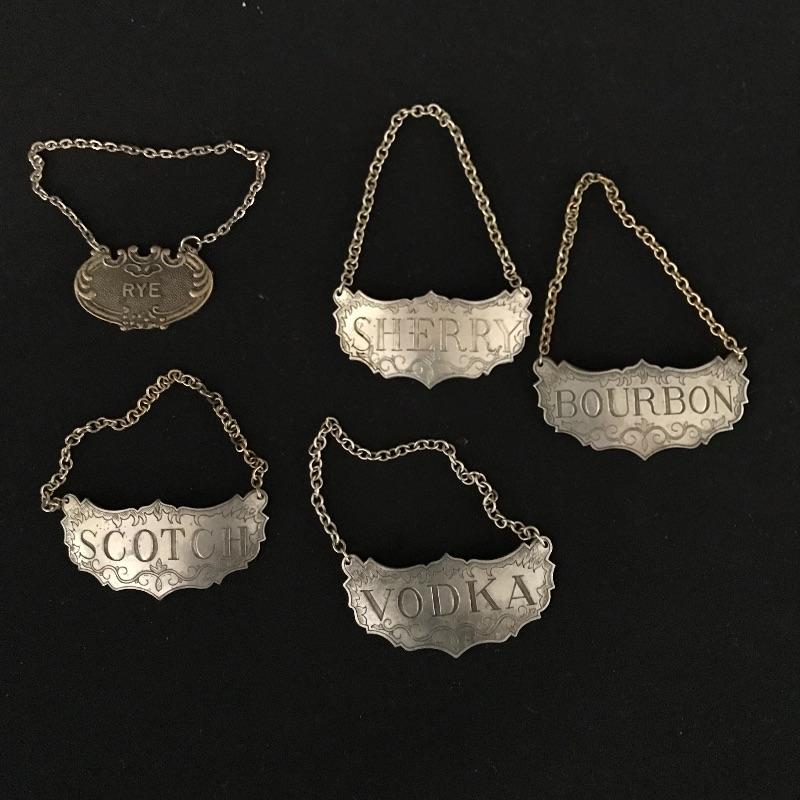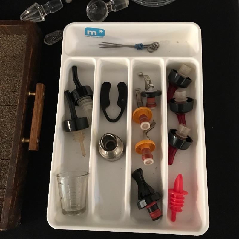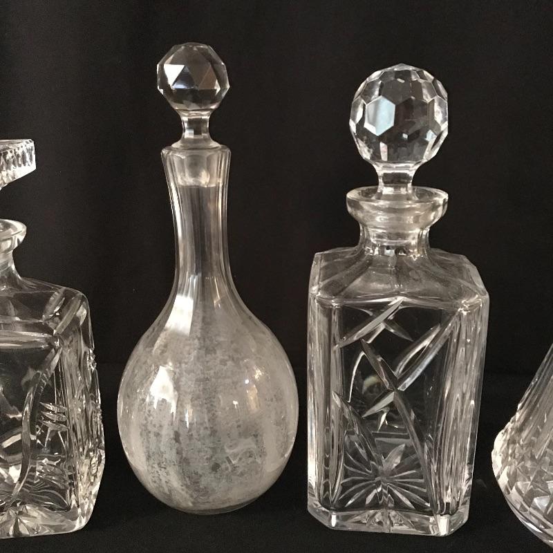 Add some class and finesse to your home bar with these five glass decanters with four extra stoppers and handsome metal labels for bourbon, sherry, vodka, scotch and rye. The decanter labeled sherry is cloudy and needs to be washed. Collection includes ice bucket, utensils, shakers and even a cork/wooden tray for your entertainment needs. Also included are four martini glasses, one of which is slightly smaller than the rest. Shipping available.