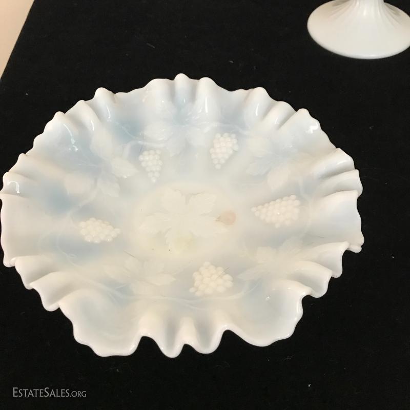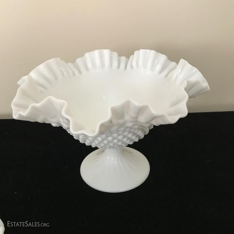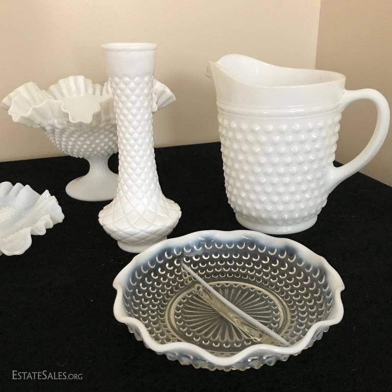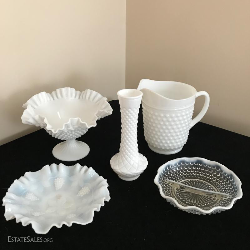 5 pieces of milk glass. All but one are have knob design. Split dish is clear glass with a milk edge. This lot is available for shipping or local pick up in Mills River, NC.