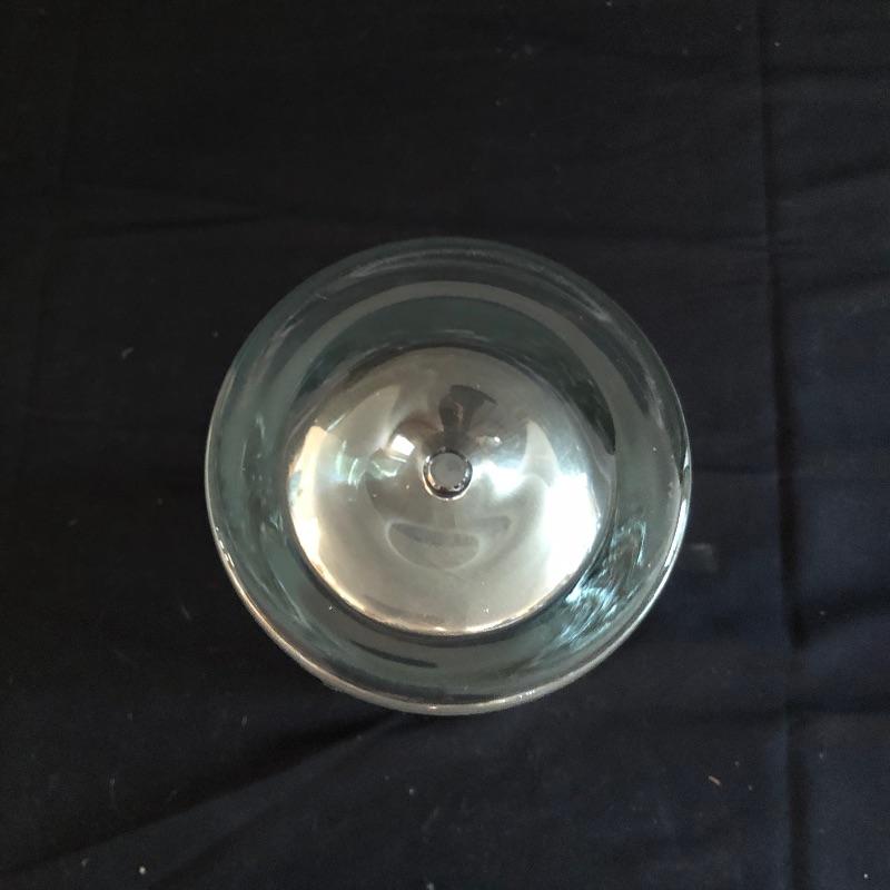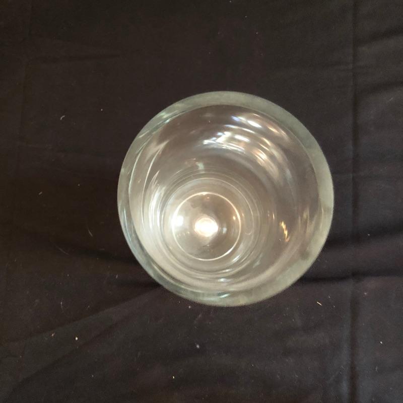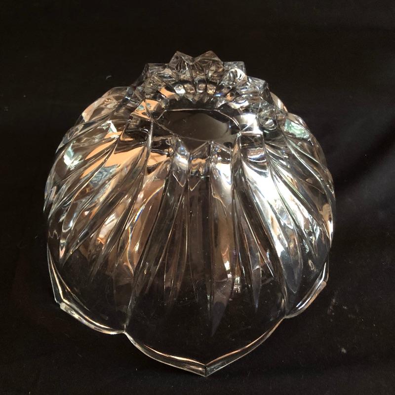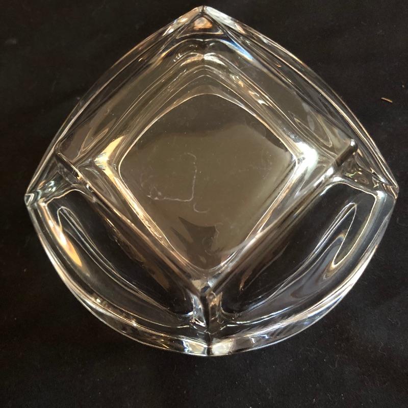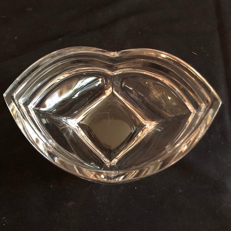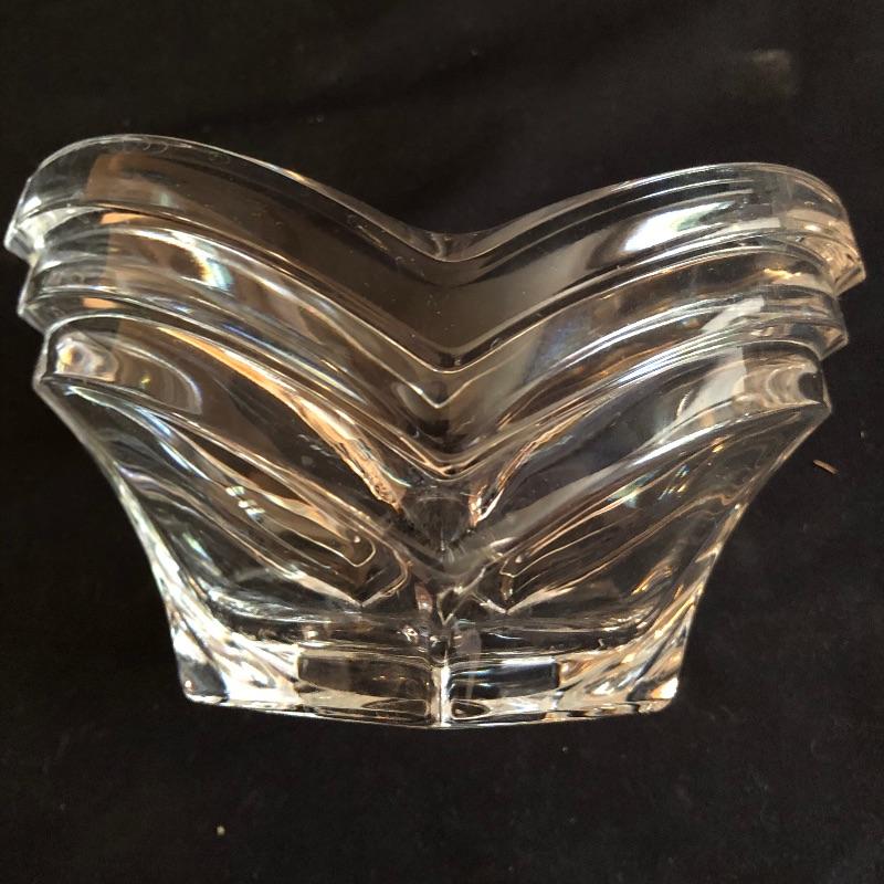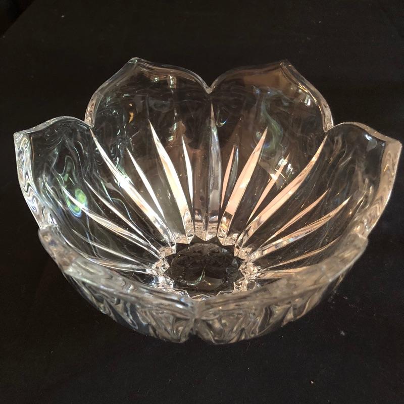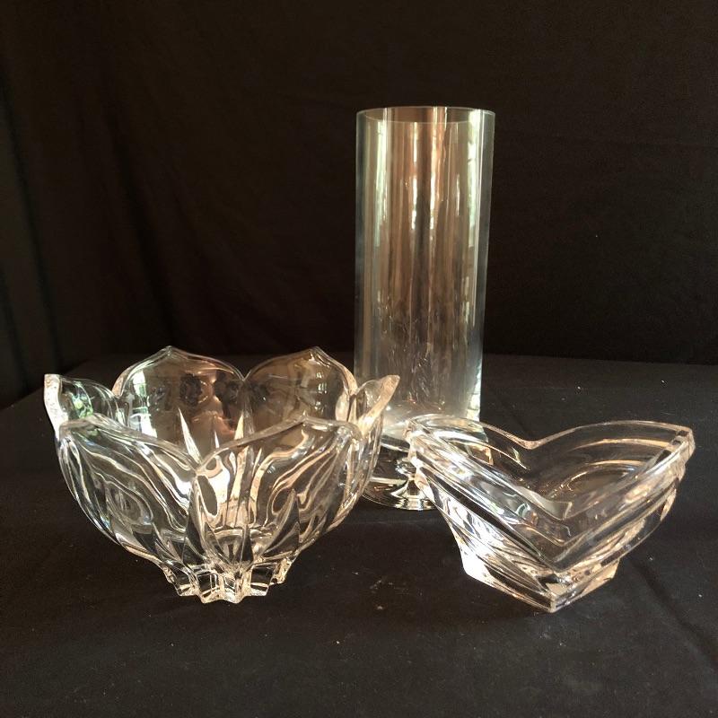 This elegant trio of glass pieces includes a tall Krosno vase which is possibly crystal but we cannot guarantee that. It’s a lovely, heavy piece measuring 4” x 11”. The larger of the 2 bowls looks like a flower in formed glass. The smaller formed bowl is the perfect size for a candy dish.