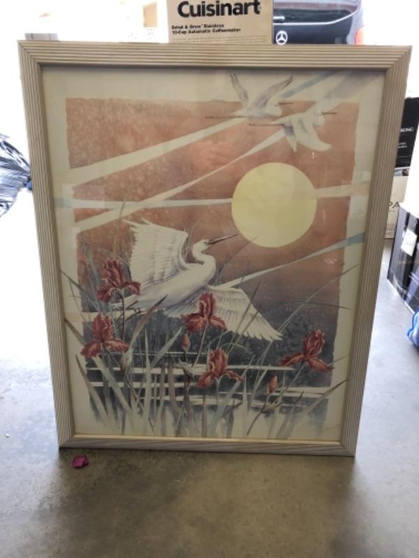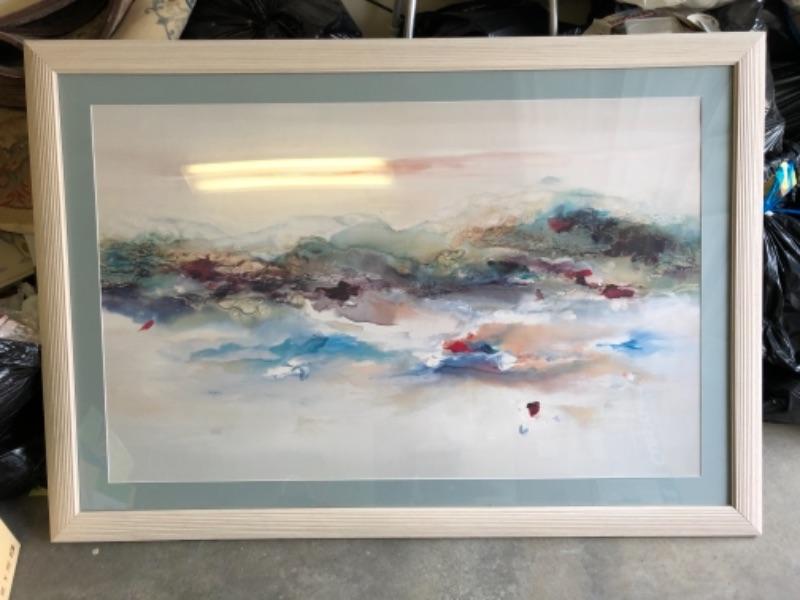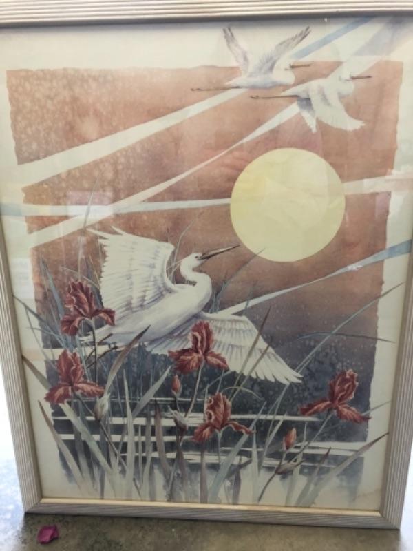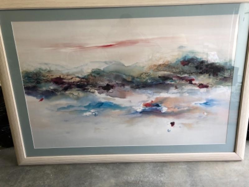 Lot 85. Large abstract print (33.5” x 53”); frame: 65.5” x 45”; pastels and print of birds (frame 24” x 31”)--WAS $35““NOW $26.25