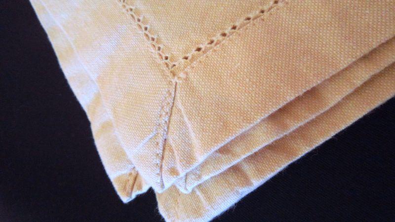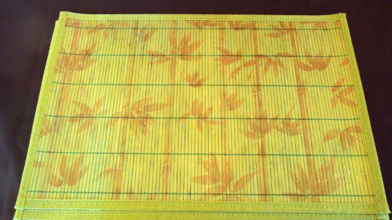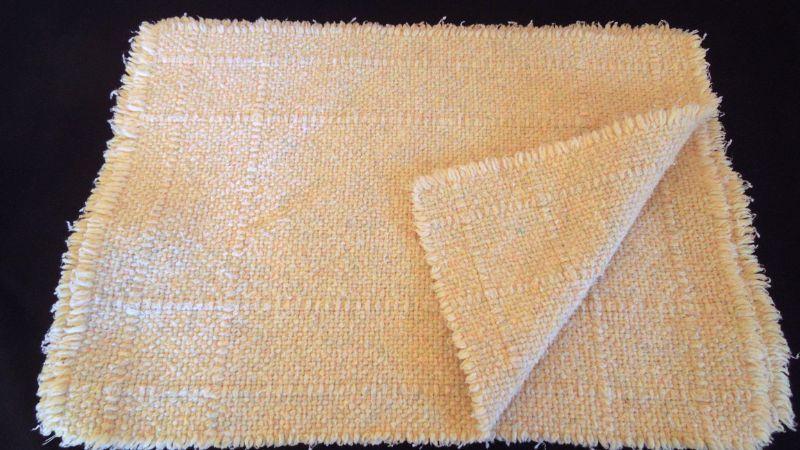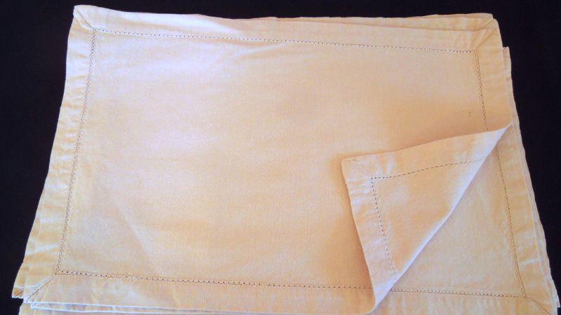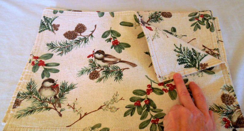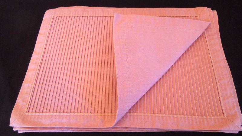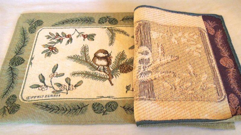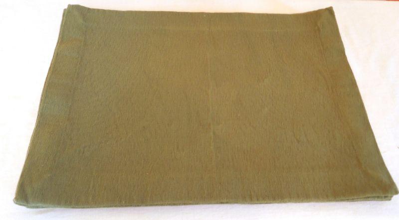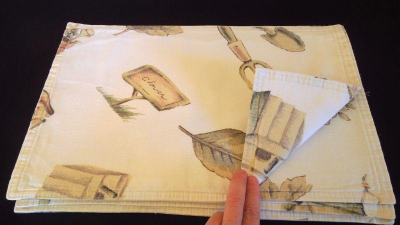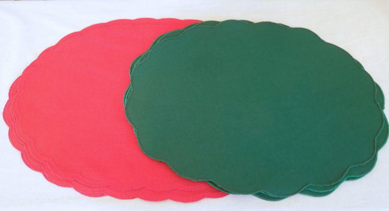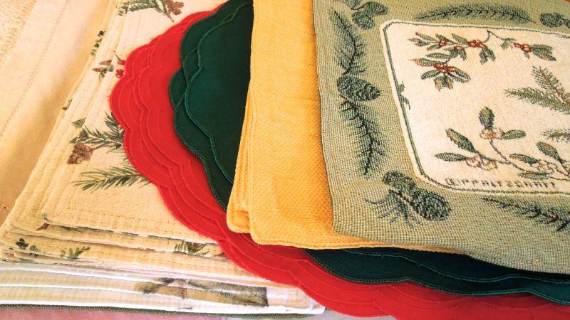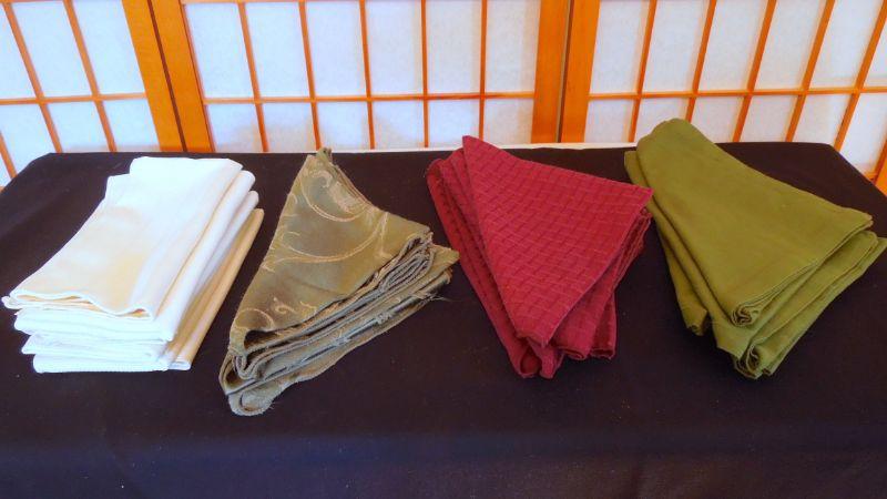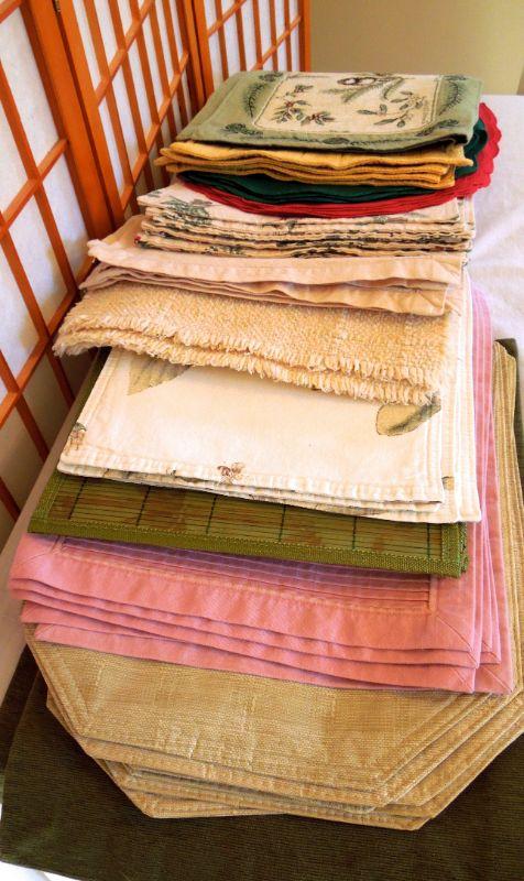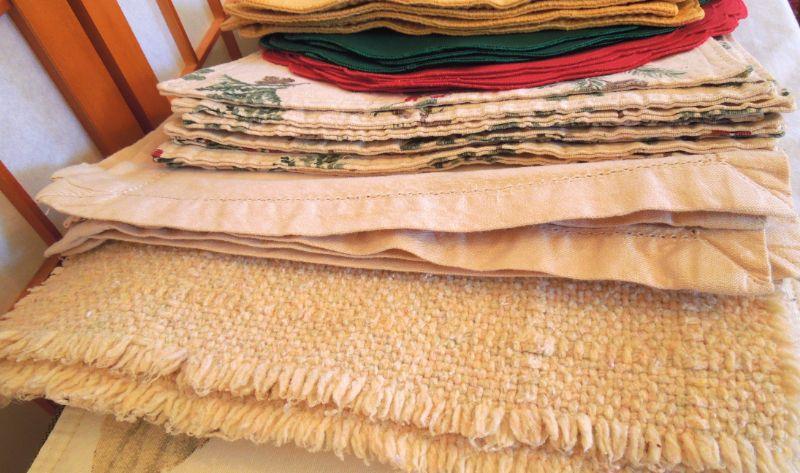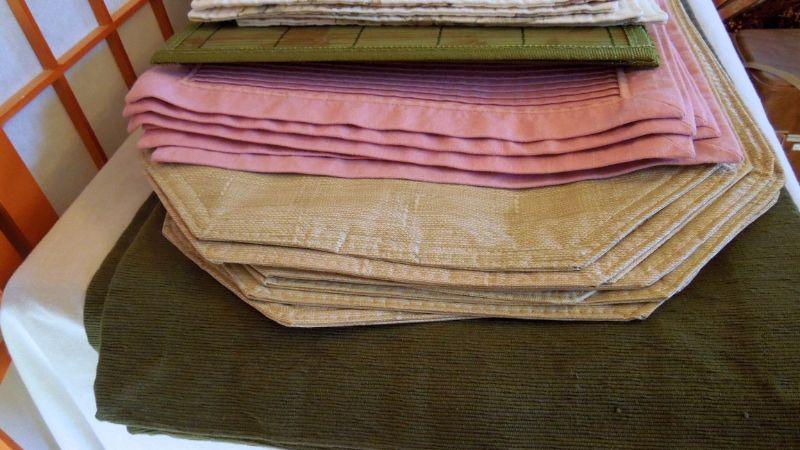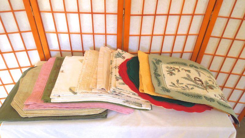 6 fern green cloth placemats; 2 Pfaltzgraff Chickadee; 4 Corn Yellow Linen; 4 red scallop edge cloth; 4 green scallop edge cloth; 8 linen chickadee; 6 ecru cotton; e ecru woven; 4 painted bamboo green; 6 dusty rose cotton pleated; 6 tan plastic woven look. Group of napkins : 7 matching poly ecru napkins;m4 olive poly napkins; 6 wine colored poly napkins and 6 matching fern green cotton napkins.