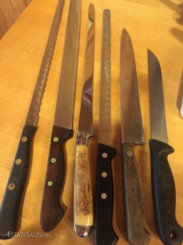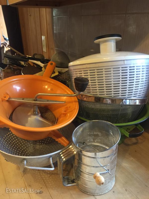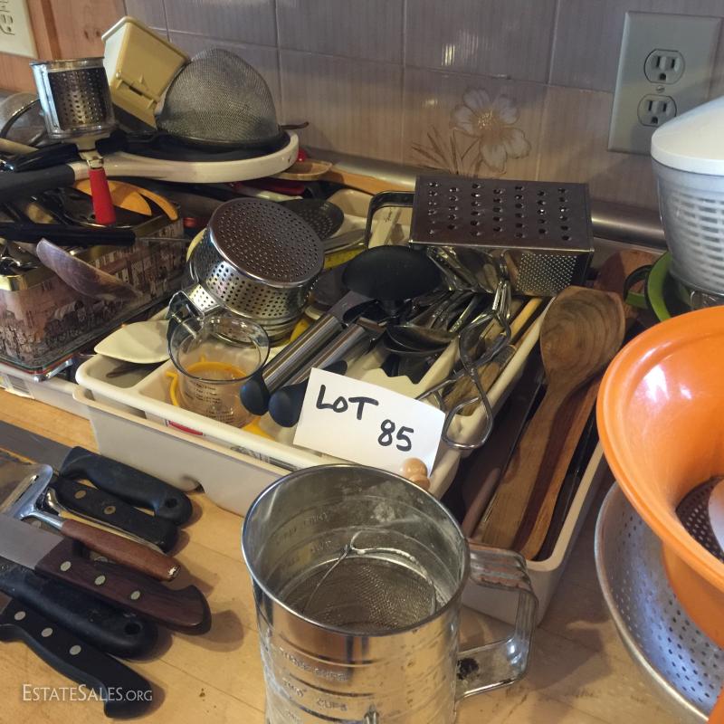 Large selection of kitchen utensils. Strainers, measuring pieces, knives, wooden spoons, graters, and much much more.