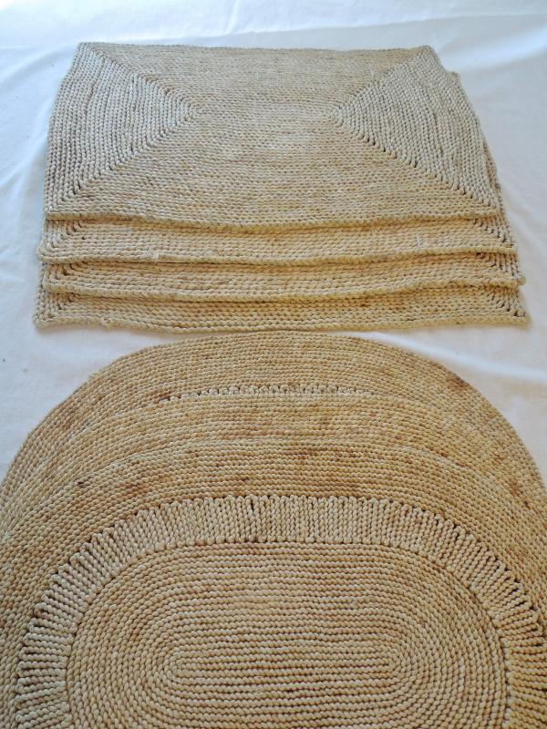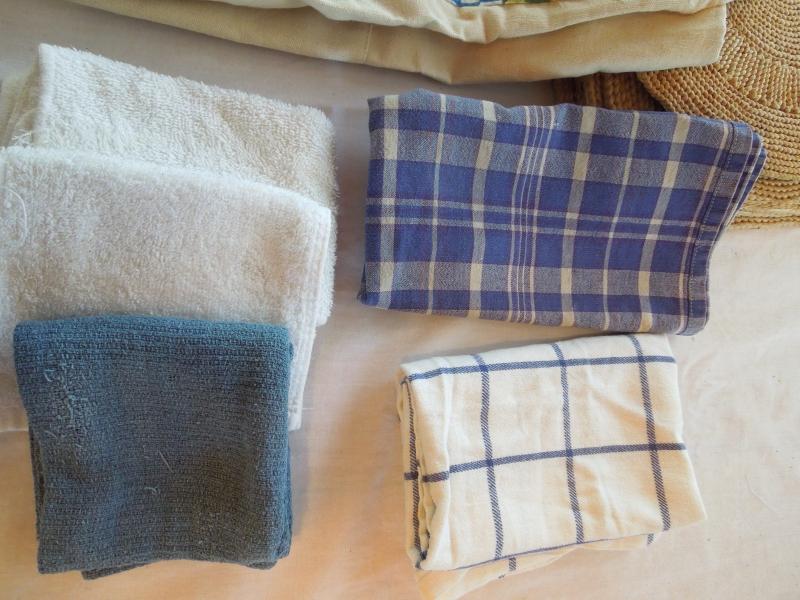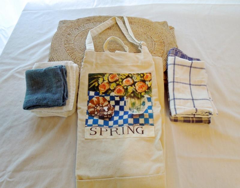 7 rattan woven placemats; 1 new canvas print apron; 2 cotton dish towels (plus 2 more not in photo); 3 terry cloth squares.