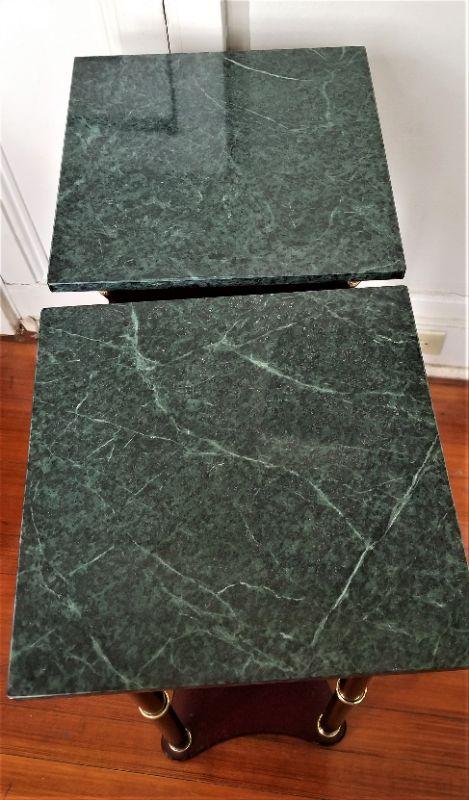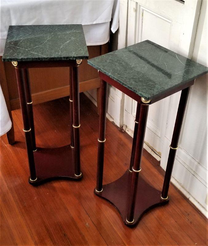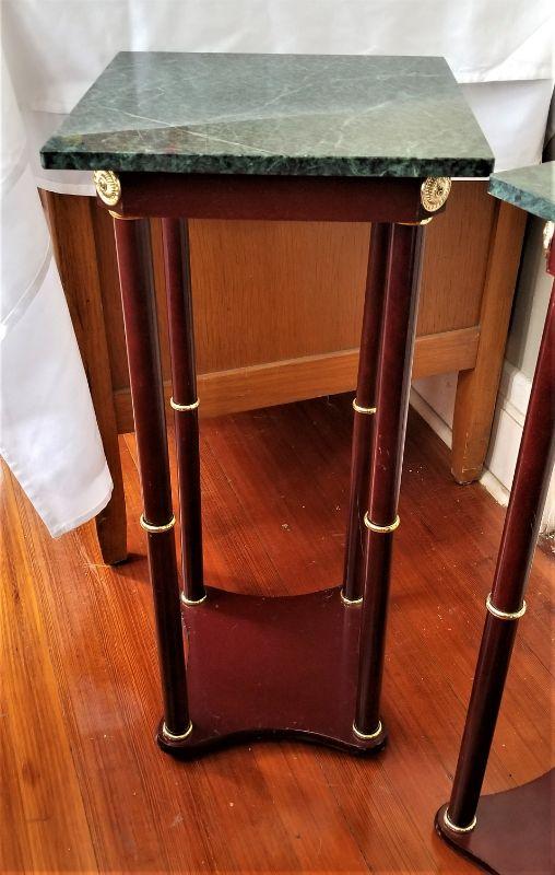 Modern pair of marble top tables, done in the antique style. A few minor dings - marble in good condition. Each measures 12" x 12" x 27" tall. Used condition