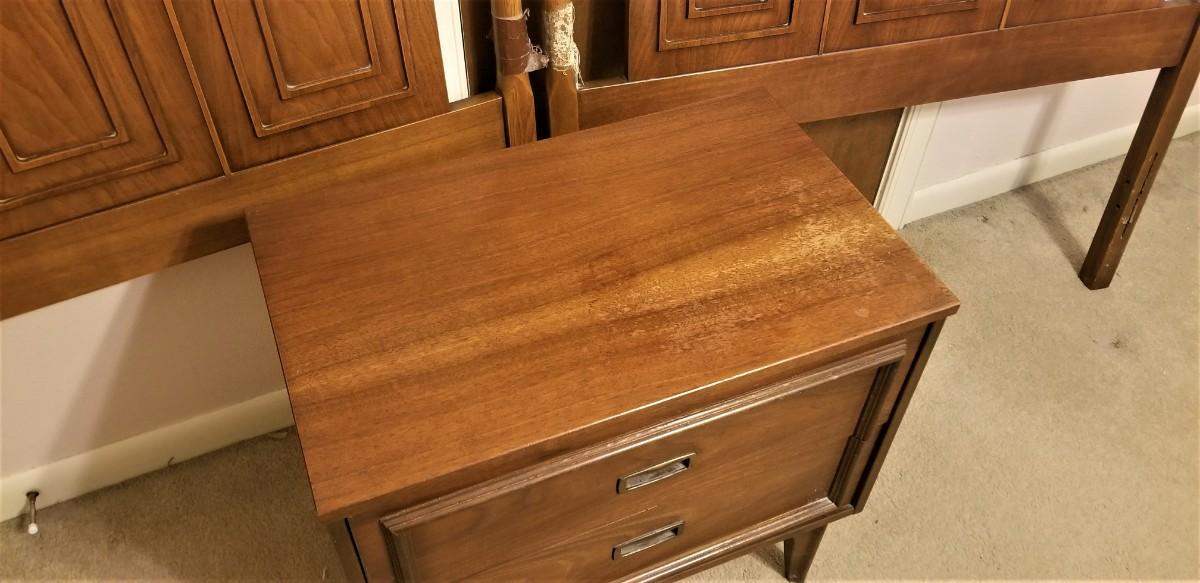 These MidCentury pieces match the dresser in Lot #82 - pair of twin headboards (40" across, 39" tall) - note the duct tape that was wrapped around to hold the headboards together - and a matching nightstand (15" deep, 24" across). Vintage condition - Broyhill.
