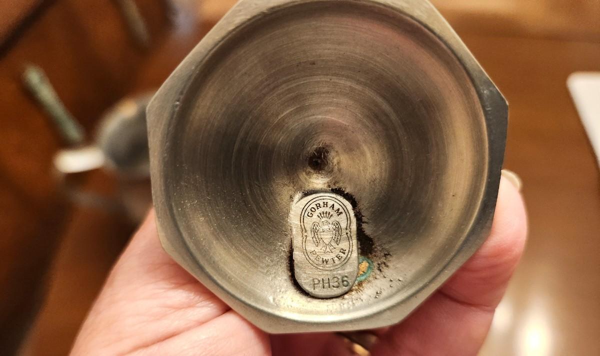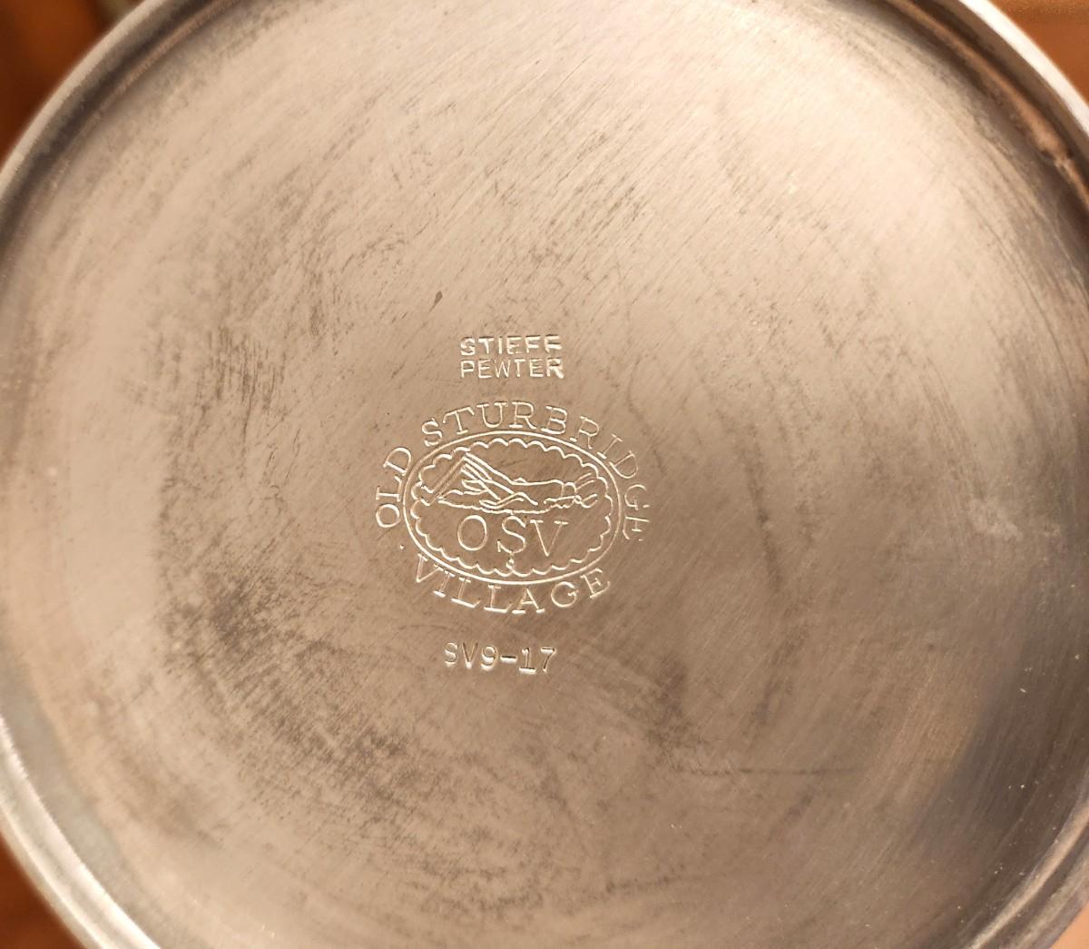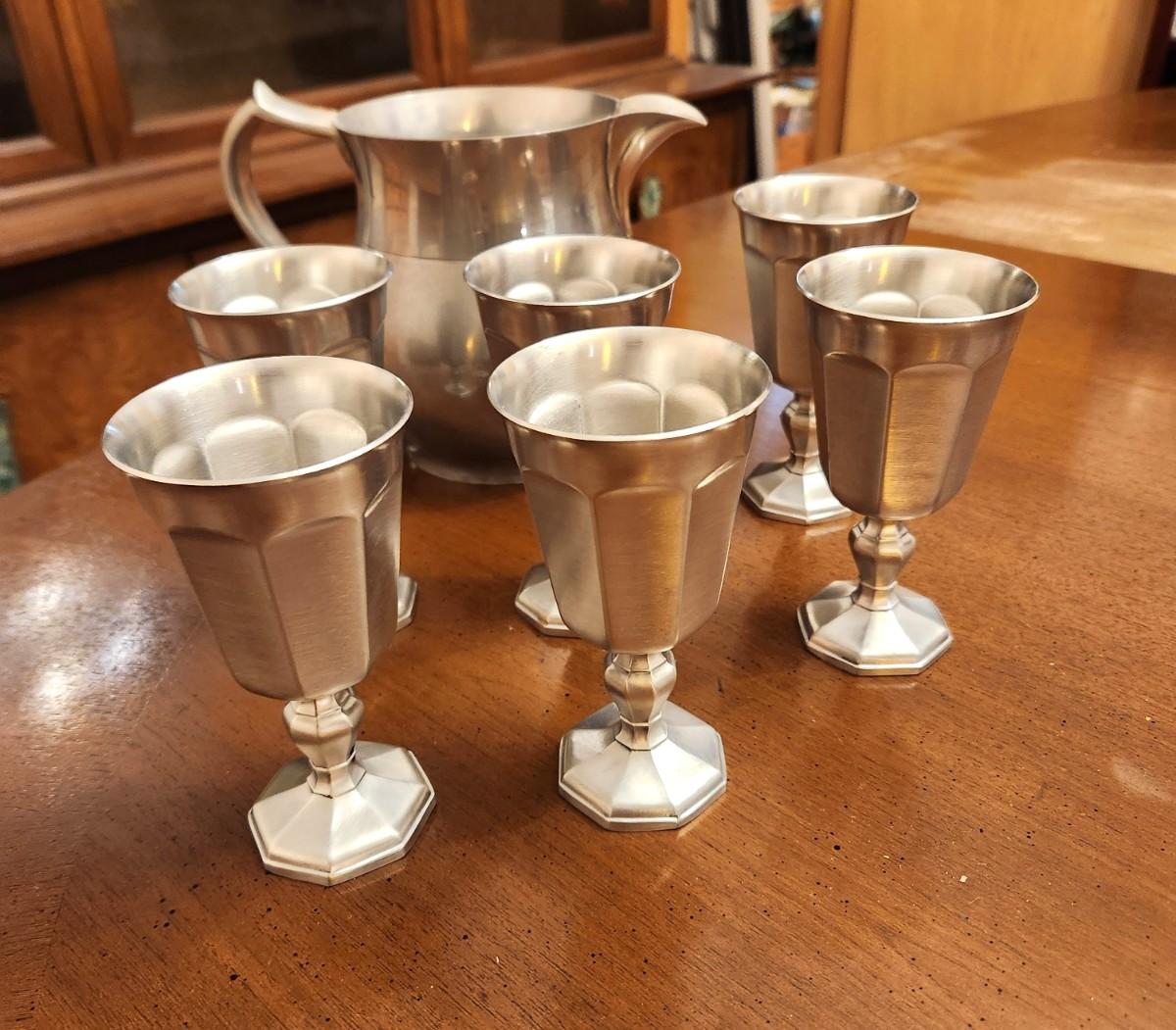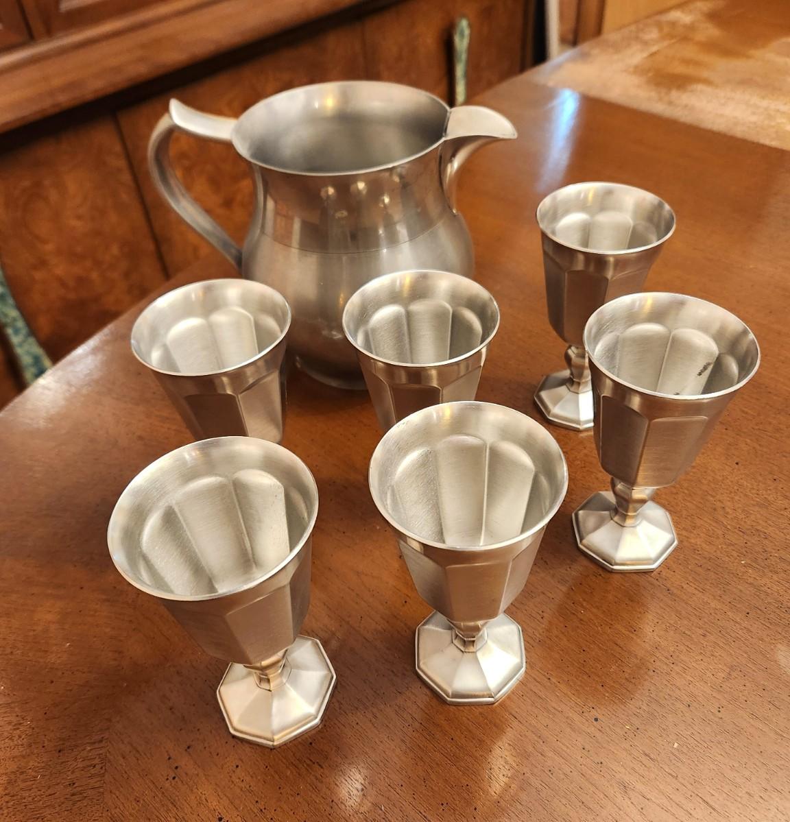 Steiff (Old Sturbridge Village) pewter jug/pitcher - 6" tall - will lot of 6 Gorham Pewter Goblets 5" tall. All look good.