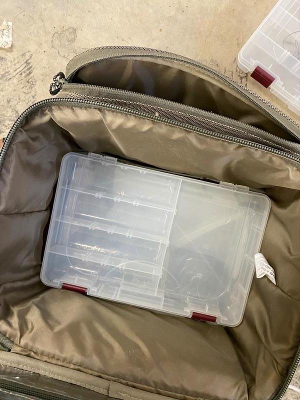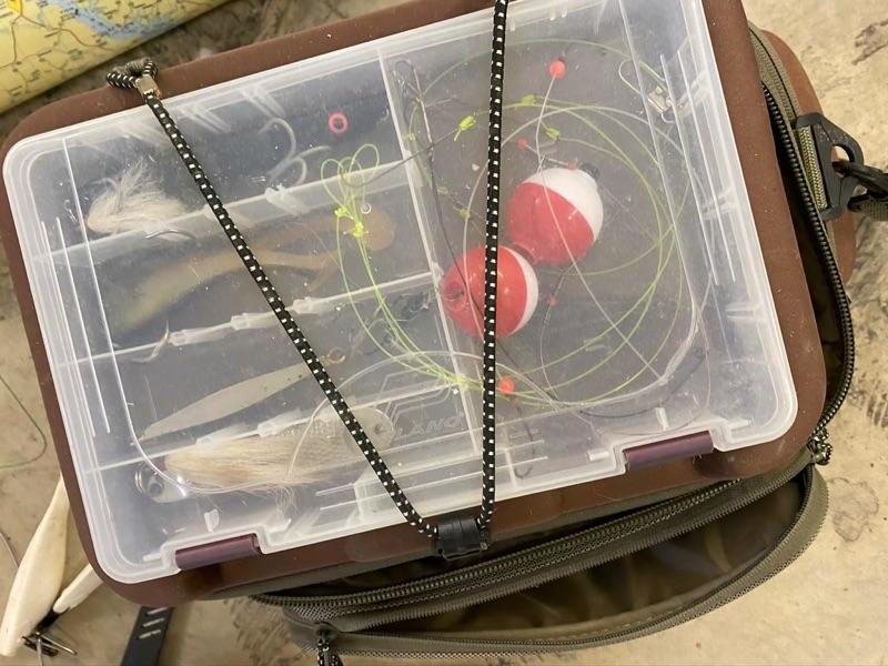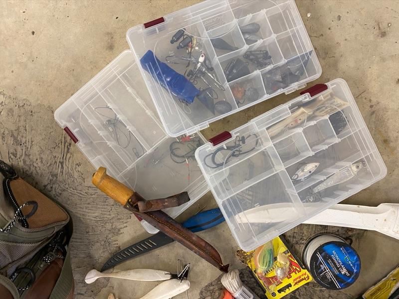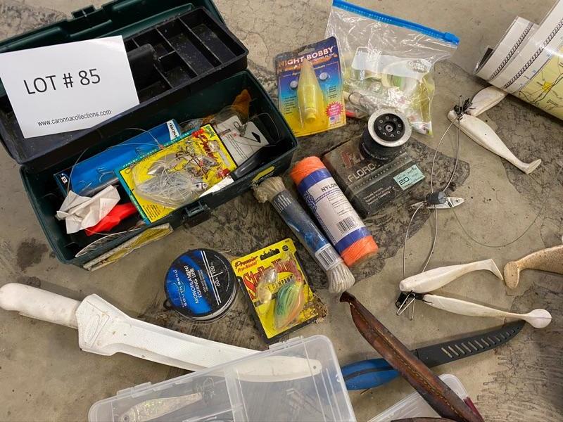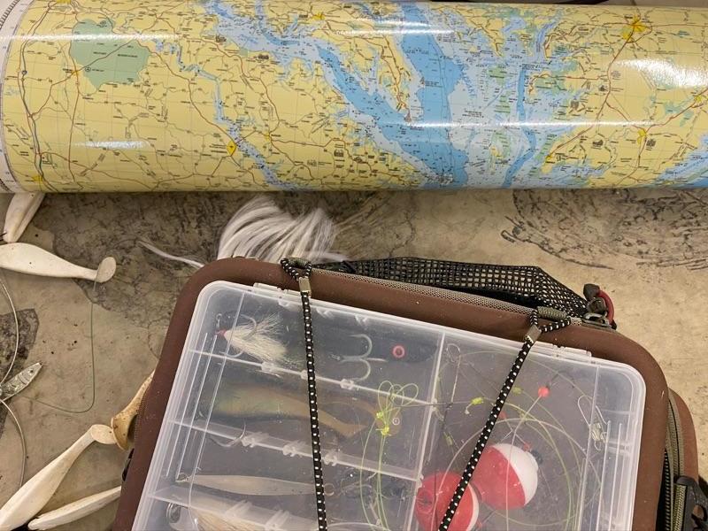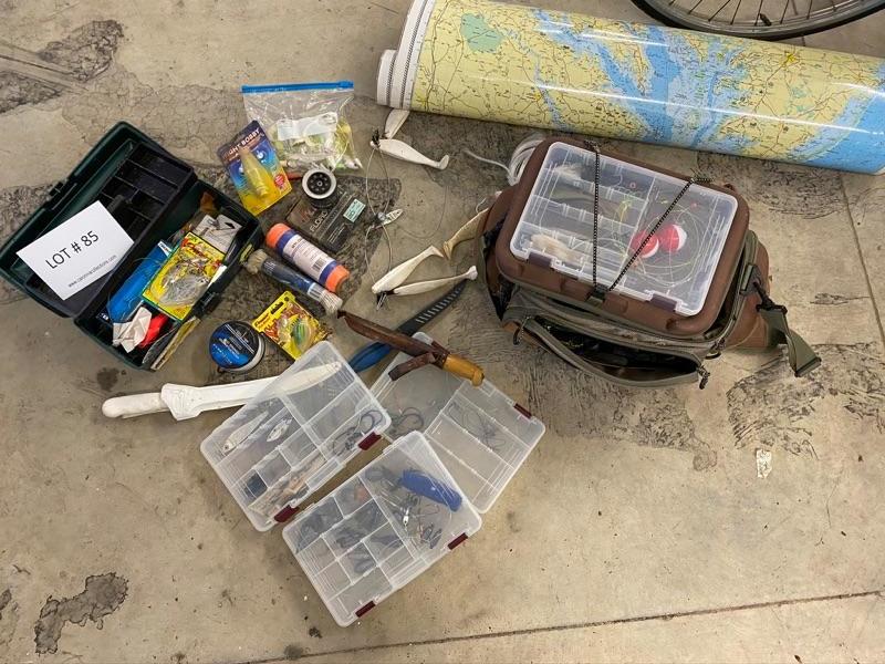 Tackle Box with laminated Chesapeake bay map, fishing line, Reels, knives and lures