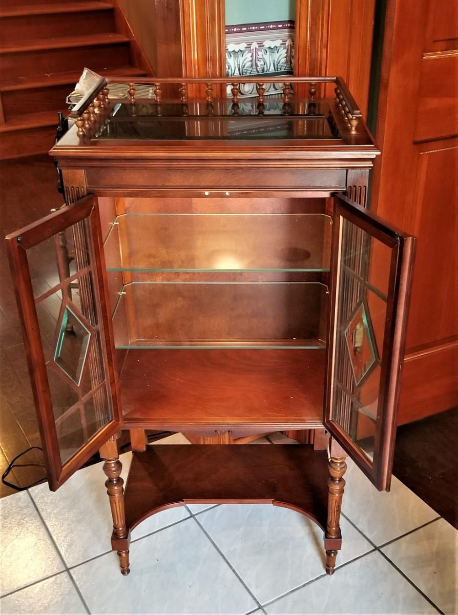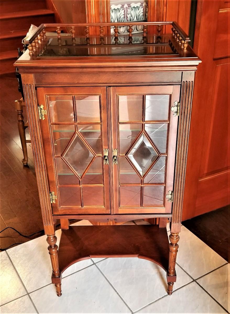 This little beauty was made by the Bombay Company - lighted display, perfect for small collectibles. Beveled glass doors - gallery on top. Adjustable glass shelves. 20.5" across, 14.5" deep, 39.5" tall. You'll love it.