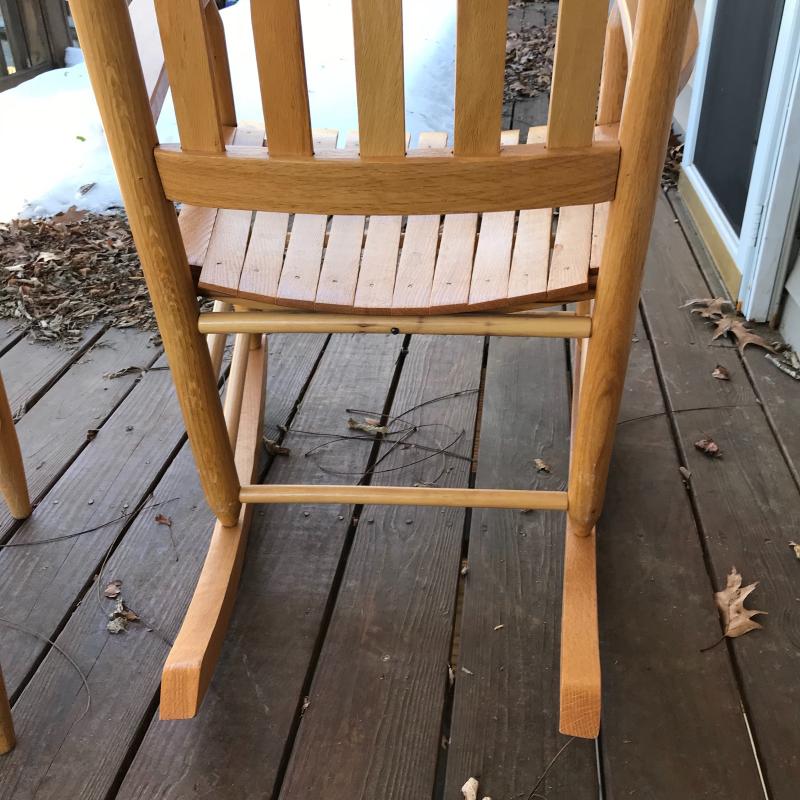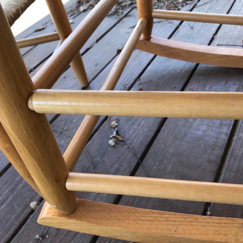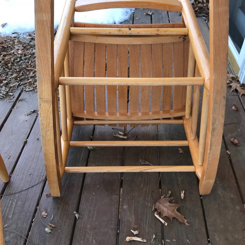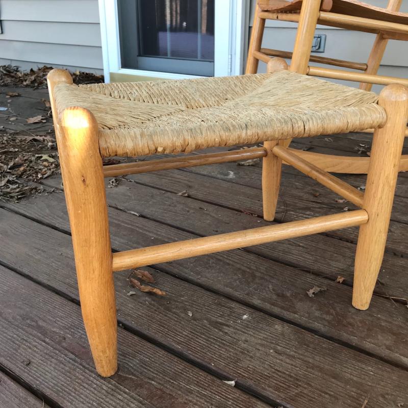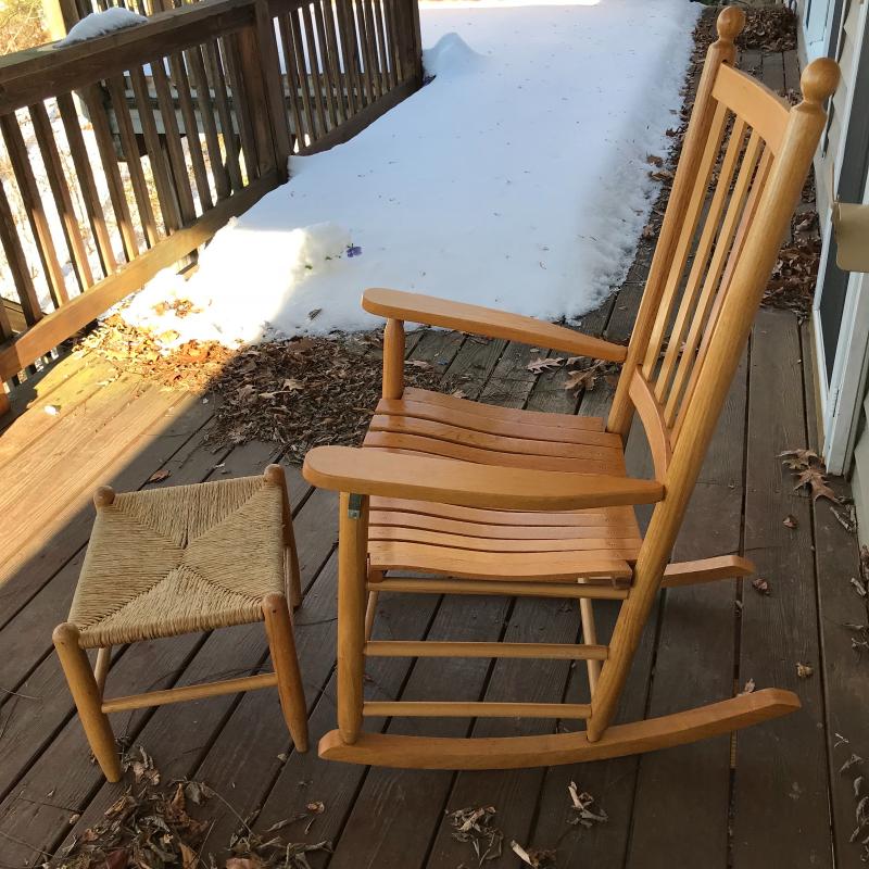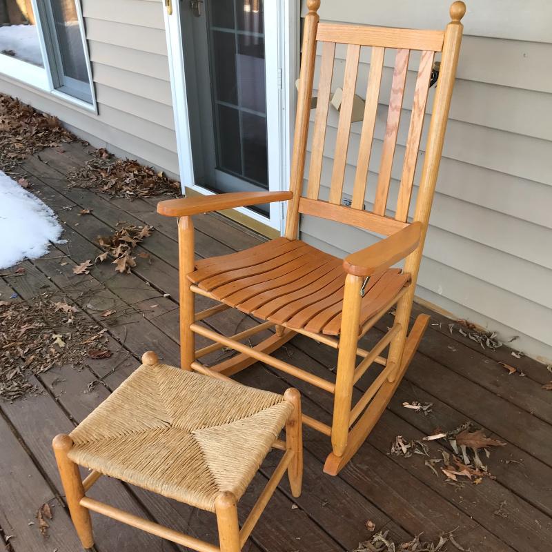This sturdy wooden rocking chair is in great shape and would work well on a porch or in front of the hearth. 25.5”l x 21”w x 43.5” h. Rockers are 31” long. Lot includes rattan-top footstool, which is also sturdy and in good shape. 17”l x 14”w x 13”h.