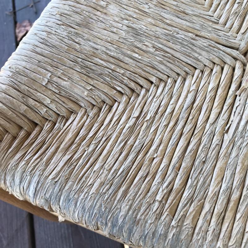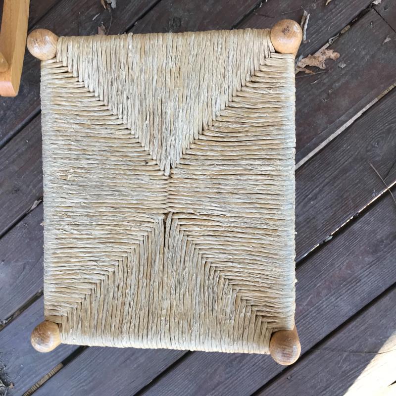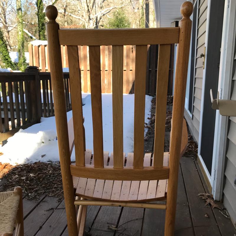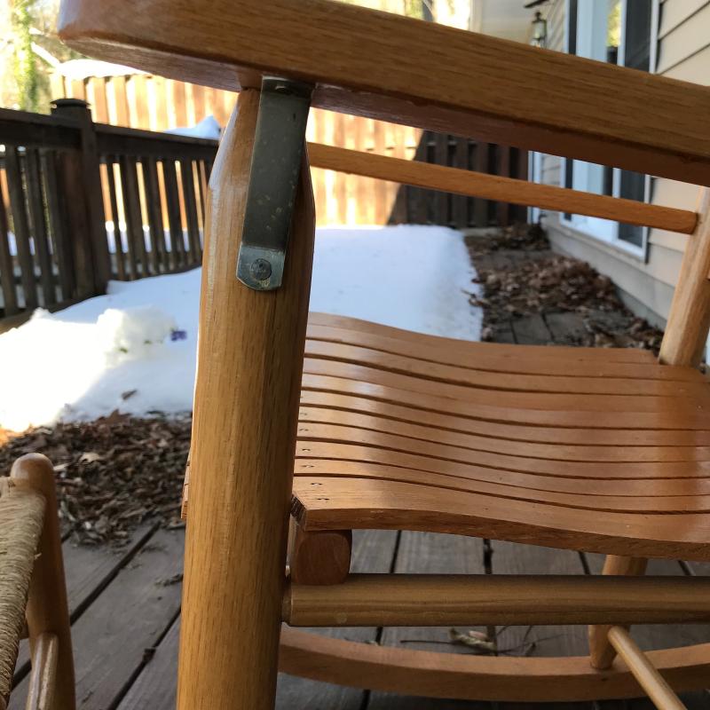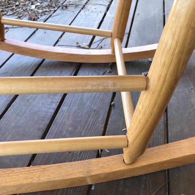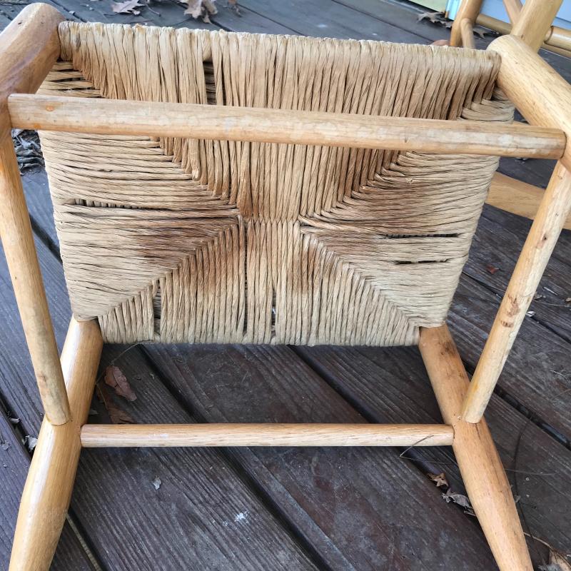 This sturdy wooden rocking chair is in great shape and would work well on a porch or in front of the hearth. 25.5”l x 21”w x 43.5” h. Rockers are 31” long. Lot includes rattan-top footstool, which is also sturdy and in good shape. 17”l x 14”w x 13”h.