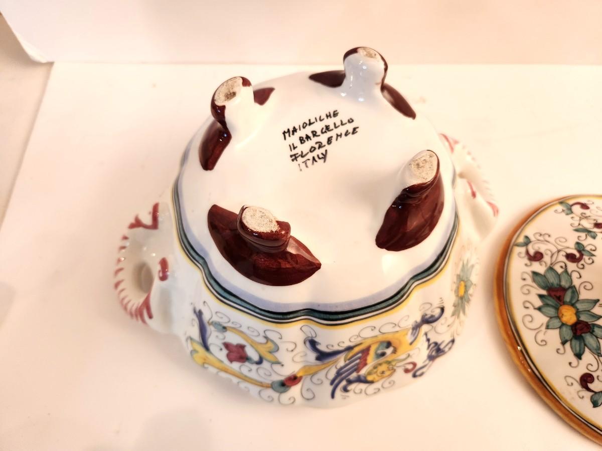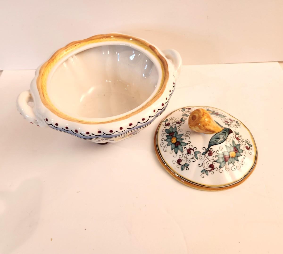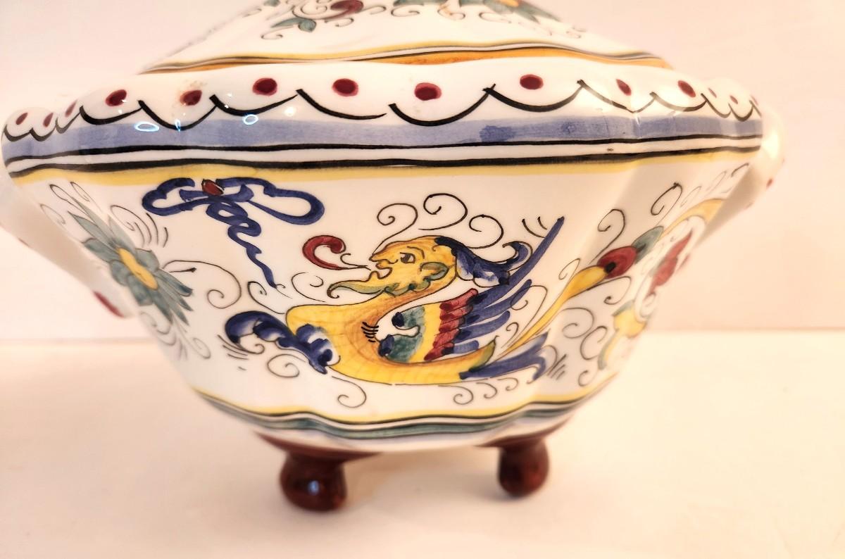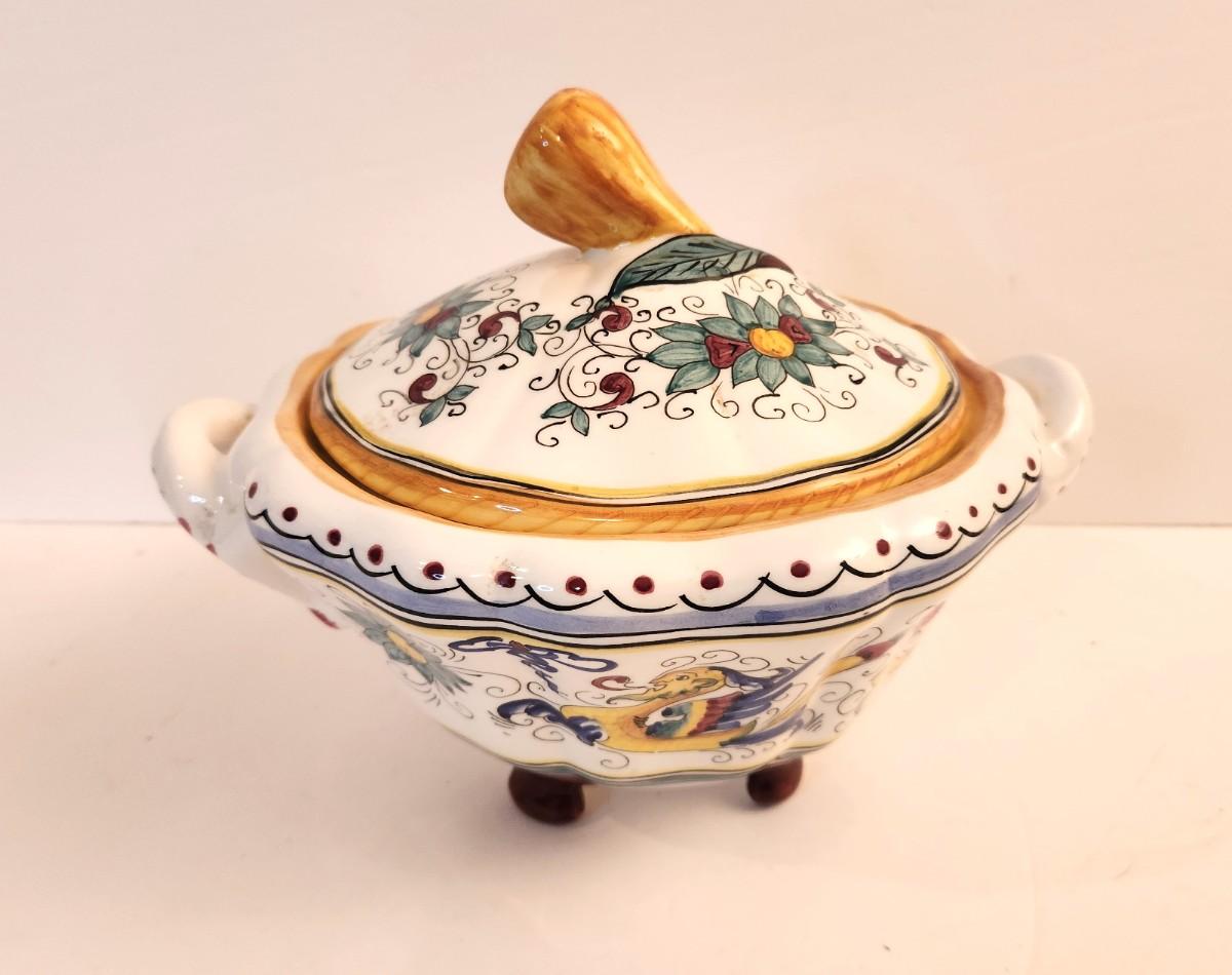 Italian Pottery, Ruffaellesco Designs (features a Griffin) Bargello Footed Serving Bowl - fig shaped lid handle, hand decorated, 8.5" tall, 11" across handle to handle. Good condition.