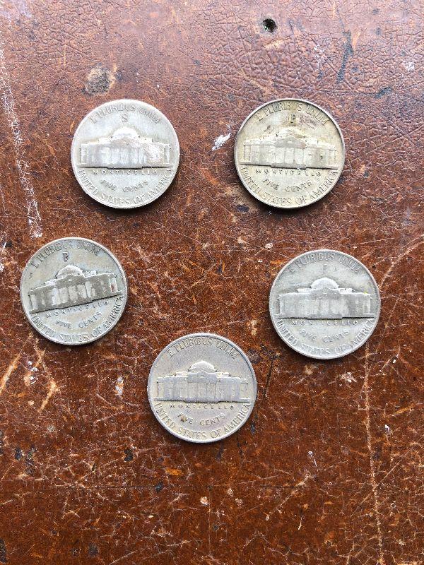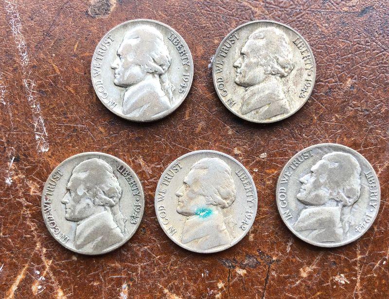 5 Wartime nickles, 35% silver content, circulated. $3.95 Shipping in the US, $1 additional for each coin, currency, stamp or jewelry lot.