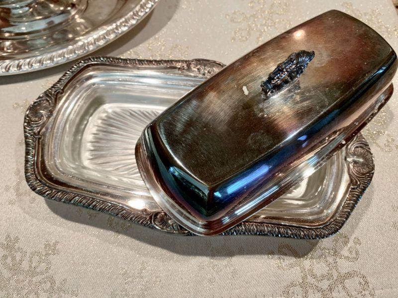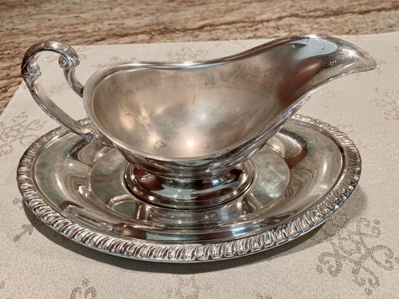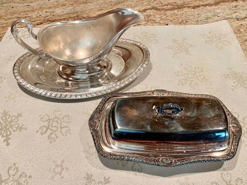 Vintage classic serving pieces. Silver plate gravy/sauce boat w/under plate and a silver plate covered butter dish w/glass liner.