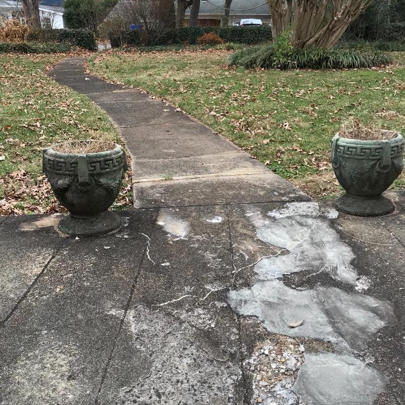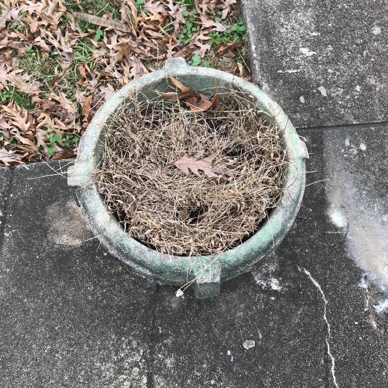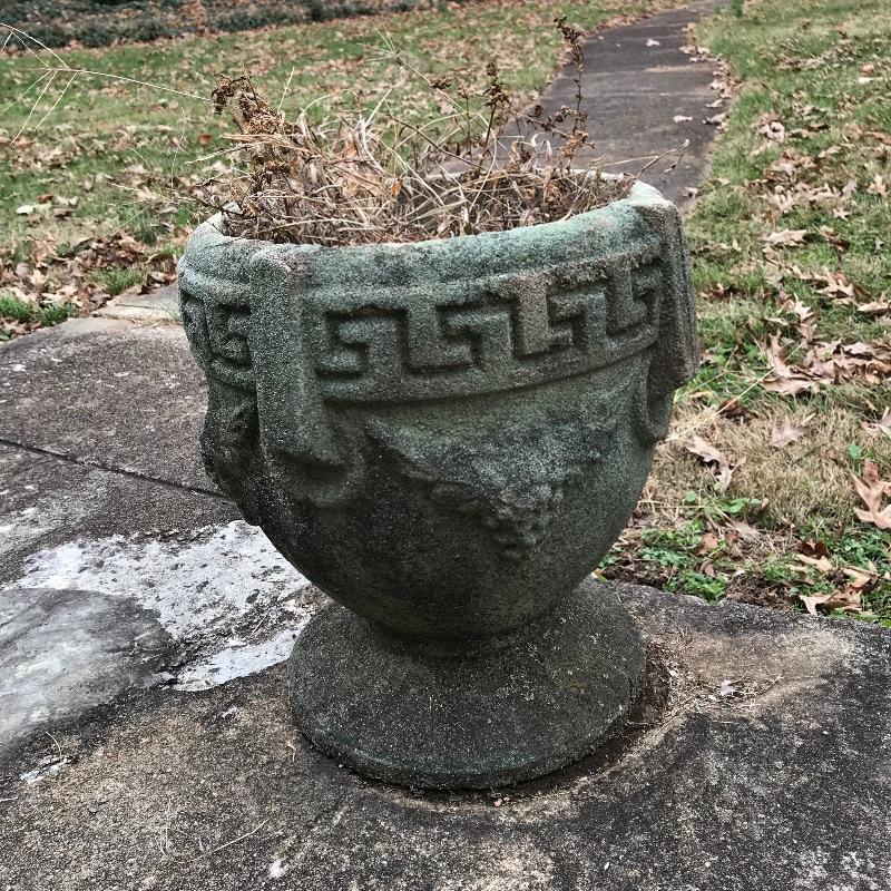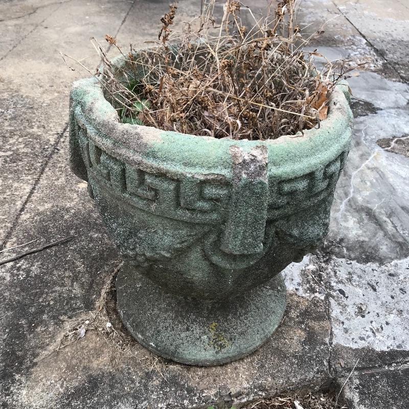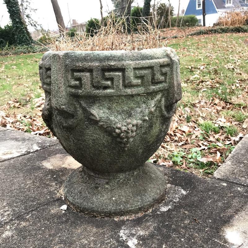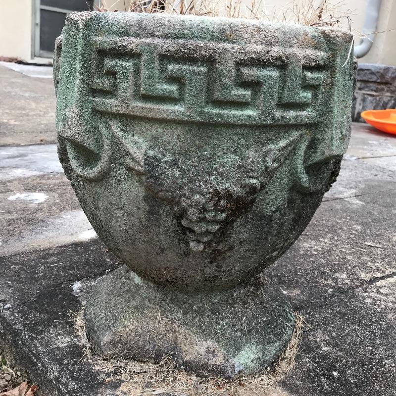 Elegant matching pair of outdoor stone Grecian planters to add grace to your space. Both have some chips, one large chip in base of first planter in photos doesn’t compromise stability. Keep as is for a sea foam green hue addition or possibly pressure wash back to its original ivory beauty. Each planter measures approximately 15”d x 17.25”. Urns currently have soil that buyer can remove before transporting, it s will be heavy with or without soil. No shipping.