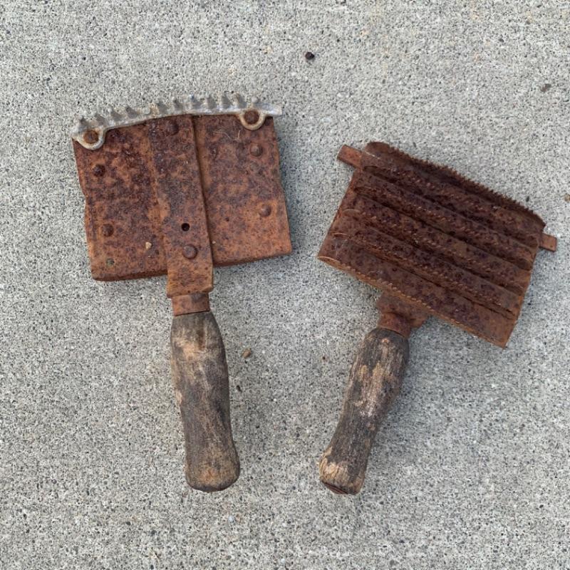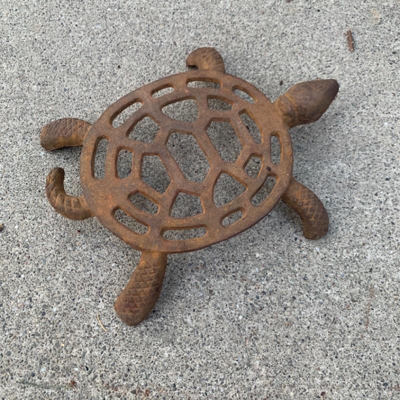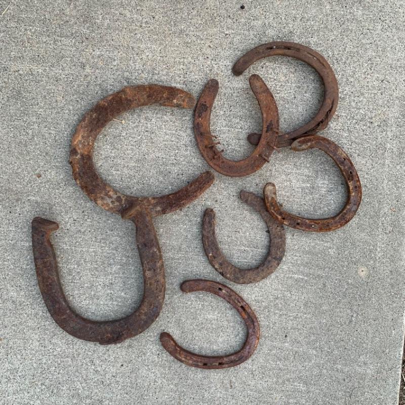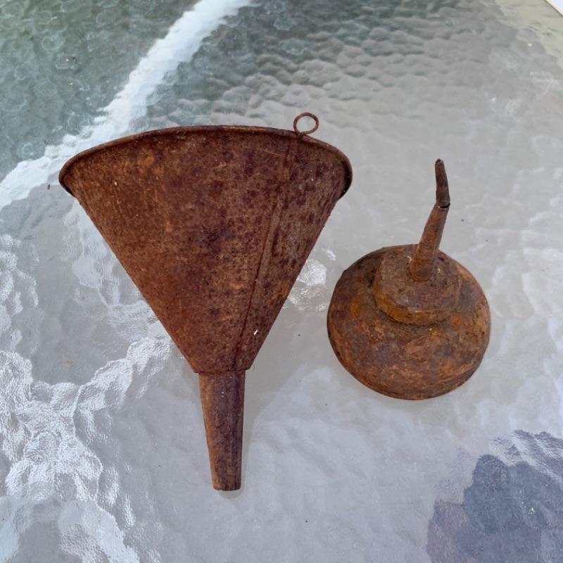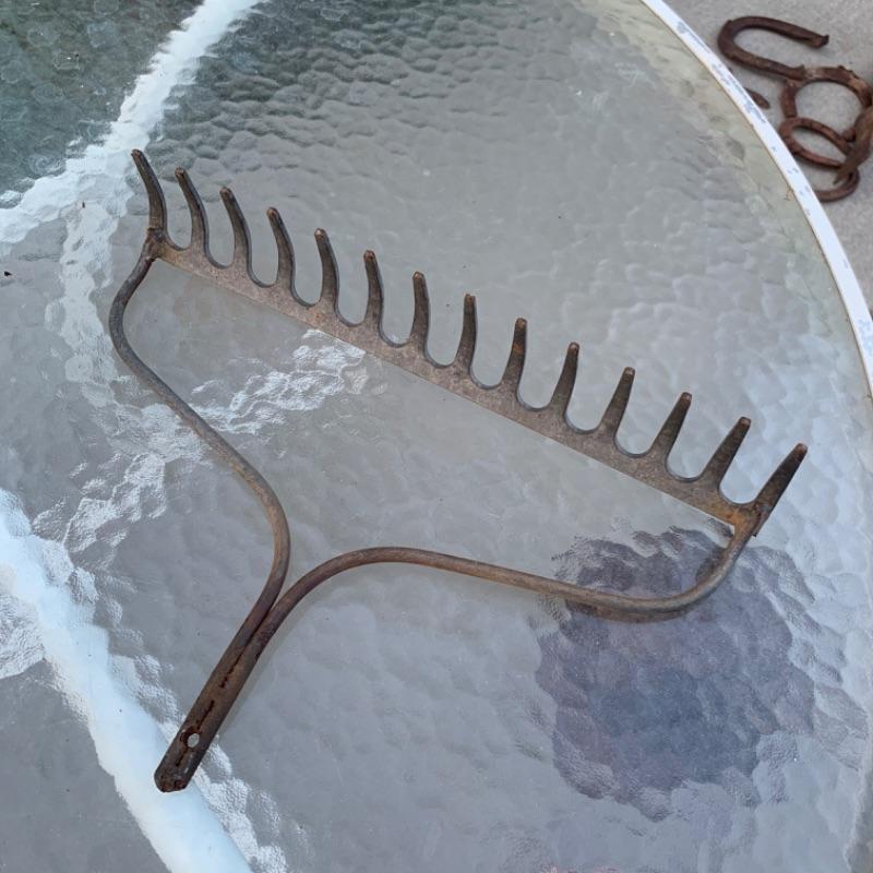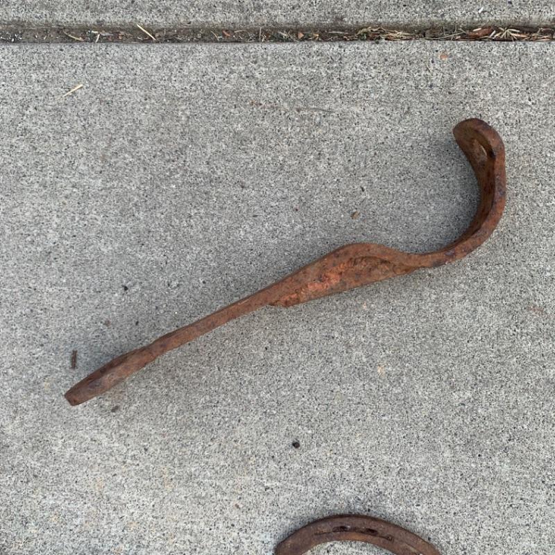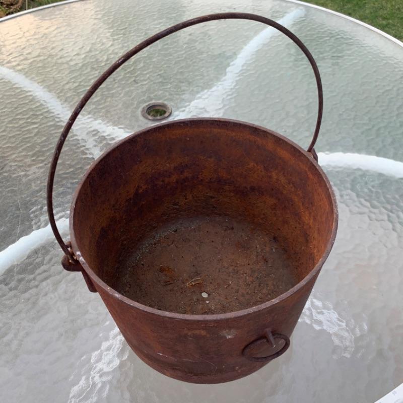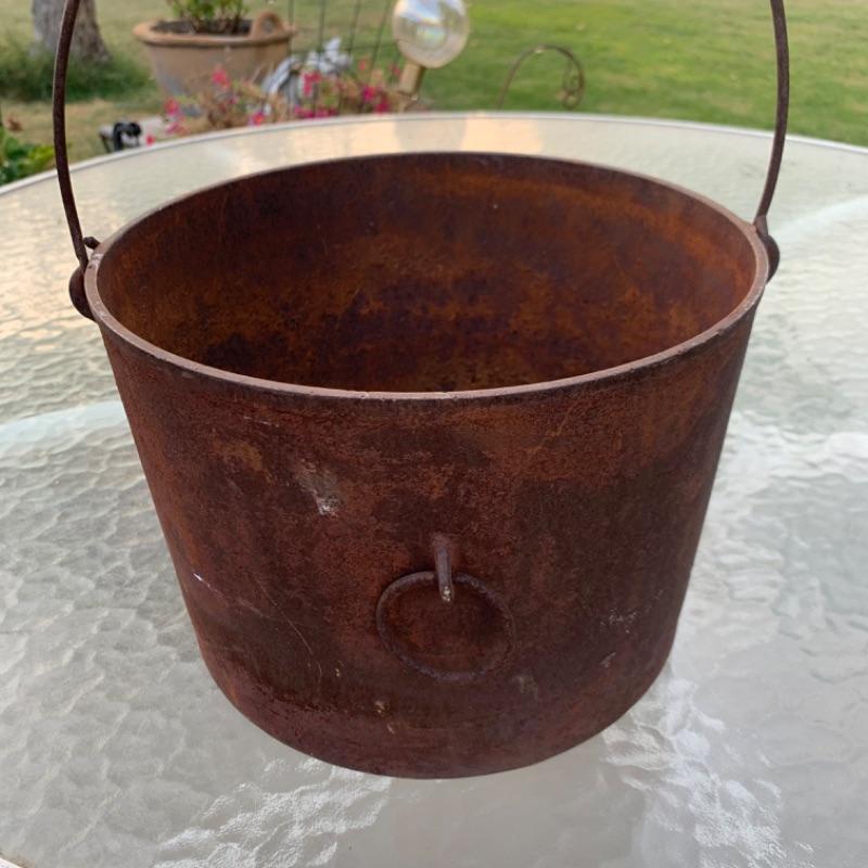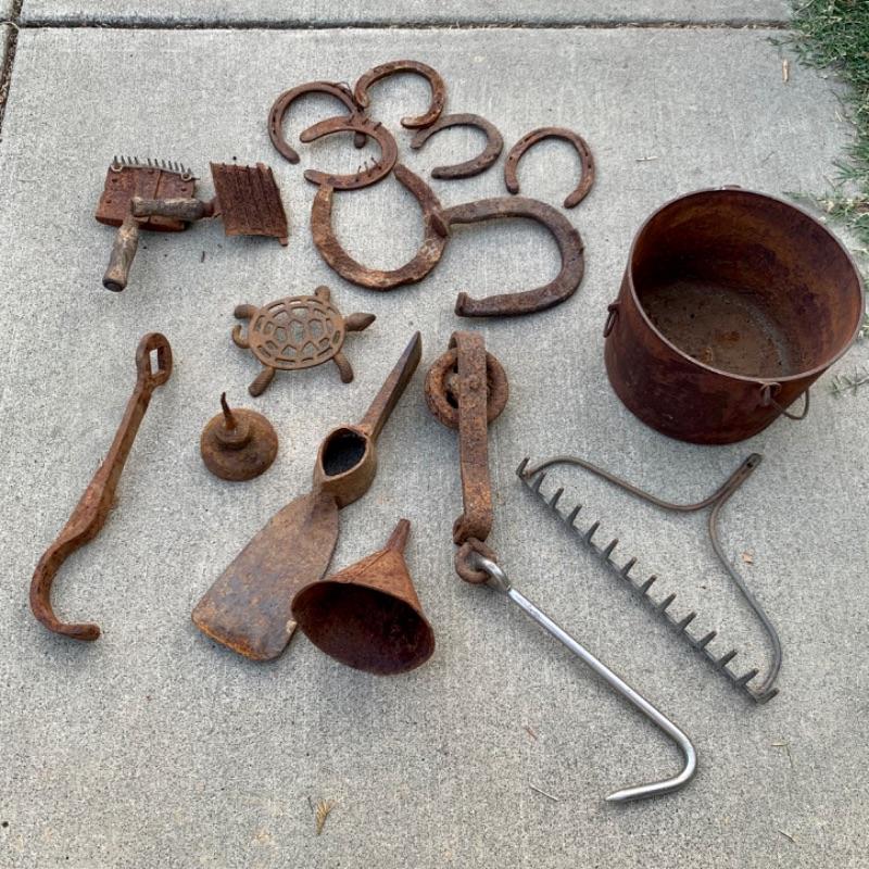 17 pieces of very rusty primitive farm decor. Various tools and stockpot with ring attached to side. Would make a wonderful planter!