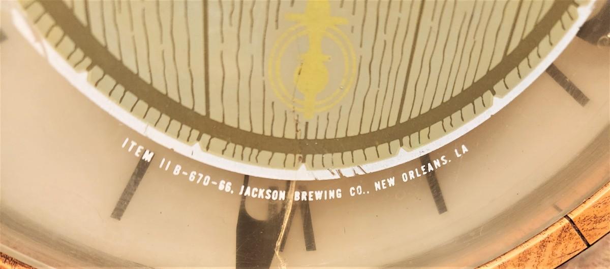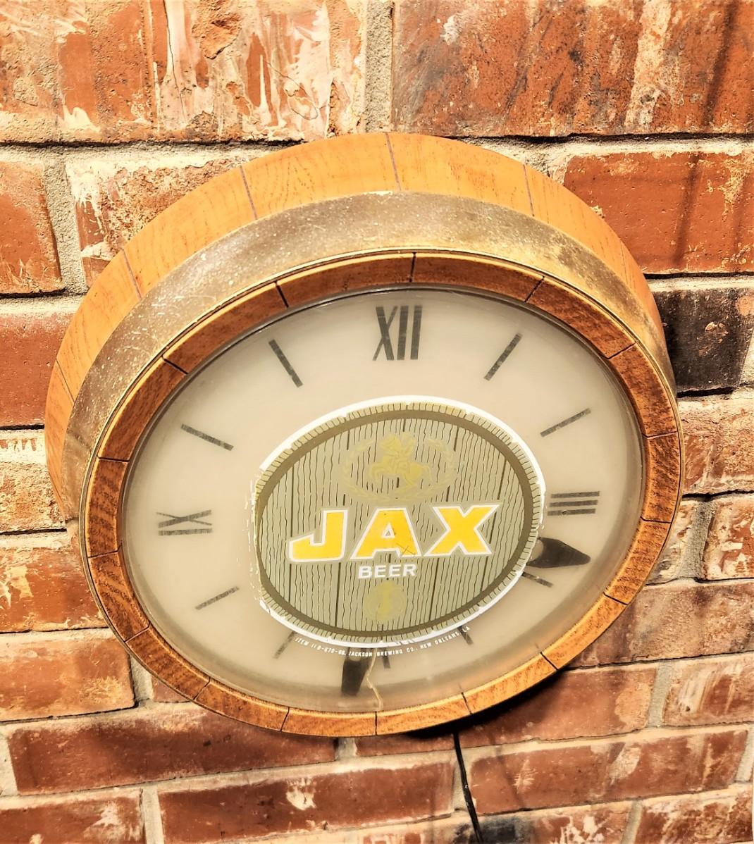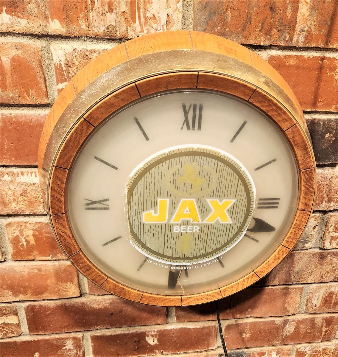 1960's JAX Beer light/clock. This piece runs but does not light up. 15" across, Marked Jackson Brewing Company, 11B670-66. We did not take it apart - bulb may be burnt out. These pieces are scarce in any condition.