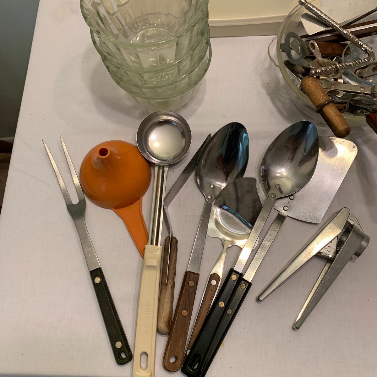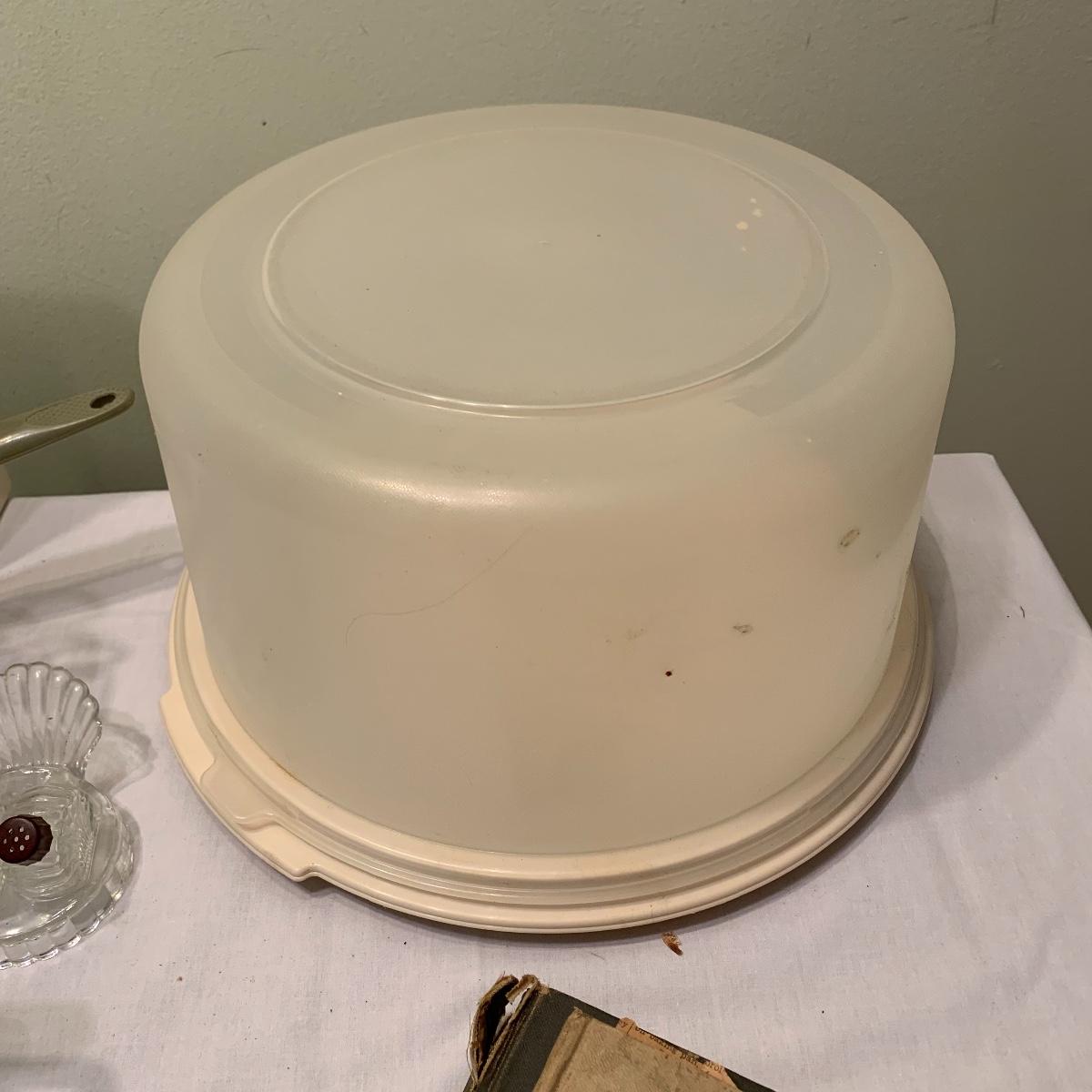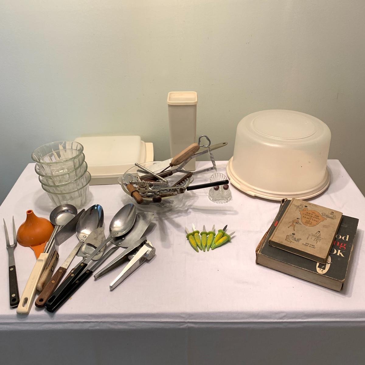 Add to your kitchen collection with this lot of vintage utensils & Tupperware. Included are a set of four matching glass bowls, a cake case, a pie case, a deviled egg carrier, a chip & dip carrier, and a cracker box. Next are assorted utensils of many types. See pics for content. Last are two books, the first is 1955 addition of Good House Keeping, second is a 1929 pressing of The Art Of Cooking and Serving. Local pick up only.