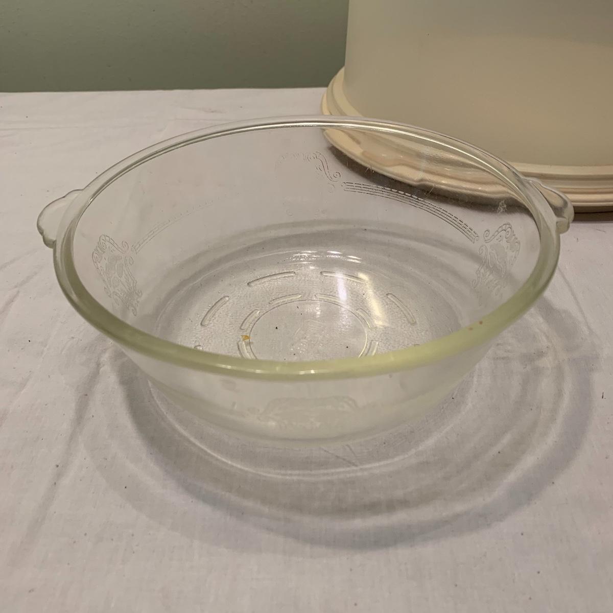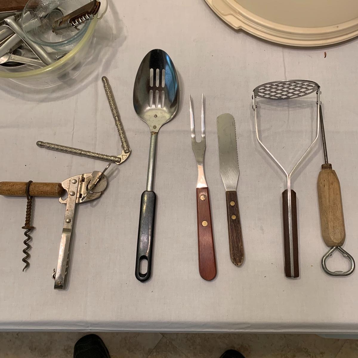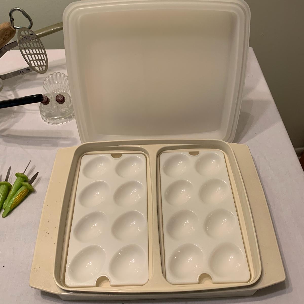 Add to your kitchen collection with this lot of vintage utensils & Tupperware. Included are a set of four matching glass bowls, a cake case, a pie case, a deviled egg carrier, a chip & dip carrier, and a cracker box. Next are assorted utensils of many types. See pics for content. Last are two books, the first is 1955 addition of Good House Keeping, second is a 1929 pressing of The Art Of Cooking and Serving. Local pick up only.