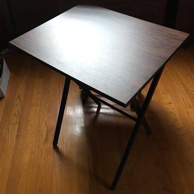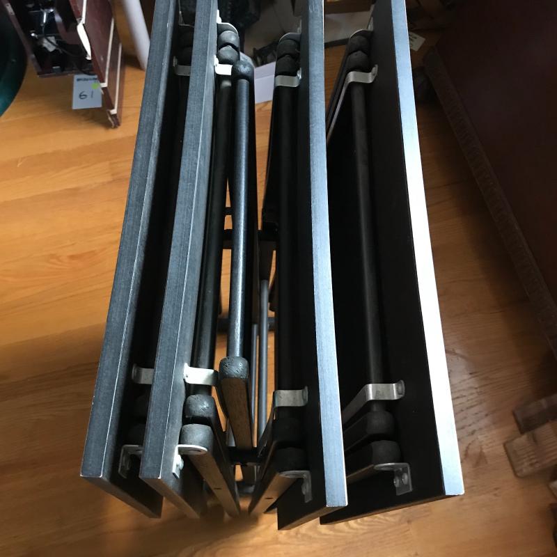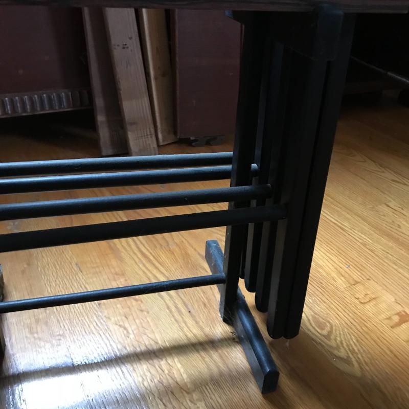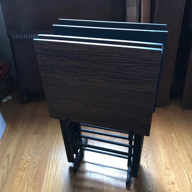 Set of four vintage wood veneer TV trays on stand. No shipping available. Local pickup only in Asheville, NC.